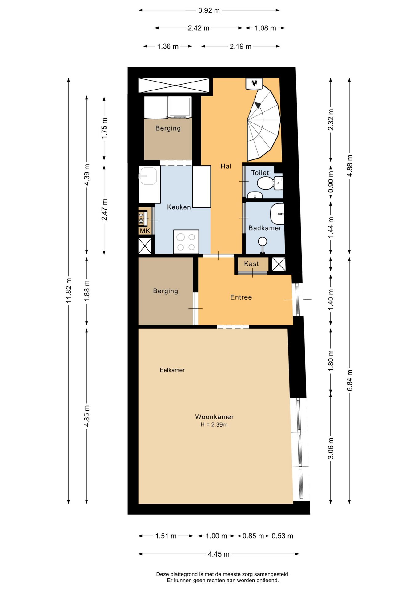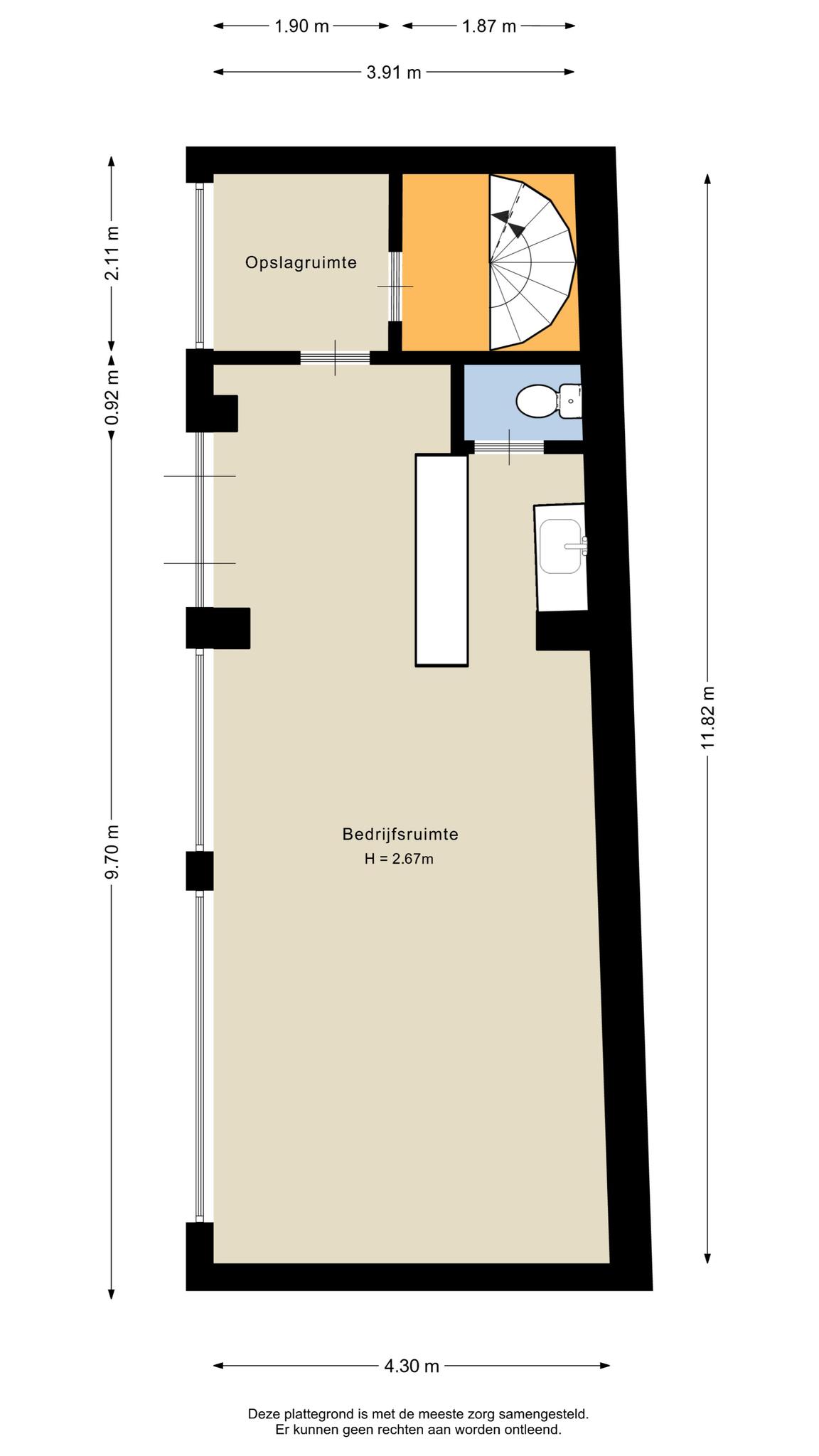 De winkelstraat op D’n Diek geeft via openslaande deuren toegang tot de winkel-/bedrijfsruimte. De grote raampartijen zorgen voor optimale zichtbaarheid en veel lichtinval. De royale ruimte is voorzien van een systeemplafond, een airco en een toilet. Aan de linkerzijde is de opslagruimte toegankelijk. Vanuit de opslagruimte is een hal bereikbaar met wenteltrap naar het souterrain en de eerste verdieping.