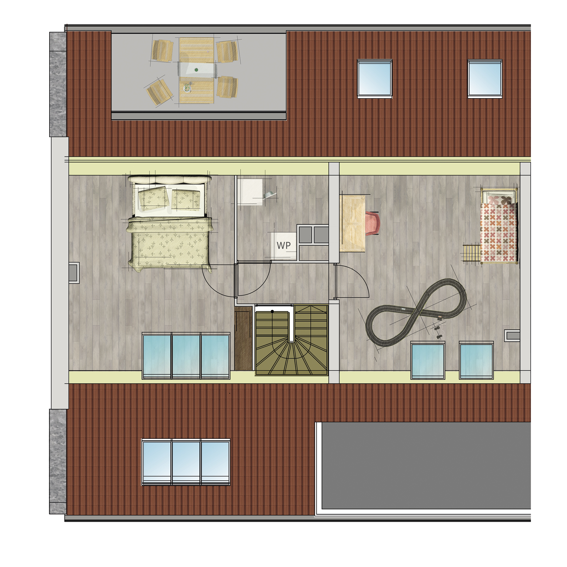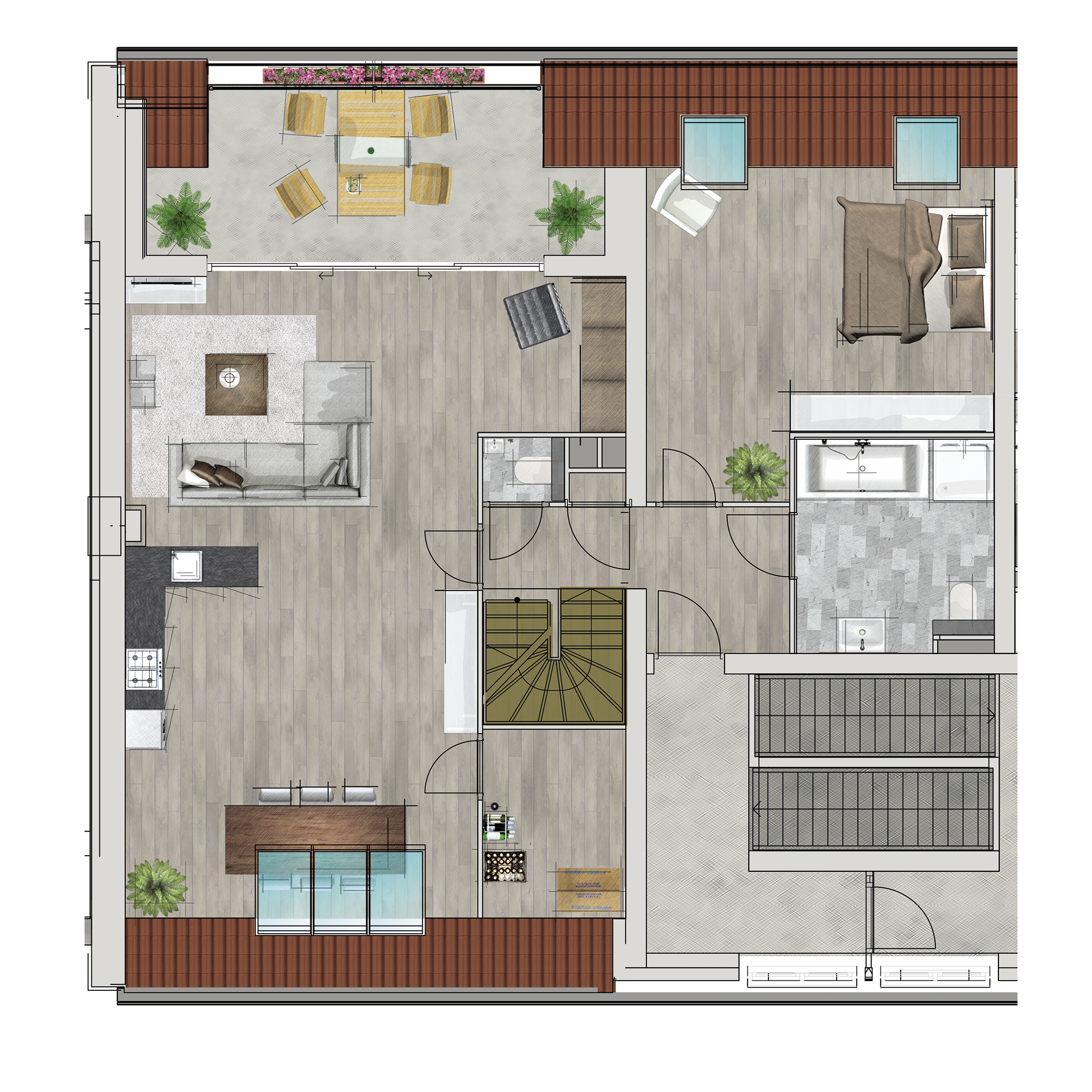 4-kamerappartement Woonoppervlak van ca. 158m2 2-verdiepingen Living van ca. 51,5m2 Loggia van ca.14,5m2 Loggia op het zuiden Badkamer en toilet voorzien van tegelwerk en sanitair Warmtepomp en zonnepanelen Eigen parkeerplaats
