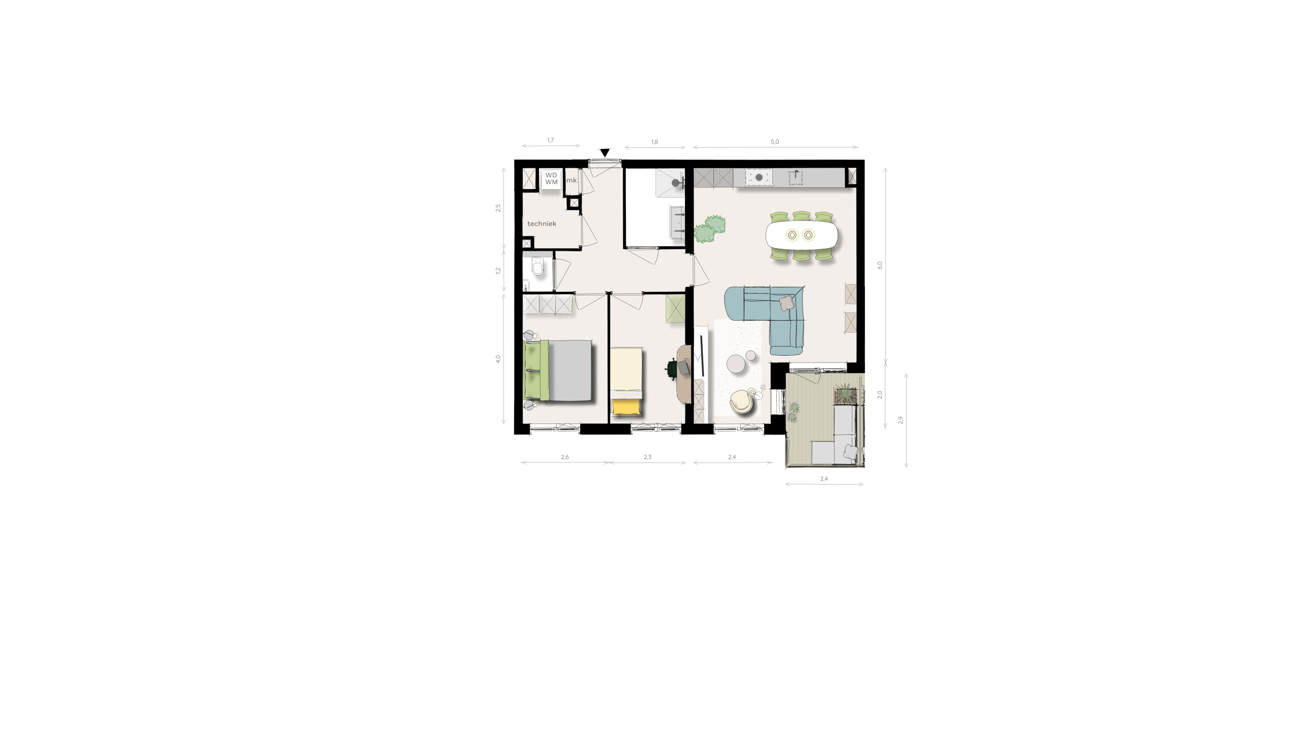 – Privé tuin (24 tot 69m2) of balkon of terras (6 tot 10m2)