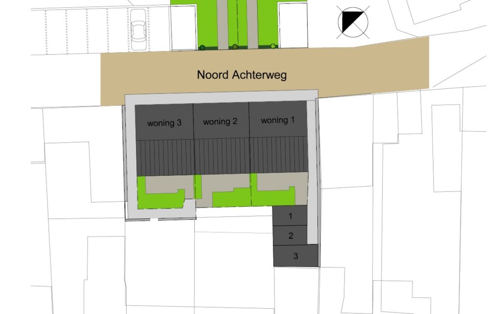 De achtertuin, gelegen op het zuidwesten, is voorzien van een terras en gazon. Elke woning heeft een berging. Woning 1 heeft de berging aansluitend aan de tuin. De berging van de andere twee woningen bevinden zich hier achter. Voor de bewoners van woning 2 en 3 is de berging bereikbaar via het pad aan de linkerzijde van woning 1.