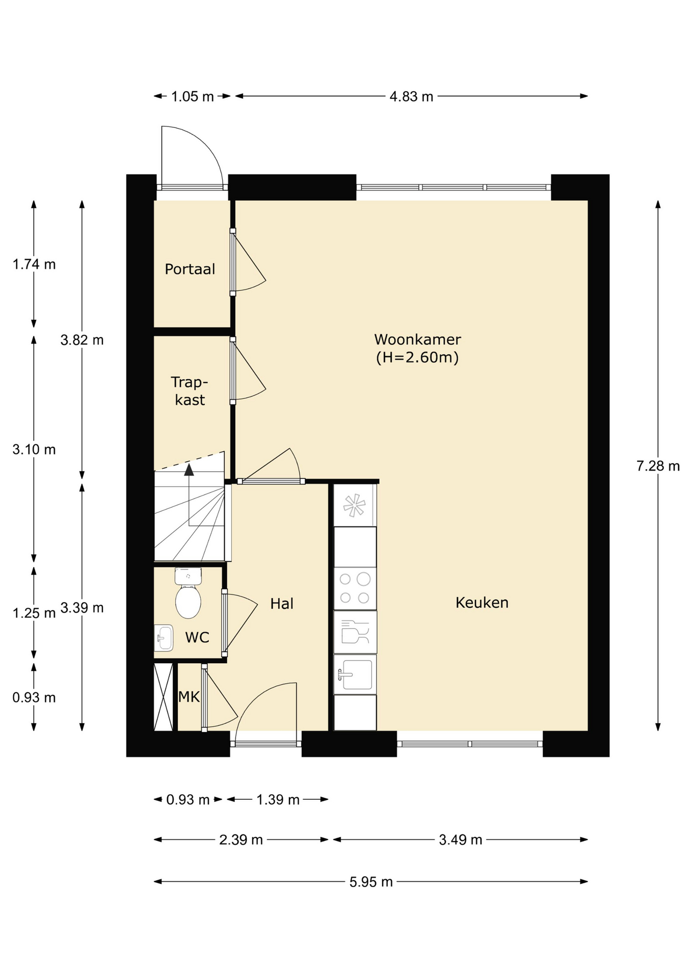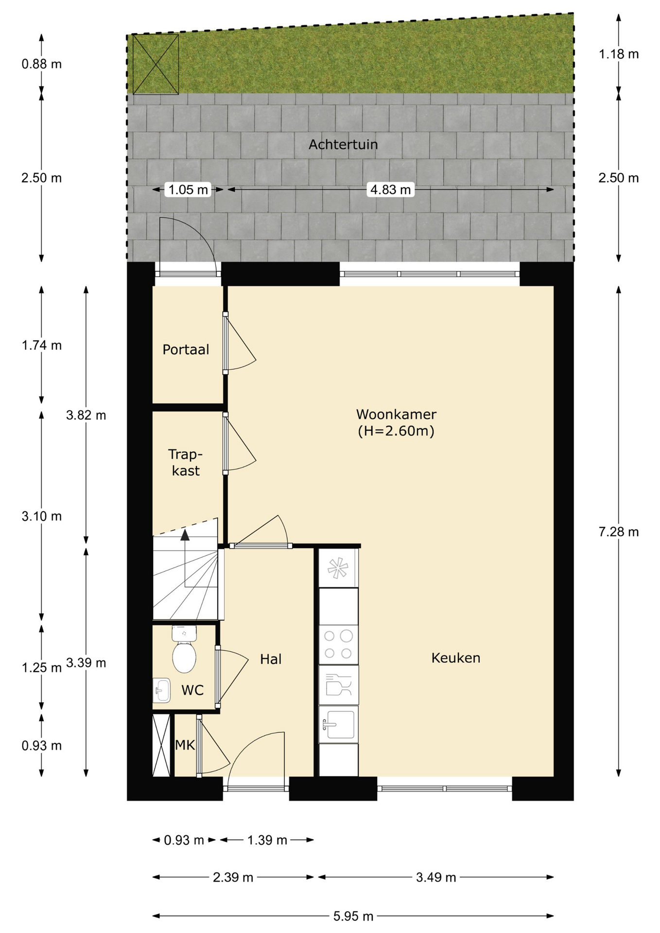 De entreehal, met toilet, meterkast en trap naar de eerste verdieping, geeft toegang tot de woonkamer en de keuken. De woonkamer is aan de achterzijde gelegen en is voorzien van een ruime trapkast. De grote ramen zorgen voor veel lichtinval. Vanuit de woonkamer loopt u naar de open keuken, aan de voorzijde van de woning gelegen. Vanuit de woonkamer heeft u toegang tot het portaal aan de achterzijde. Het portaal geeft toegang tot de tuin.
