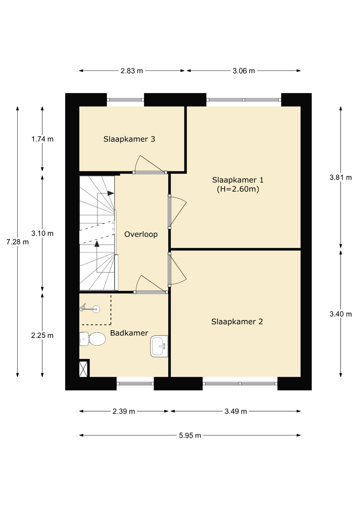 De overloop geeft toegang tot drie slaapkamers, de badkamer en de trapopgang naar de tweede verdieping. Twee slaapkamers zijn ruim. De derde slaapkamer is ook geschikt als inloopkast, kantoor of hobbyruimte.