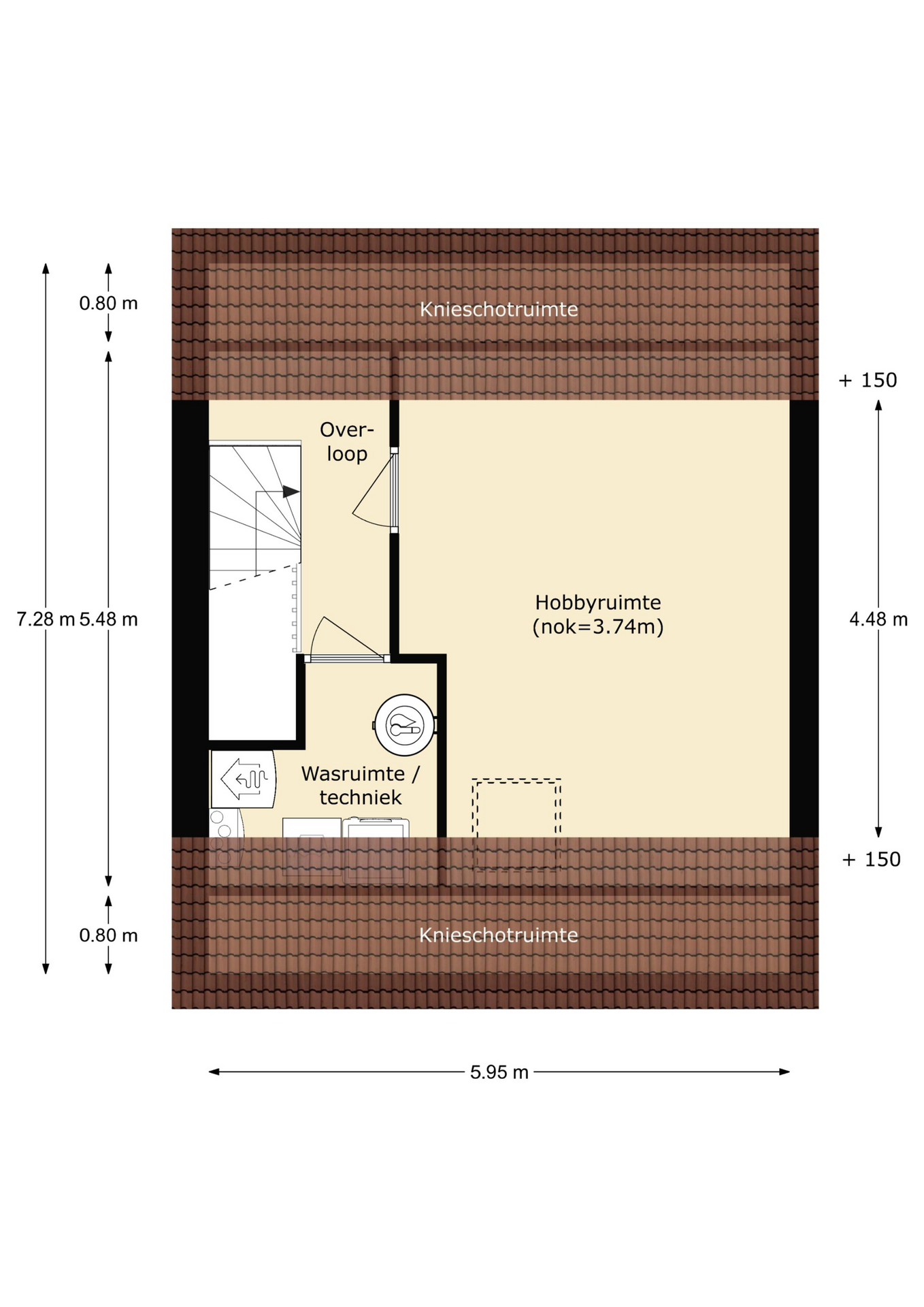 De tweede verdieping is bereikbaar met een vaste trap. De overloop geeft toegang tot de was/techniekruimte en de vierde slaapkamer. In de was/techniekruimte vindt u de witgoedaansluitingen en de warmtepomp. De vierde slaapkamer, met dakraam, is zeer ruim en ook geschikt als kantoor of hobbyruimte. Aan beide zijden is berging onder het schuine dak.