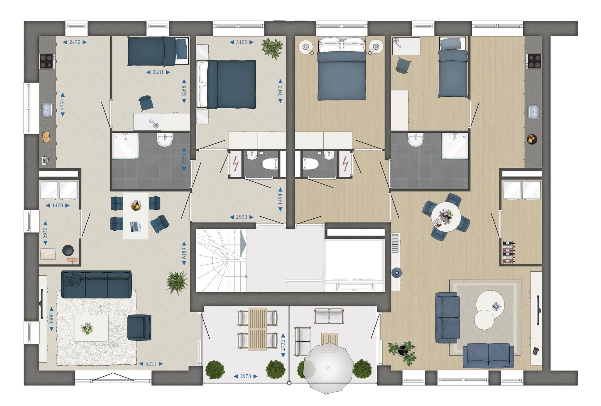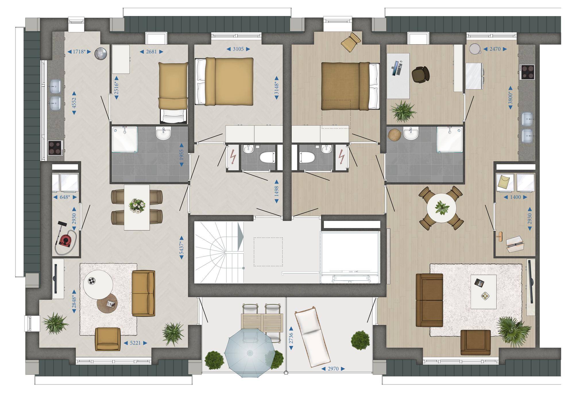 De voorzijde van het complex is gesitueerd op het zuidwesten. Ook de woonkamer en het balkon bevinden zich op het zuidwesten en dat is niet alleen vanwege de zon, maar vooral vanwege het prachtige uitzicht. Ook aan de achterzijde van