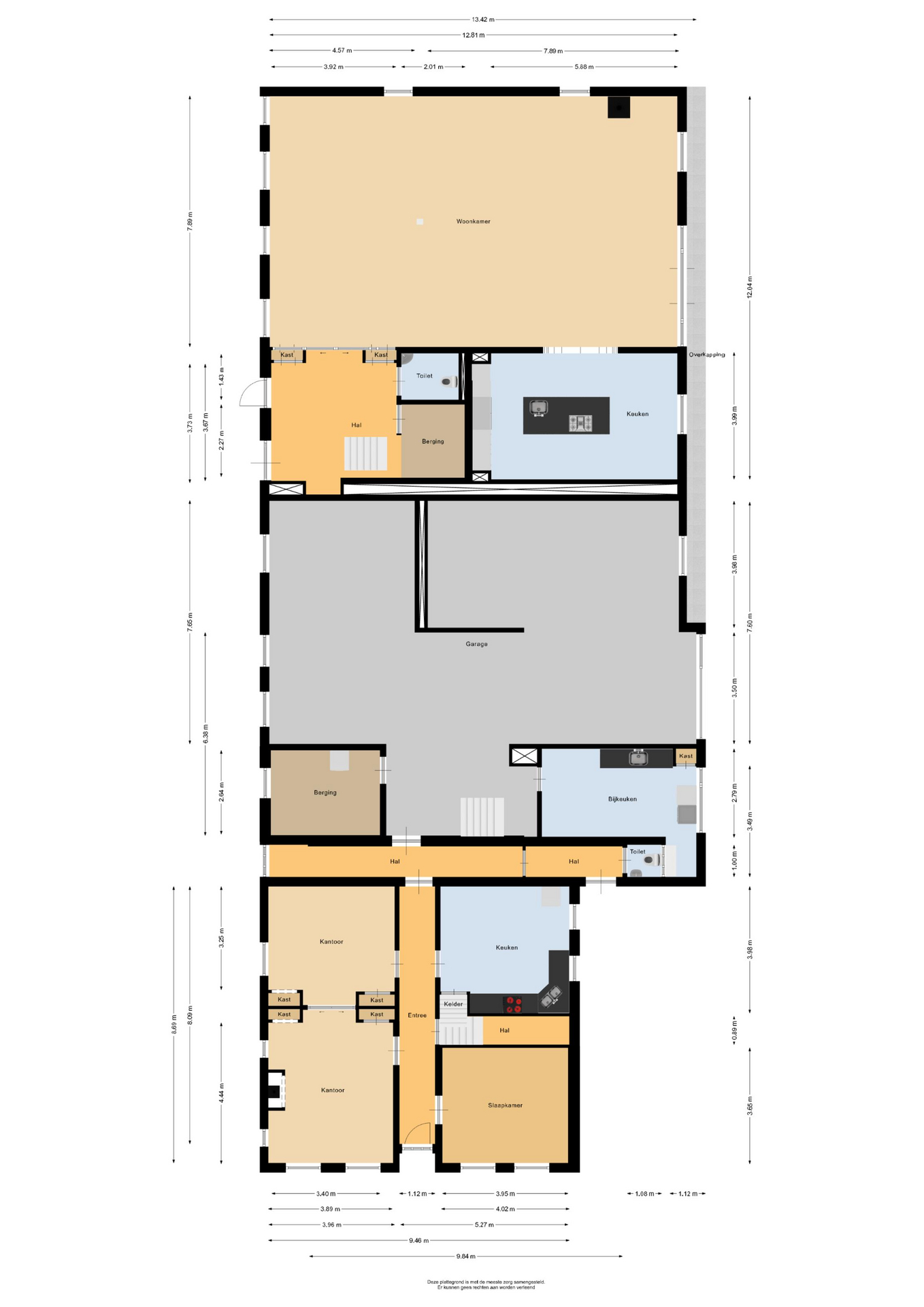 De ruime entreehal, met trapopgang, enkele vaste kasten, berging en toilet, geeft toegang tot de zeer royale woon-/eetkamer en de keuken. De woon-/eetkamer is voorzien van een een mooie PVC vloer met vloerverwarming, een sfeervolle houtkachel, openslaande deuren naar de tuin en grote raampartijen die voor veel lichtinval zorgen. Vanuit de woon-/eetkamer is via een toog de ruime keuken bereikbaar. De keuken, met PVC vloer en vloerverwarming, is voorzien van een een groot kook-/spoeleiland en een kastenwand met daarin diverse apparatuur: oven, combi-magnetron, koel-/vriescombinatie, vaatwasser en boiler. De bijkeuken, bereikbaar vanuit de garage, is voorzien van een keukenblok en de witgoedaansluitingen.