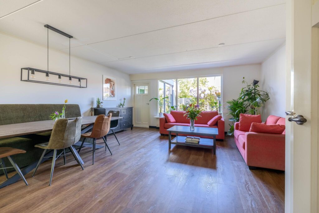 De entreehal, met meterkast en toilet, geeft toegang tot de woonkamer en open keuken. De open keuken (2023), gelegen aan de voorzijde, is voorzien van diverse apparatuur, zoals 5 pits inductie kookplaat, afzuigkap, oven, koelkast, vaatwasser en een Quooker. De grote raampartijen in de woonkamer zorgen voor ruim lichtinval. Middels de woonkamer is de aan de achterzijde gelegen bijkeuken te bereiken. In de bijkeuken zijn de witgoedaansluitingen te vinden en een toegang tot de voor- en achtertuin. De begane grond is, met uitzondering van het toilet, in 2023 voorzien van vloerverwarming en een PVC vloer. In dat jaar is ook de keuken geplaatst en de meterkast vernieuwd.