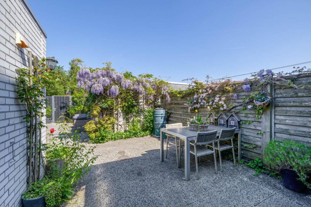 De voor- en achtertuin zijn onderhoudsarm en voorzien van bestrating en vaste planten. De blauwe regen bloeit in de zomer welig tegen de schutting en de garage. De vrijstaande, stenen garage staat rechts achter in de tuin. Er is een achterom en middels de poort kom je op een parkeerterrein en is een speelveld bereikbaar. De achtertuin, gelegen op het noorden, heeft veel privacy.