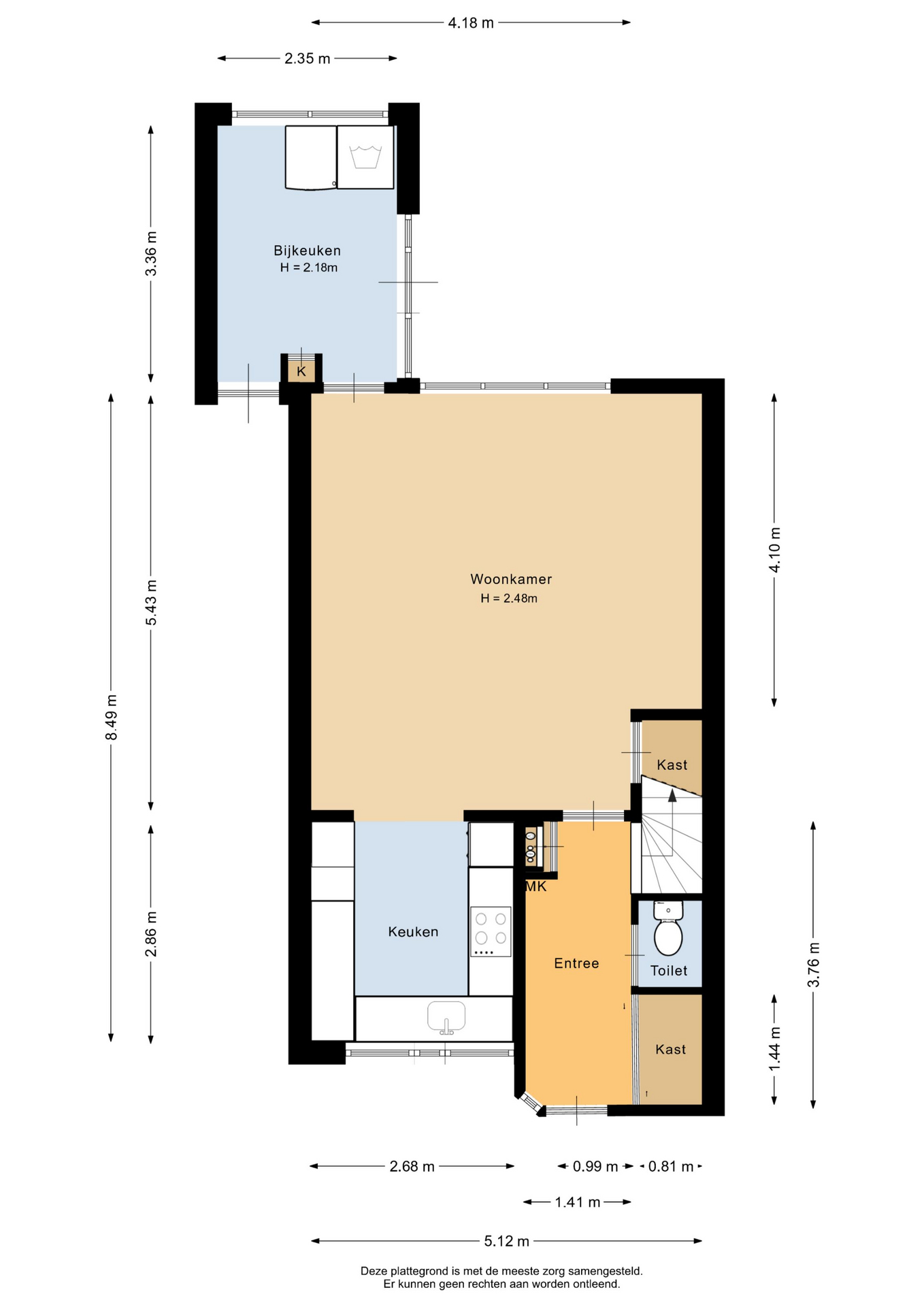 De entreehal, met meterkast en toilet, geeft toegang tot de woonkamer en open keuken. De open keuken (2023), gelegen aan de voorzijde, is voorzien van diverse apparatuur, zoals 5 pits inductie kookplaat, afzuigkap, oven, koelkast, vaatwasser en een Quooker. De grote raampartijen in de woonkamer zorgen voor ruim lichtinval. Middels de woonkamer is de aan de achterzijde gelegen bijkeuken te bereiken. In de bijkeuken zijn de witgoedaansluitingen te vinden en een toegang tot de voor- en achtertuin. De begane grond is, met uitzondering van het toilet, in 2023 voorzien van vloerverwarming en een PVC vloer. In dat jaar is ook de keuken geplaatst en de meterkast vernieuwd.