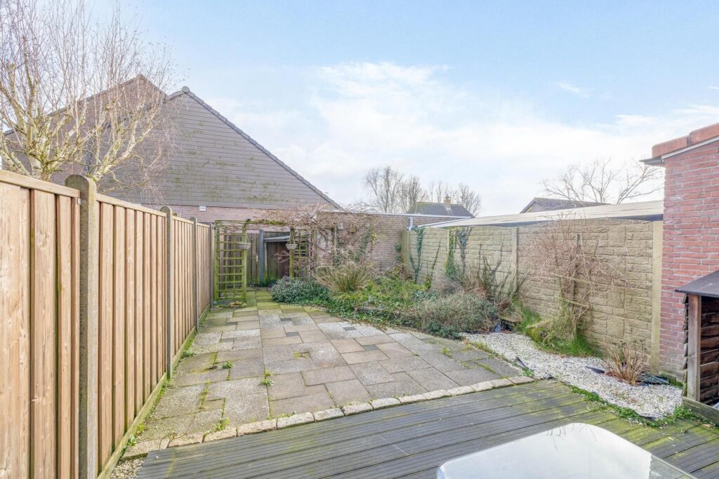 De achtertuin, gelegen op het zuidoosten, is voorzien van een vlonder direct achter de woning, bestrating en een border met allerlei planten. Achterin de tuin staat de berging. Links van de berging is een poort waardoor de tuin achterom bereikbaar is.