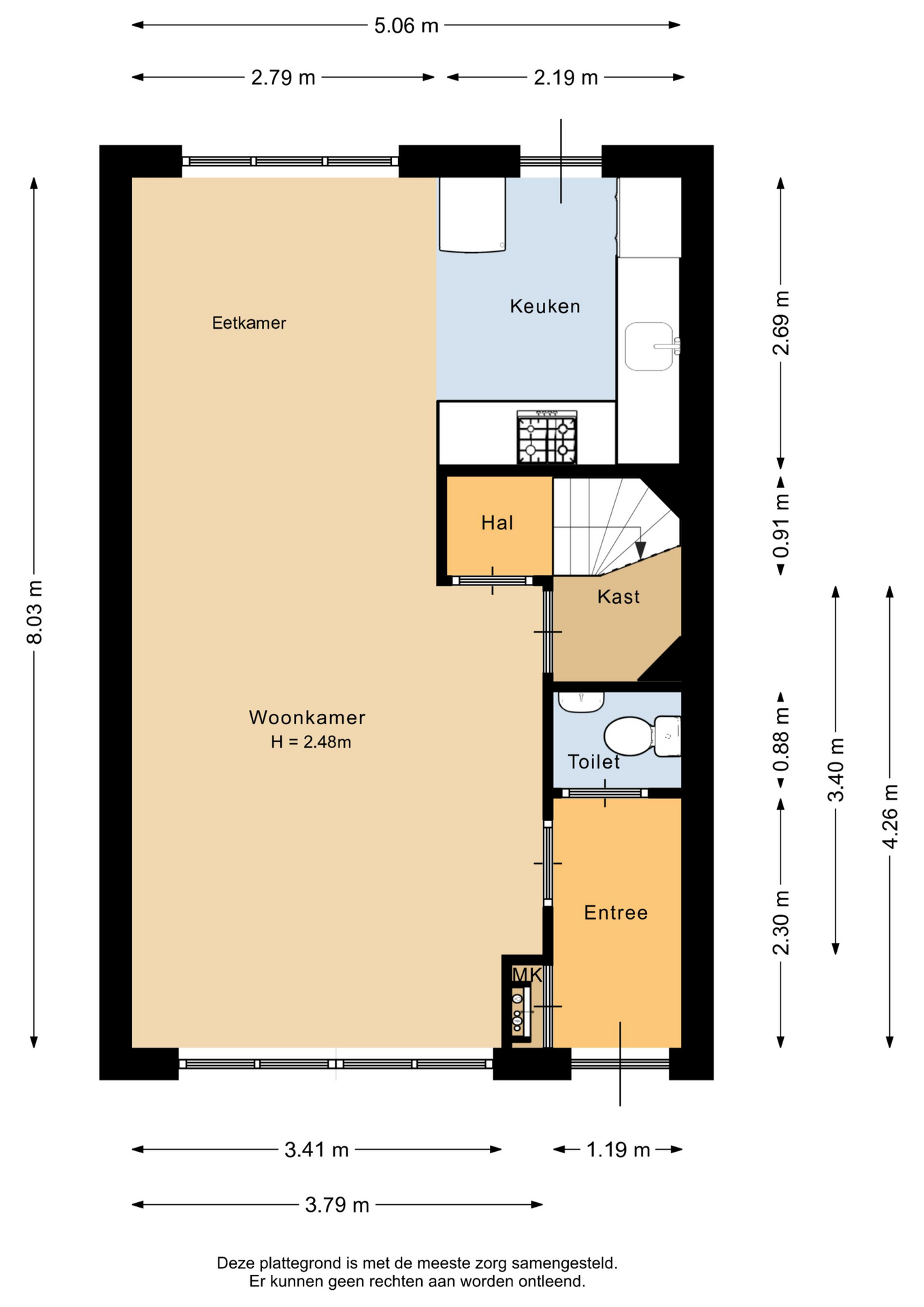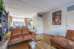 De entreehal, met toilet en meterkast, geeft toegang tot de woon-/eetkamer. De woonkamer, aan de voorzijde gelegen, is voorzien van een parketvloer en een vaste kast. De grote raampartijen zorgen voor veel natuurlijke lichtinval. Aan de achterzijde van de woning is de eetkamer gelegen, met aansluitend de open keuken. De ruime hoekkeuken is voorzien van veel opbergruimte en diverse apparatuur: kookplaat, afzuigkap, combi-oven, koelkast en vaatwasser. Aan de achterzijde van de keuken is de deur naar de tuin.