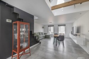 De overloop geeft toegang tot de woon-/eetkamer en de keuken. De woonkamer, aan de voorzijde gelegen, is voorzien van een laminaatvloer en inbouwspots. De grote ramen zorgen voor veel lichtinval. In het verlengde van de woonkamer is de eetkamer, met trap naar de tweede verdieping, gesitueerd. Het hoge plafond met authentieke balken en vide, zorgen voor een open gevoel. Aan de achterzijde is de keuken te vinden. De keuken bestaat uit een kook-/spoeleiland met opbergruimte en diverse apparatuur: kookplaat, afzuigkap, combi-oven, koel-/vriescombinatie en vaatwasser. Vanuit de keuken heb je toegang tot de badkamer en het balkon. De moderne badkamer is geheel betegeld en voorzien van een douche, een wastafel, een toilet, een designradiator en inbouwspots.