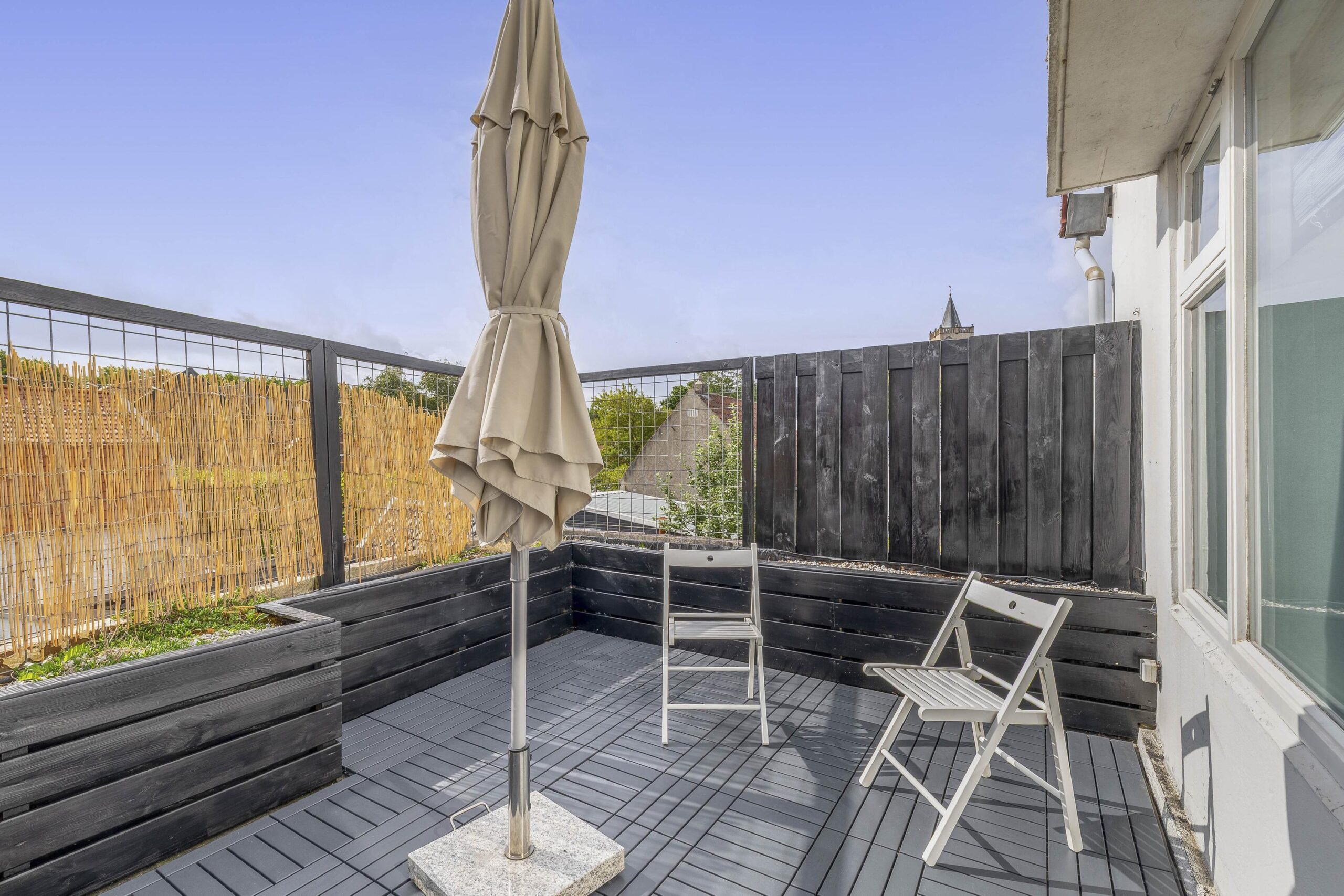 Het balkon, bereikbaar vanuit de keuken, is gelegen op het zuidoosten. Het is hier heerlijk vertoeven met een hapje en een drankje.