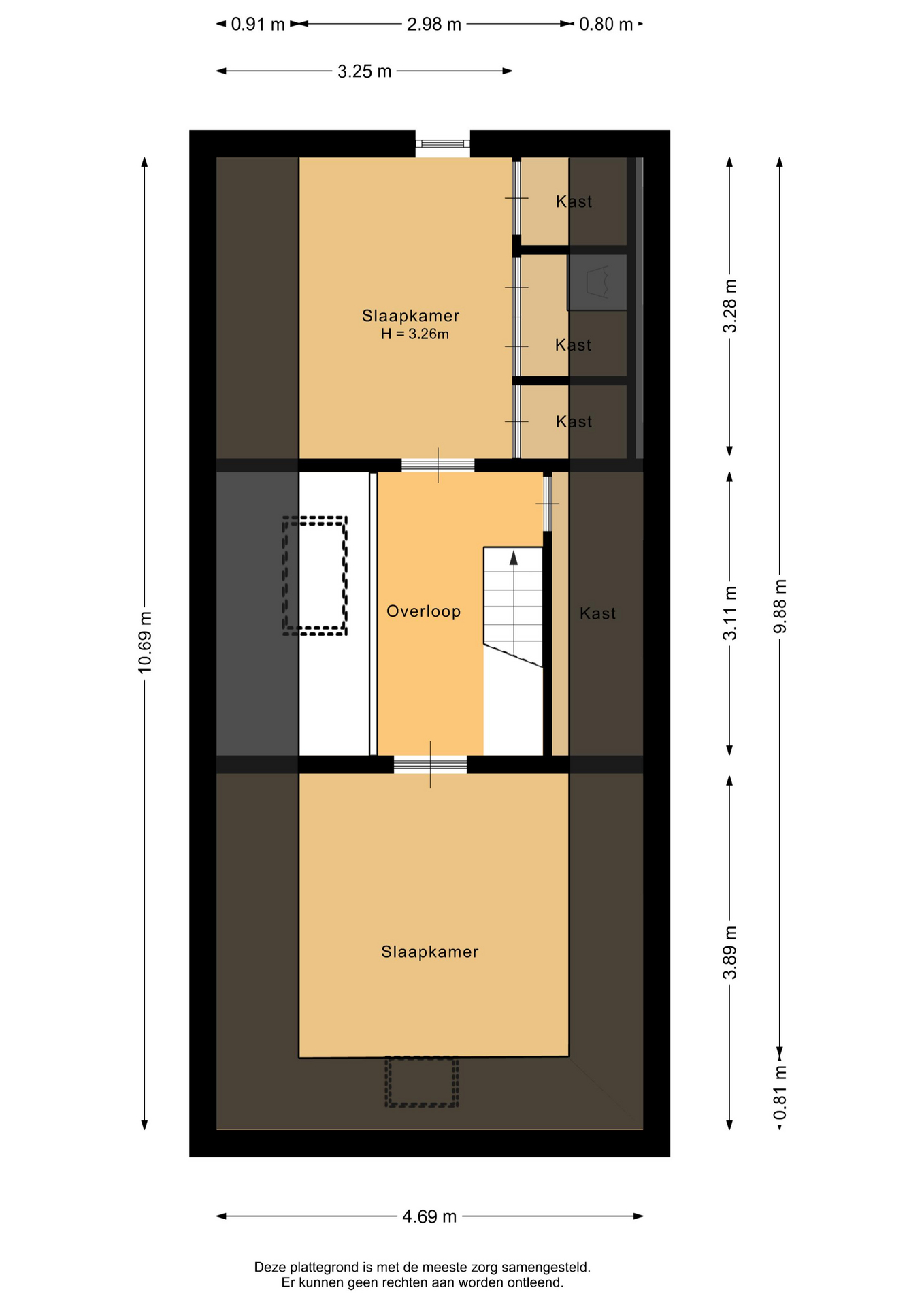 De overloop, met vide, dakraam en berging onder het schuine dak, geeft toegang tot de twee slaapkamers. De slaapkamer aan de voorzijde is voorzien van een dakraam. De slaapkamer aan de achterzijde heeft kastruimte onder het schuine dak, voorzien van schuifdeuren. Achter de middelste schuifdeur vind je de witgoedaansluiting.