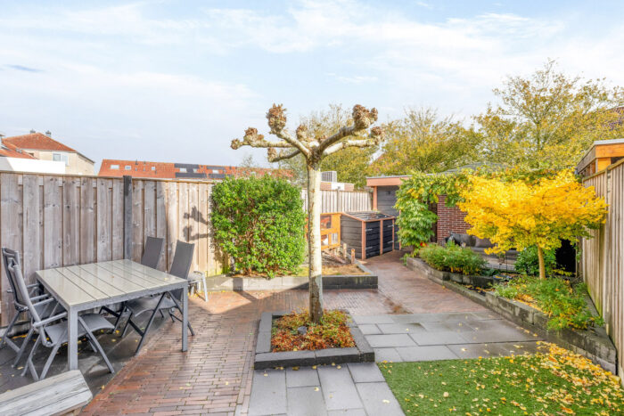 De tuin is onderhoudsvriendelijk aangelegd en voorzien van een speelse combinatie van bestrating en groene borders. Achterin de tuin bevindt zich een vrijstaande stenen berging met overkapping. Creëer een heerlijk zitje waar je tot in de late uurtjes kunt genieten. Dankzij de achterom is de tuin ook praktisch in gebruik. De ligging op het oosten zorgt ervoor dat je ’s ochtends al vroeg kunt genieten van de eerste zonnestralen — een heerlijk begin van de dag met een kop koffie in de hand.