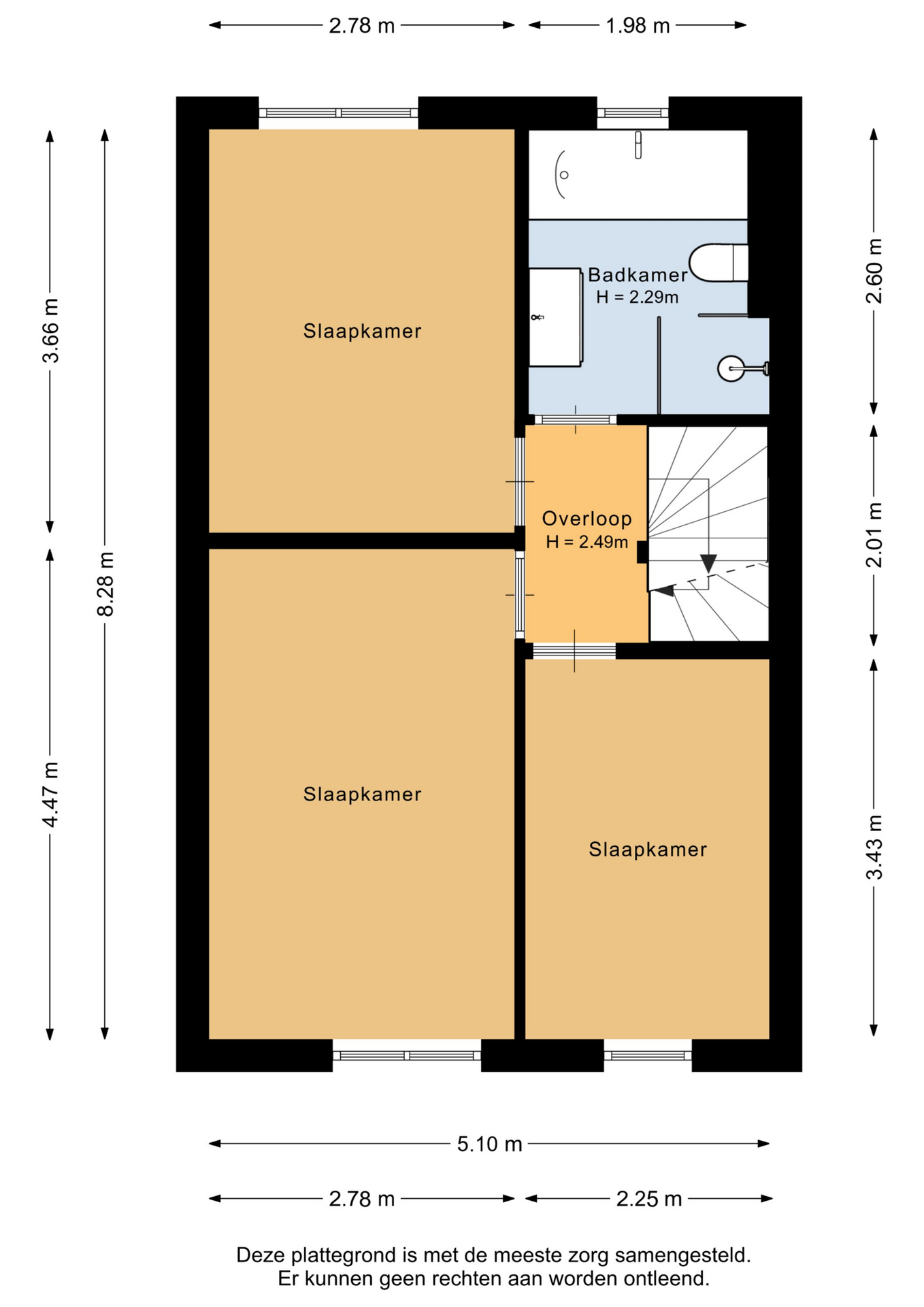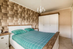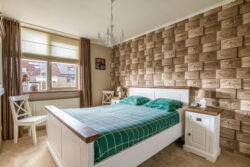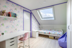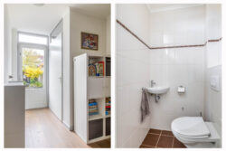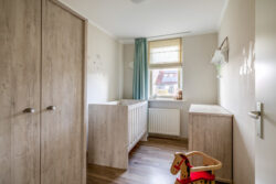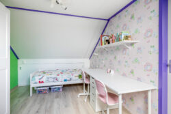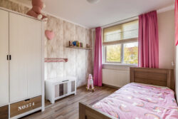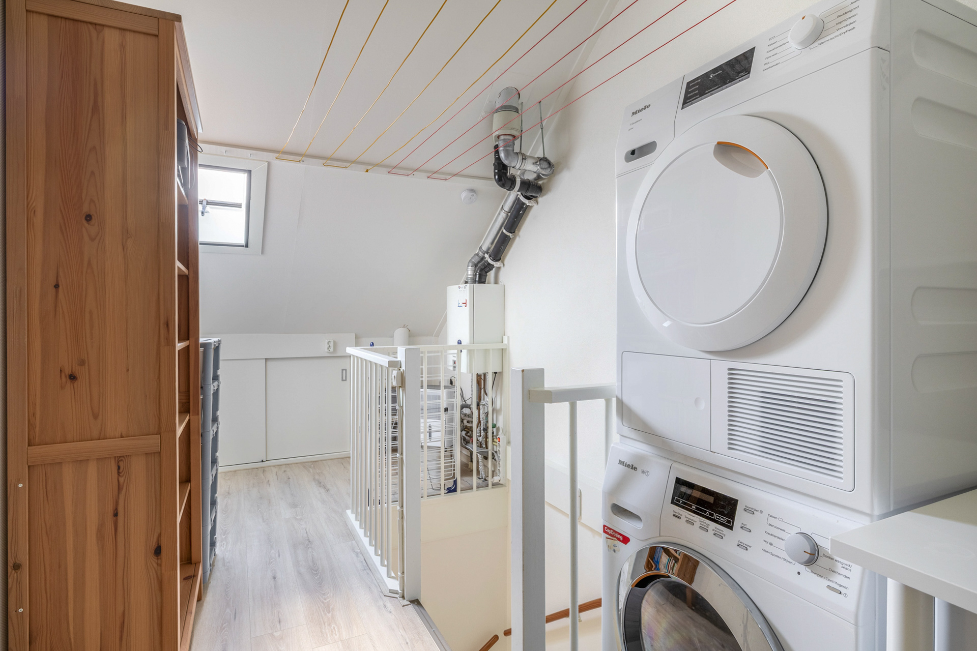 Via een vaste trap bereik je de tweede verdieping. Op de overloop vindt je de aansluitingen voor wasmachine en droger, evenals de CV-installatie. Hier bevindt zich ook de vierde slaapkamer, een gezellige ruimte met een Velux dakraam – perfect als logeerkamer of werkplek.