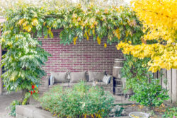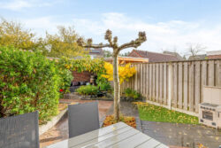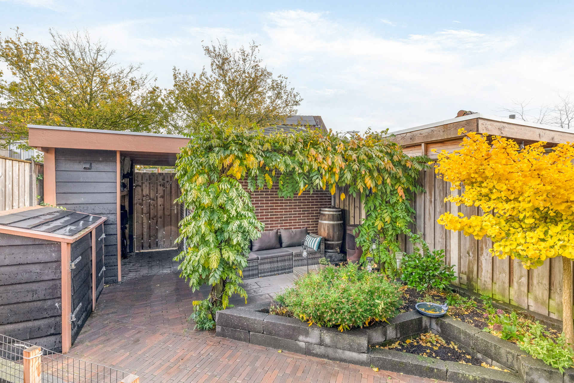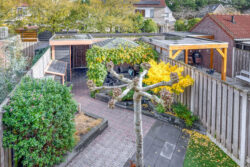De tuin is onderhoudsvriendelijk aangelegd en voorzien van een speelse combinatie van bestrating en groene borders. Achterin de tuin bevindt zich een vrijstaande stenen berging met overkapping. Creëer een heerlijk zitje waar je tot in de late uurtjes kunt genieten. Dankzij de achterom is de tuin ook praktisch in gebruik. De ligging op het oosten zorgt ervoor dat je ’s ochtends al vroeg kunt genieten van de eerste zonnestralen — een heerlijk begin van de dag met een kop koffie in de hand.