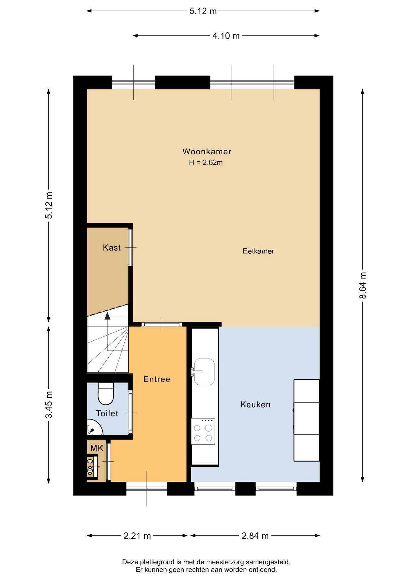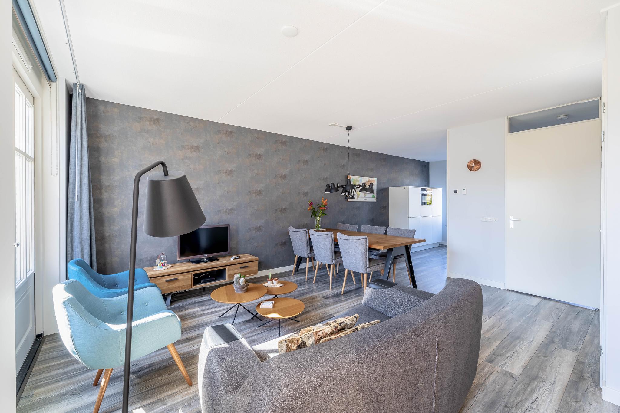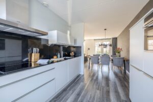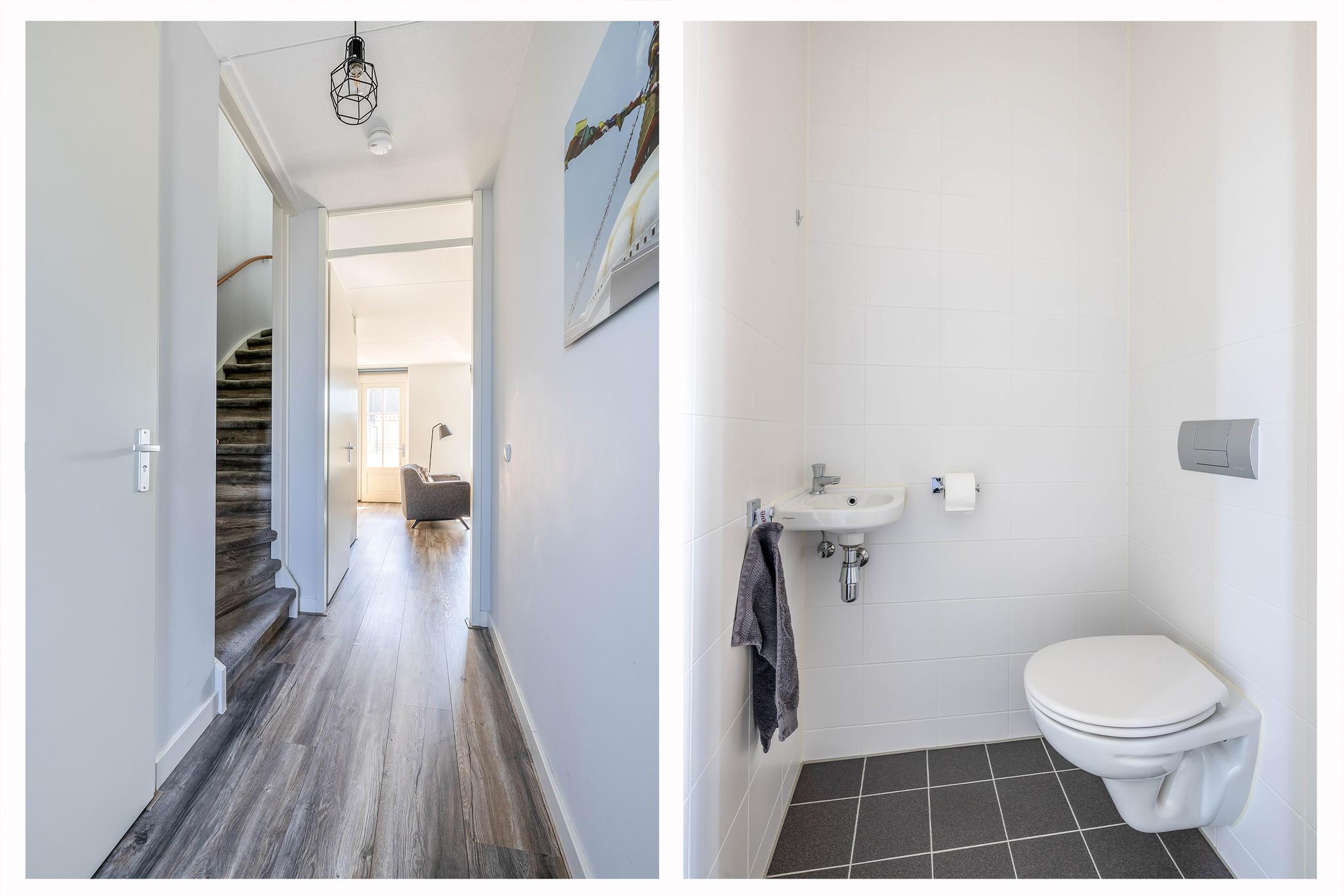 De entreehal, met meterkast, toilet en trapopgang, geeft toegang tot de woon-/eetkamer en de keuken. De gezellige woonkamer, aan de achterzijde van de woning gelegen, is voorzien van een mooie laminaatvloer, openslaande deuren en een deur naar de tuin. De grote raampartijen zorgen voor veel natuurlijke lichtinval. In het verlengde van de woonkamer is de eetkamer, met vaste kast, gesitueerd. Vanuit de eetkamer heeft u toegang tot de open keuken. De moderne keuken is voorzien van veel opbergruimte en diverse apparatuur: kookplaat, afzuigkap, combi-oven, koelkast en vaatwasser. De gehele benedenverdieping is voorzien van een laminaatvloer met vloerverwarming.