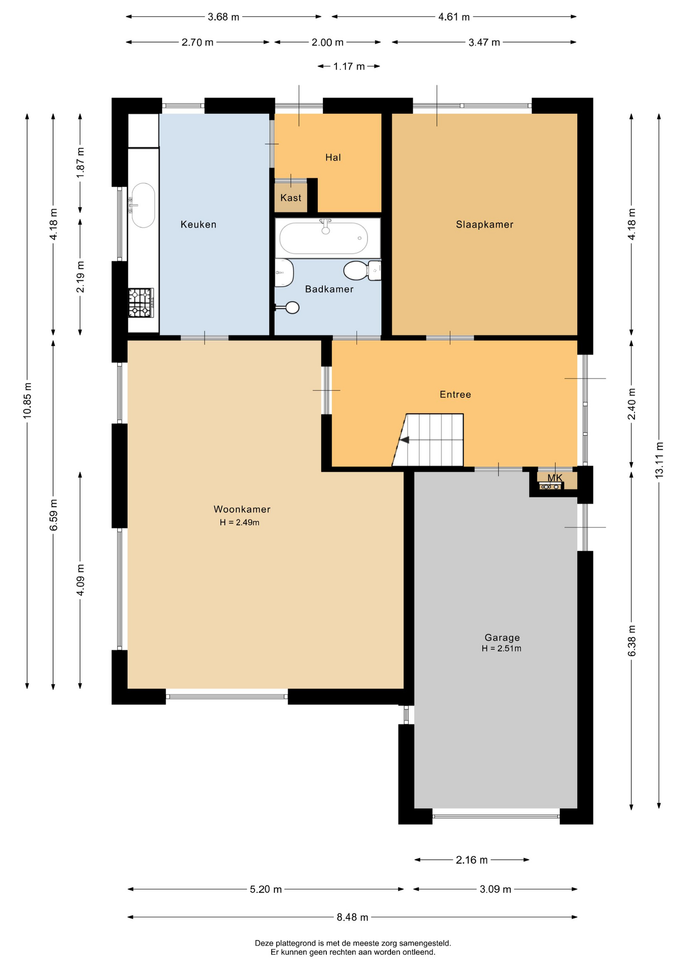 De ruime entreehal, met trapopgang en meterkast, geeft toegang tot de woon-/eetkamer, de slaapkamer en de garage. De
