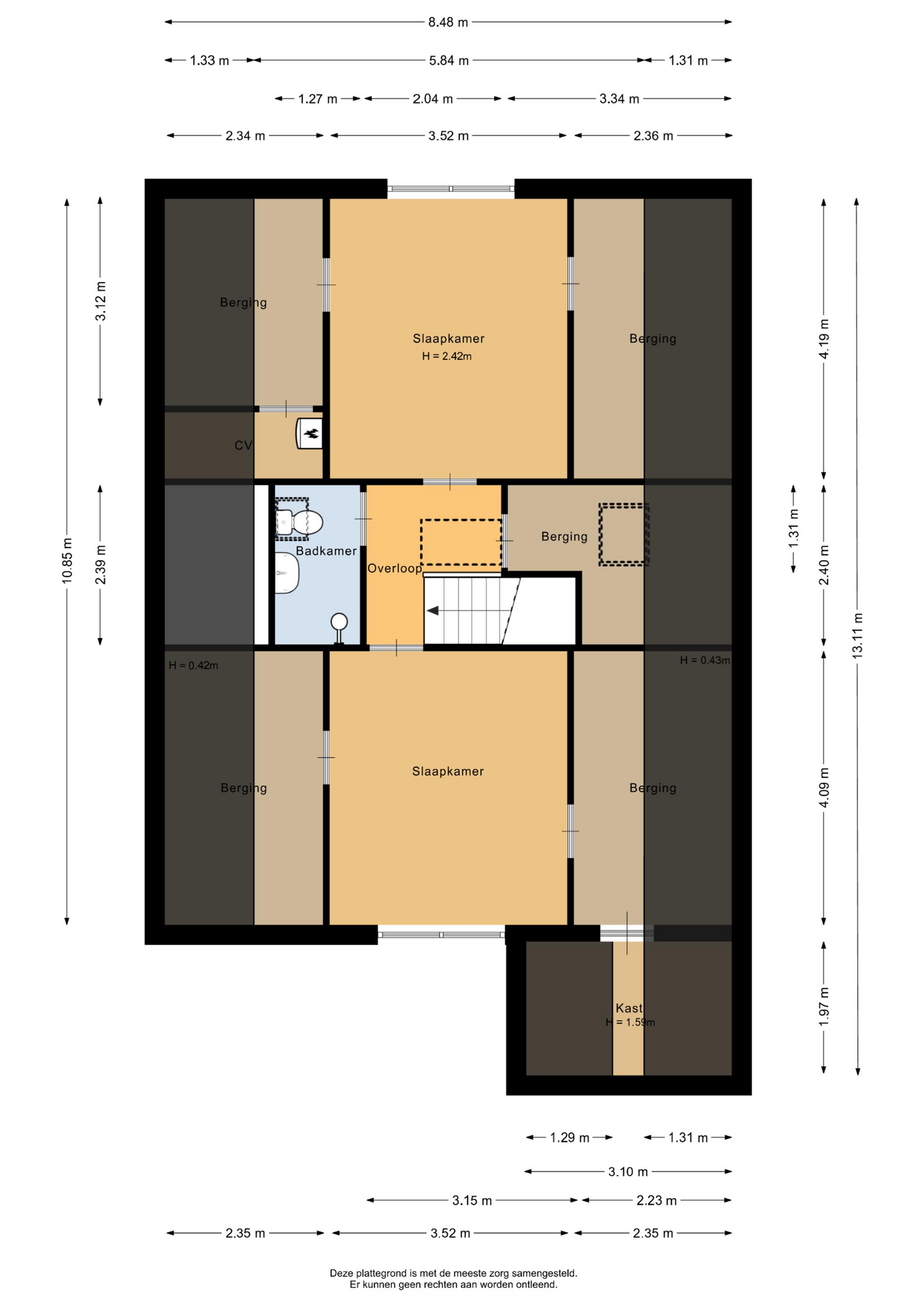 De overloop geeft toegang tot de overige twee slaapkamers, een tweede badkamer en een berging. De ruime slaapkamers hebben aan beide zijden een royale berging onder het schuine dak. In de linker berging, in de slaapkamer aan de achterzijde, is een deur die toegang geeft tot een ruimte met daarin de CV-ketel. In de rechter berging in de slaapkamer aan de voorzijde is een deur die toegang geeft tot een extra berging/kast boven de garage.