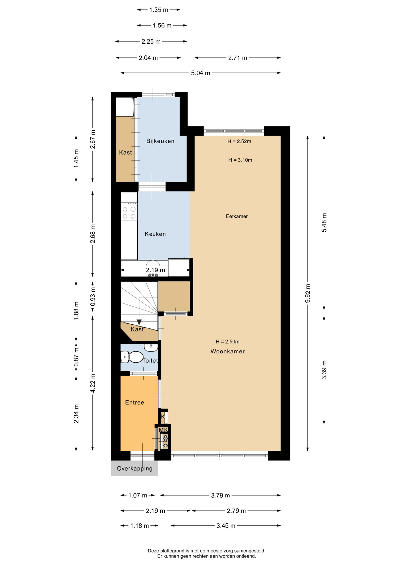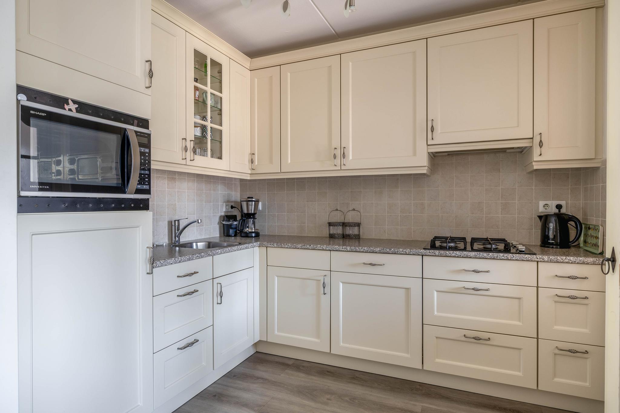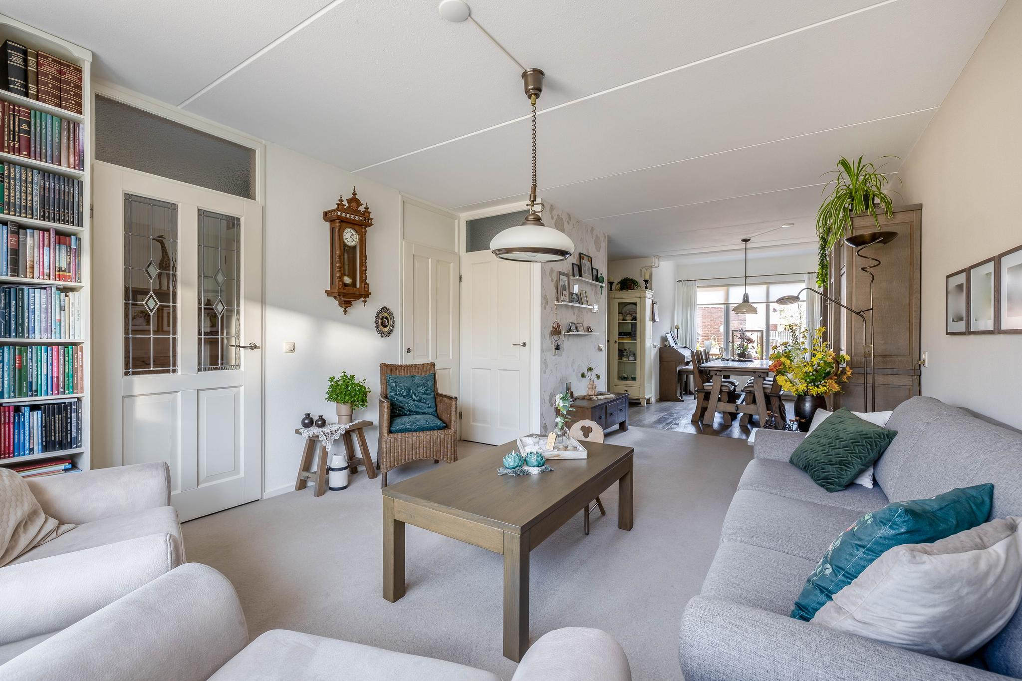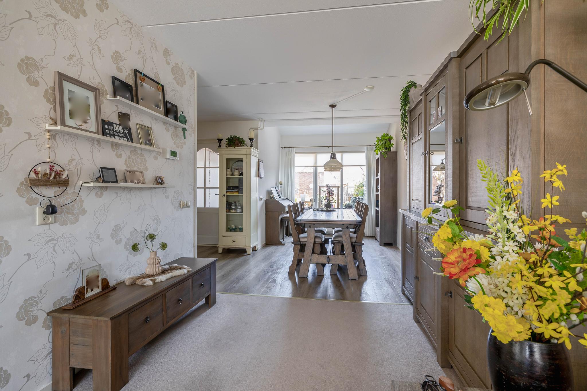 De entreehal, met meterkast en toilet, geeft toegang tot de woonkamer. Aan de voorzijde van de woning is het zitgedeelte, voorzien van vloerverwarming. De achterzijde kan worden gebruikt als eetkamer. De open keuken is voorzien van diverse apparatuur, zoals kookplaat, afzuigkap, koelkast, en vaatwasser. Vanuit de open keuken is de aan de achterzijde gelegen bijkeuken bereikbaar, welke ook toegang geeft tot de achtertuin. De schuifdeurkast in de bijkeuken geeft veel opbergruimte.