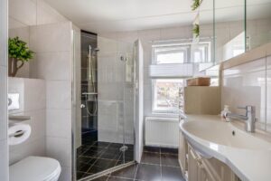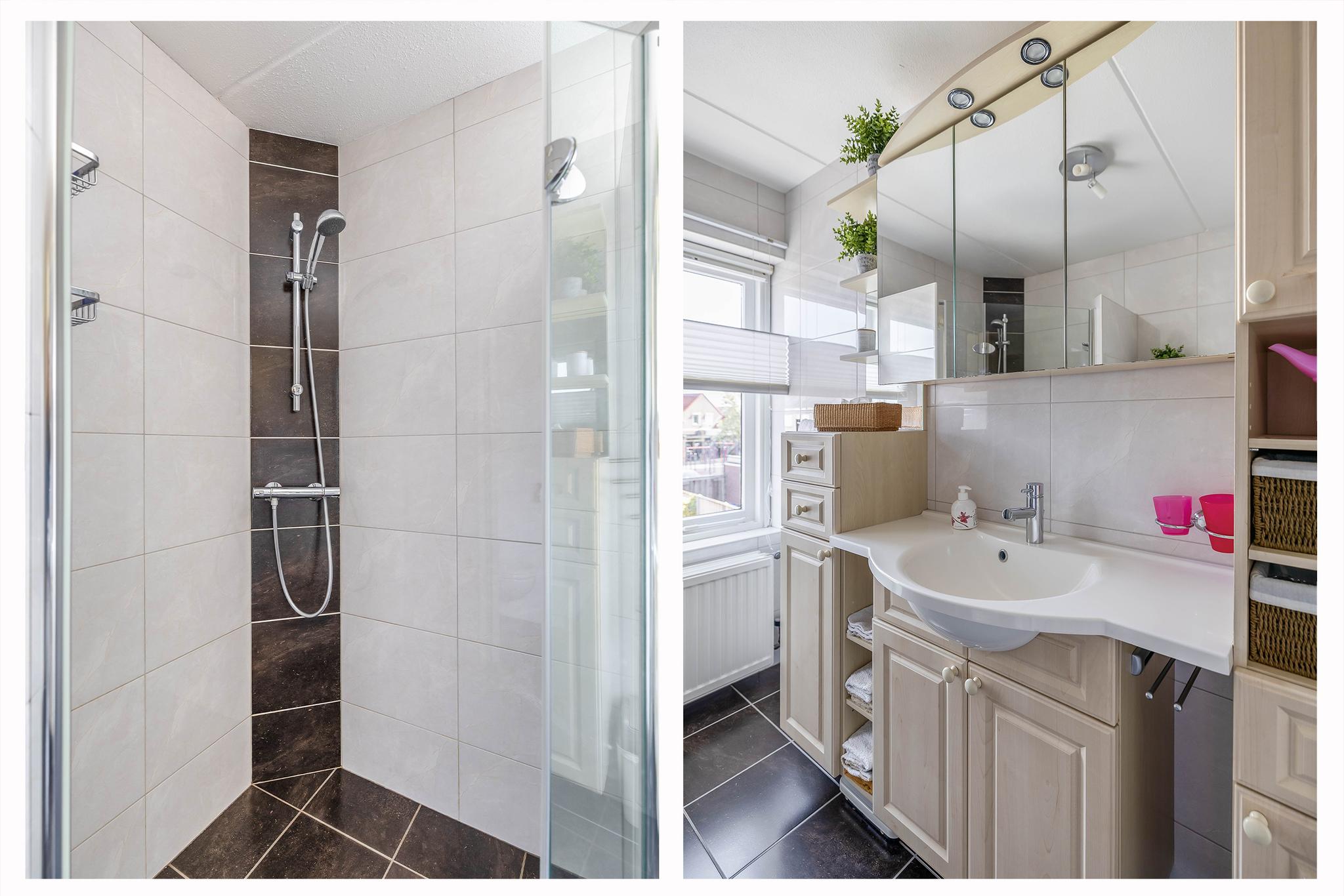 Middels de overloop zijn drie slaapkamers te bereiken. De master-bedroom is gelegen aan de voorzijde van de woning. De badkamer heeft een inloopdouche, toilet en een wastafelmeubel met veel opbergmogelijkheden.
