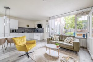 Middels de entreehal, met toegang tot de berging en het toilet, kom je in de woonkamer met open keuken. Deze ruimtes zijn licht en hebben grote raampartijen. De open keuken is compleet met diverse luxe apparatuur van Whirlpool 6th Sense, zoals inductie kookplaat, afzuigkap, combi-oven, koel-vriescombinatie, vaatwasser en een Quooker. Voldoende mogelijkheden voor het bereiden van heerlijke maaltijden. Grenzend aan de woonkamer zijn de slaapkamer en badkamer gelegen. Vanuit zowel de slaapkamer en de woonkamer kun je naar buiten. De badkamer, gelegen aan de achterzijde, is voorzien van een inloopdouche met regendouche, toilet, wastafelmeubel en designradiator.