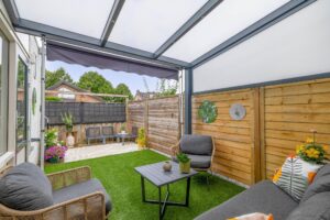 Aan de voorzijde van de woning is de aangebouwde berging gesitueerd. Deze is vanaf binnen en buiten toegankelijk. De tuin is onderhoudsvriendelijk aangelegd. De achtertuin, gelegen op het westen, is voorzien van een overkapping. Hier is het genieten en kom je tot rust.