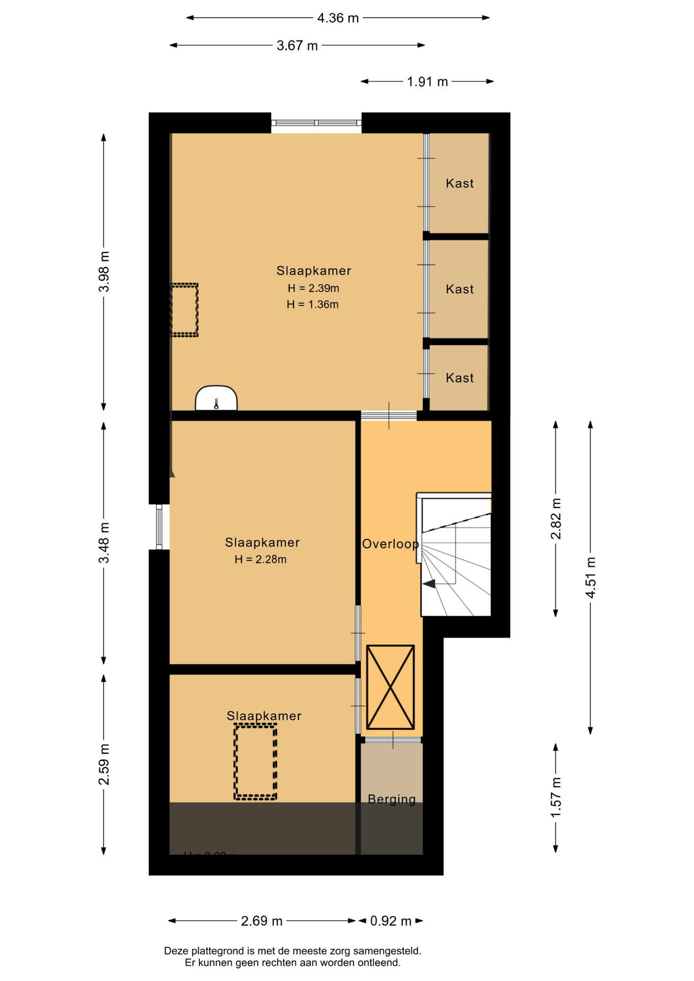 De drie slaapkamers zijn gelegen op de eerste verdieping. De masterbedroom heeft veel opbergruimte door middel van een inbouwkast en is voorzien van een wastafel. Vanaf de overloop is zowel een berging als een bergzolder bereikbaar.
