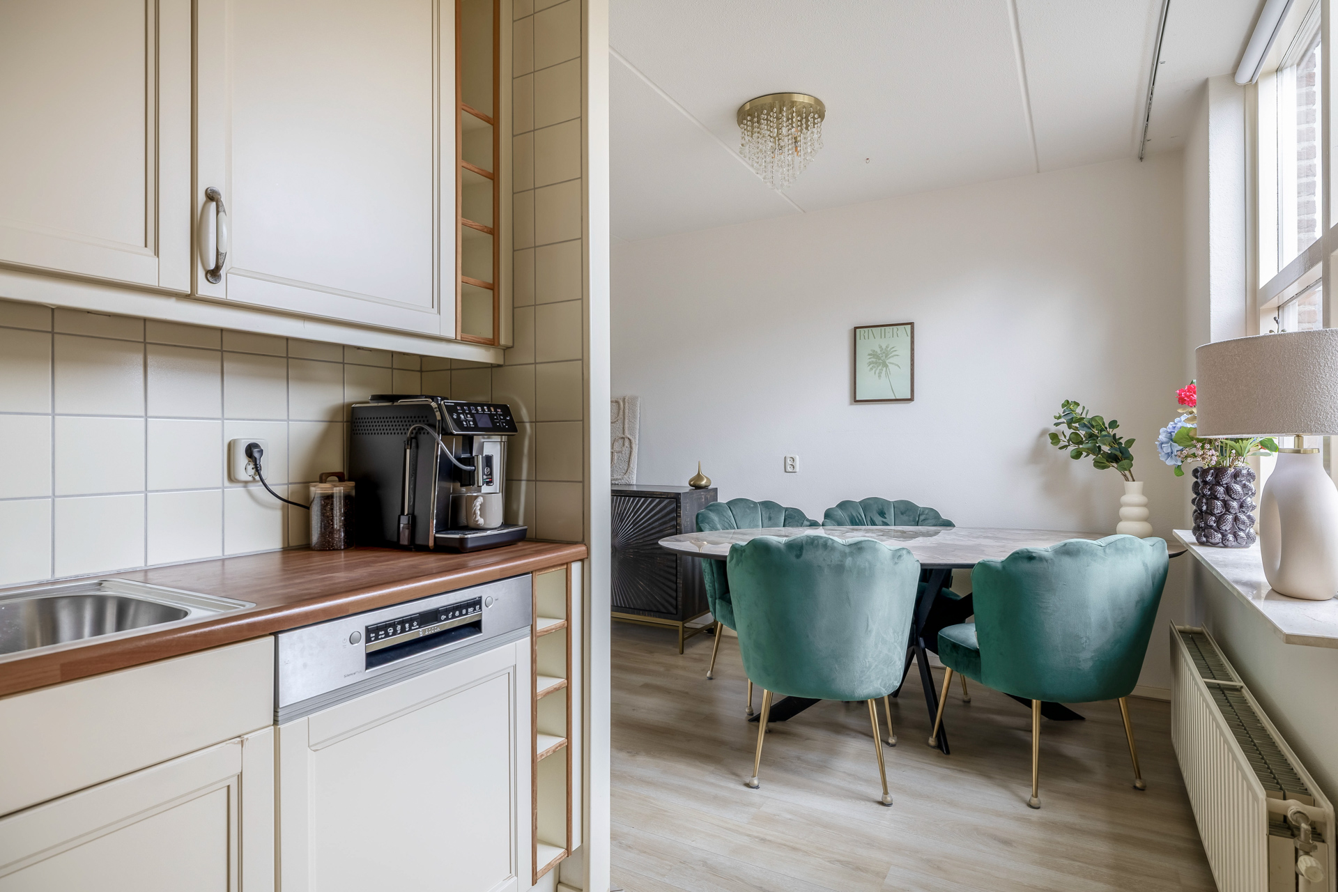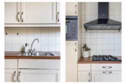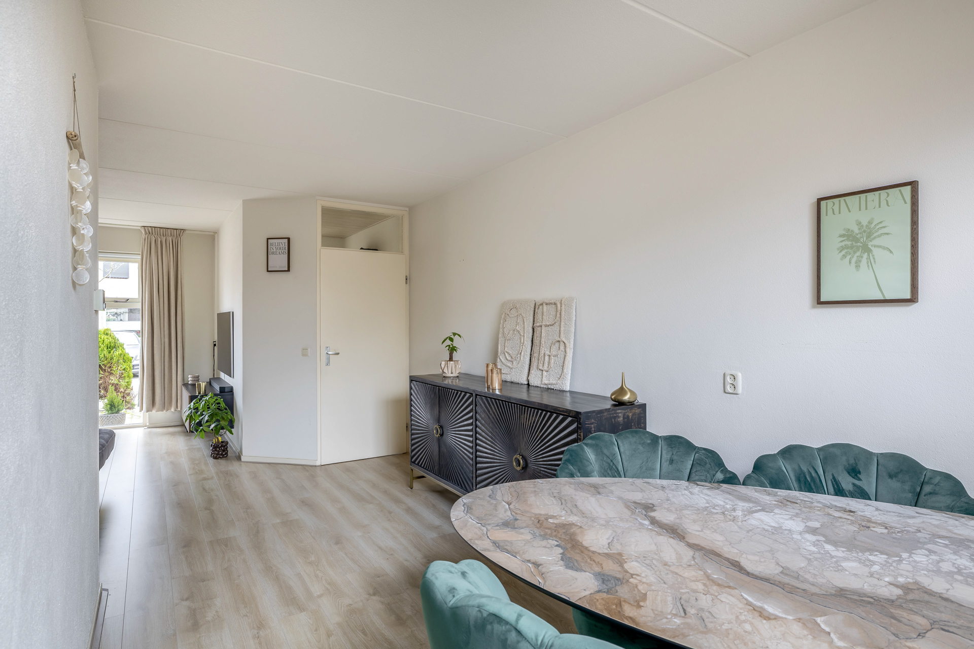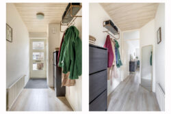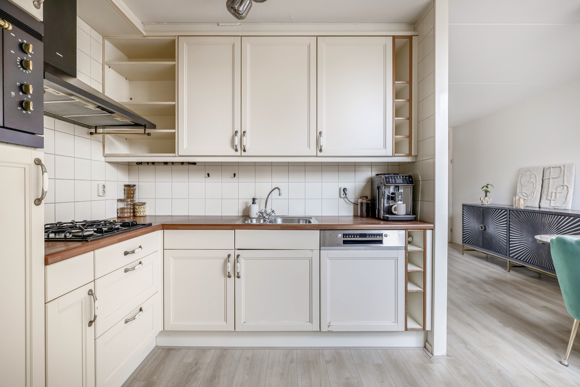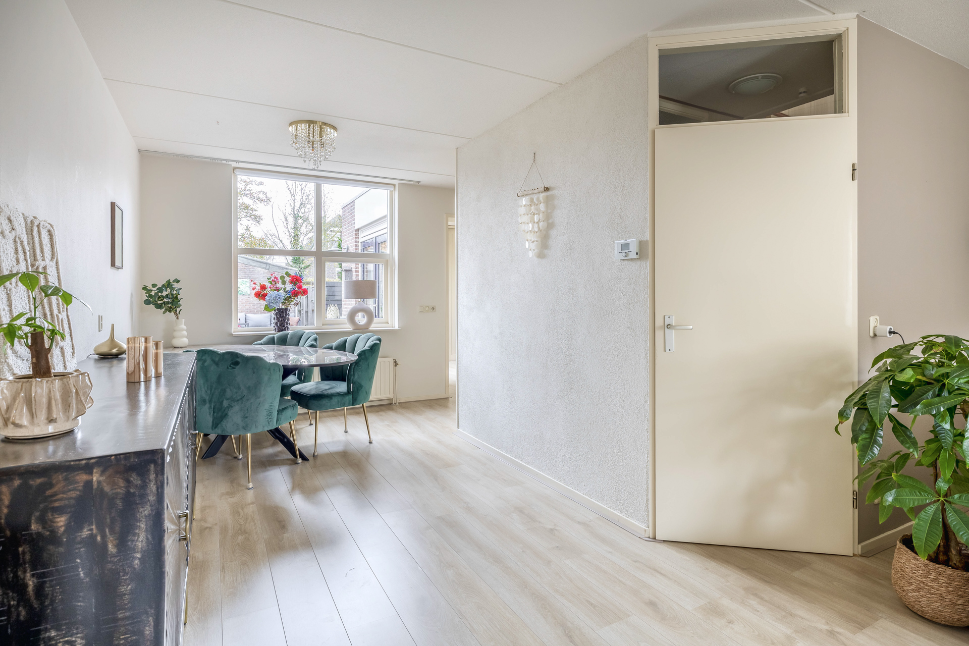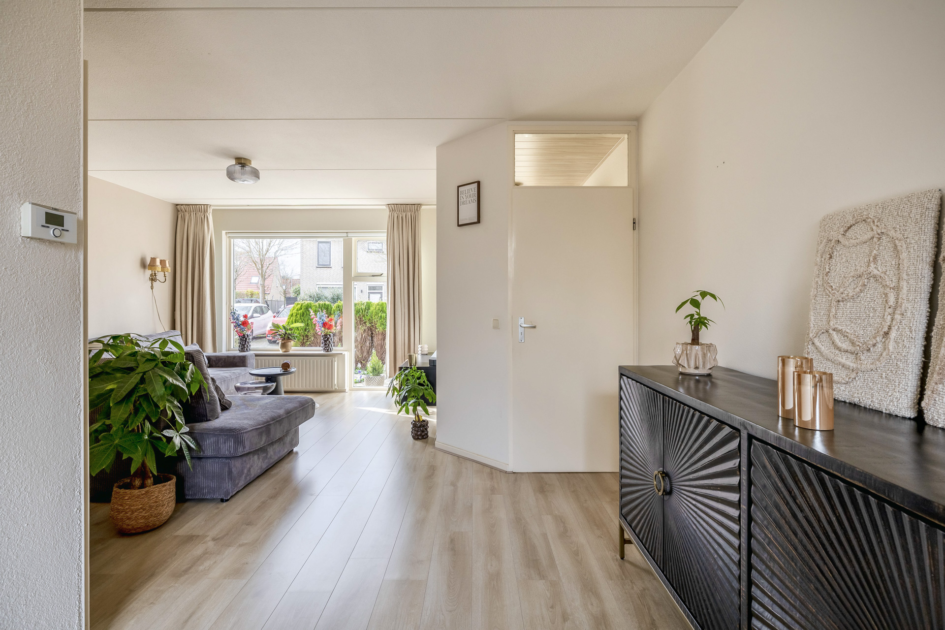 Via de entreehal stap je direct binnen in de woonkamer met open keuken, een ruimte die door zijn speelse indeling meteen een warm gevoel oproept. De royale raampartijen laten het daglicht rijkelijk binnenstromen en geven de woonkamer een lichte, uitnodigende sfeer.