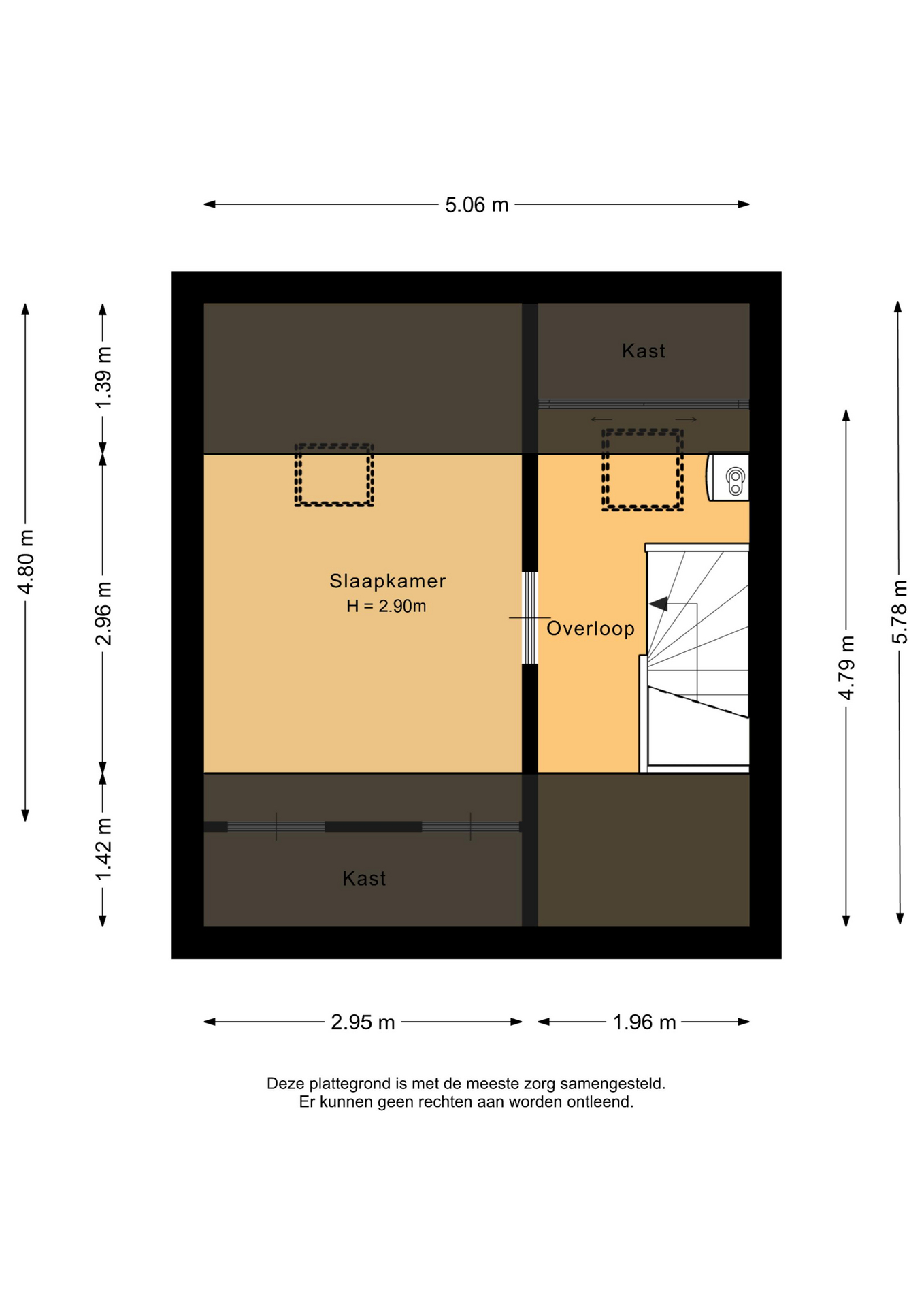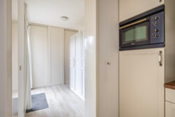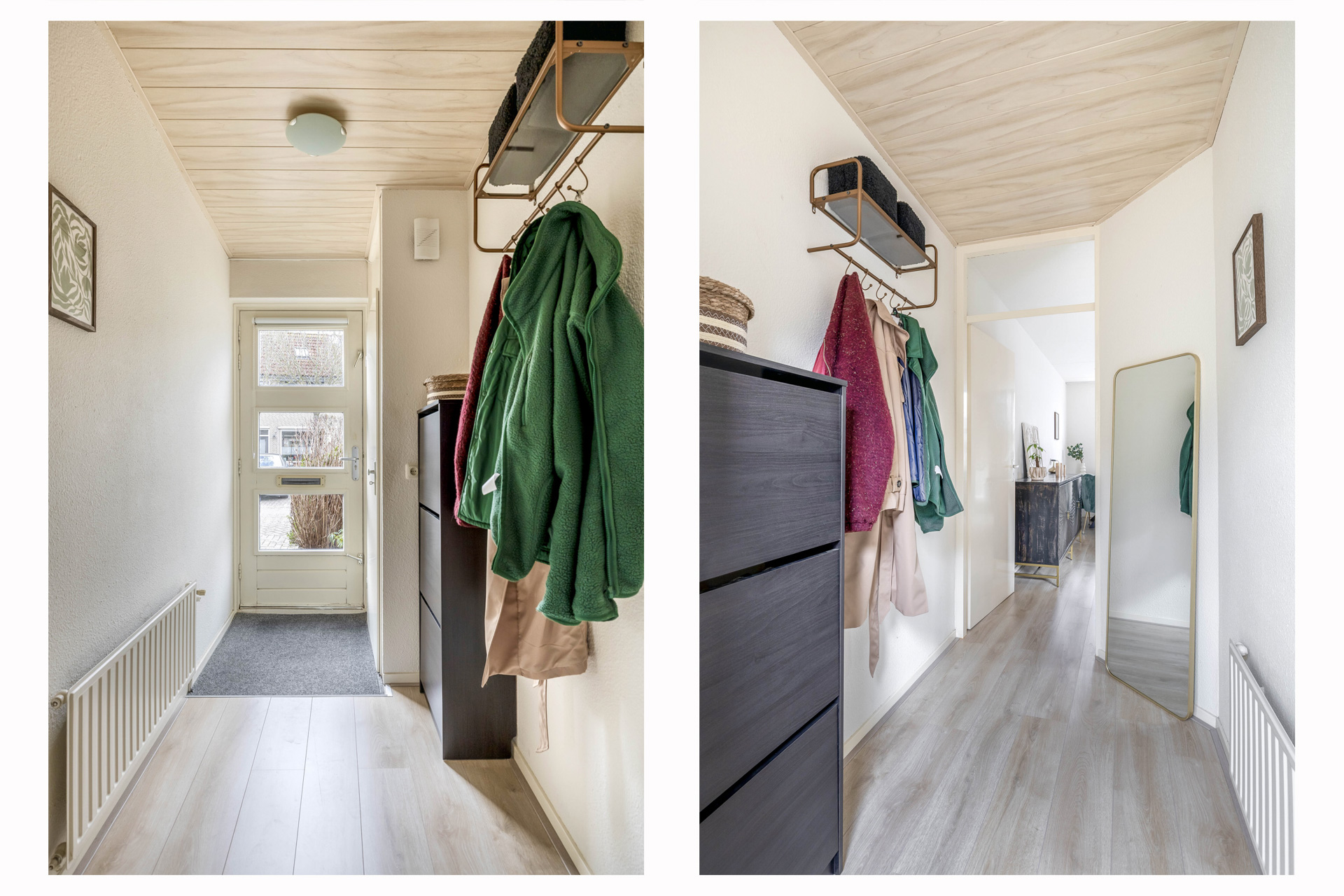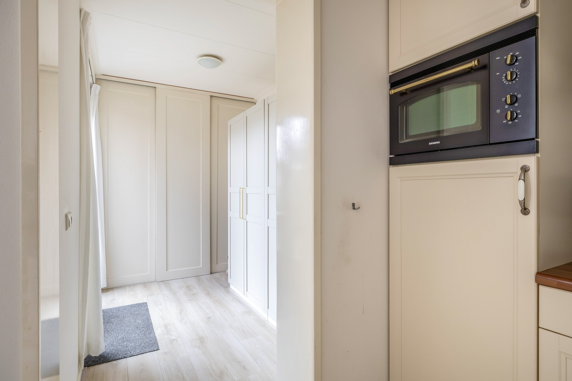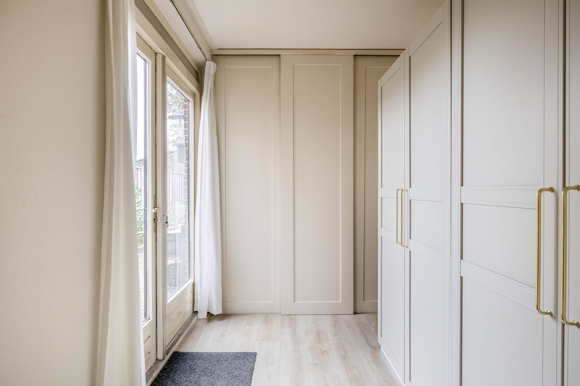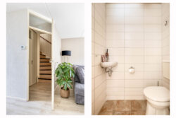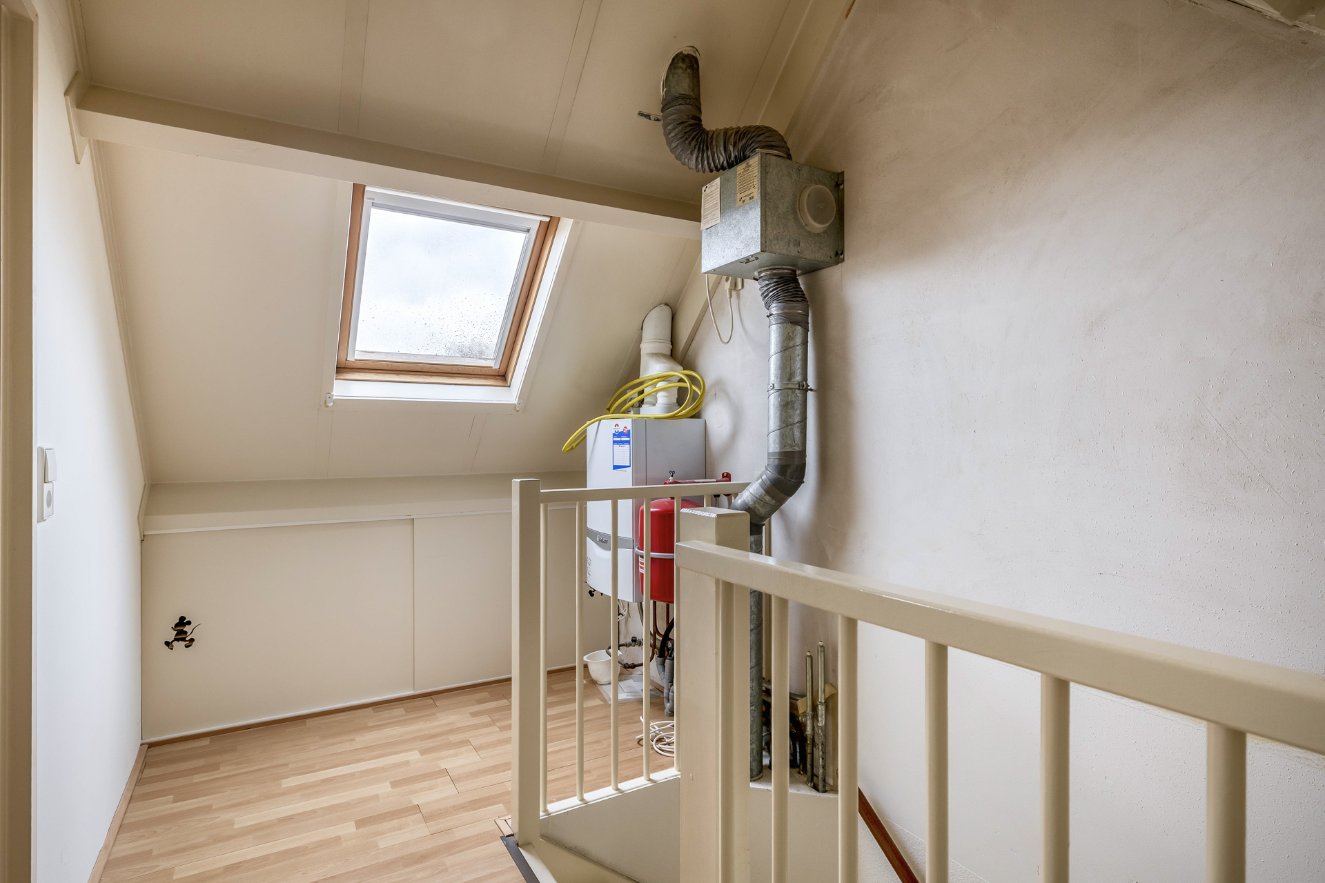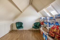 Met de vaste trap bereik je de tweede verdieping. Hier bevindt zich de derde slaapkamer, een fijne en lichte ruimte die zich perfect leent als logeerkamer, thuiskantoor of knusse kinderslaapkamer. Op de overloop vind je de CV-ketel en de aansluitingen voor witgoed, praktisch geplaatst en netjes uit het zicht. Achter de schotten vind je extra opbergruimte, ideaal voor alles wat je graag binnen handbereik hebt, maar niet in het zicht wilt.
