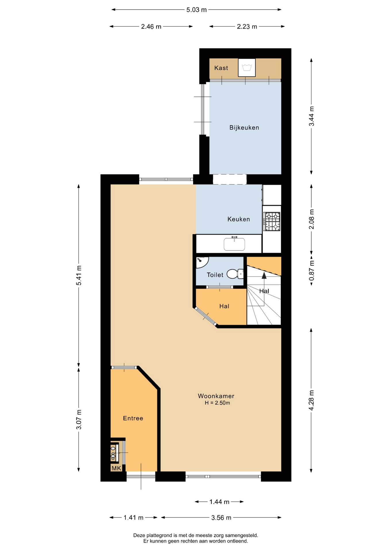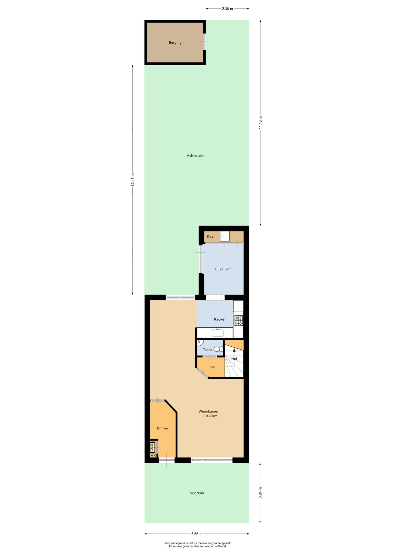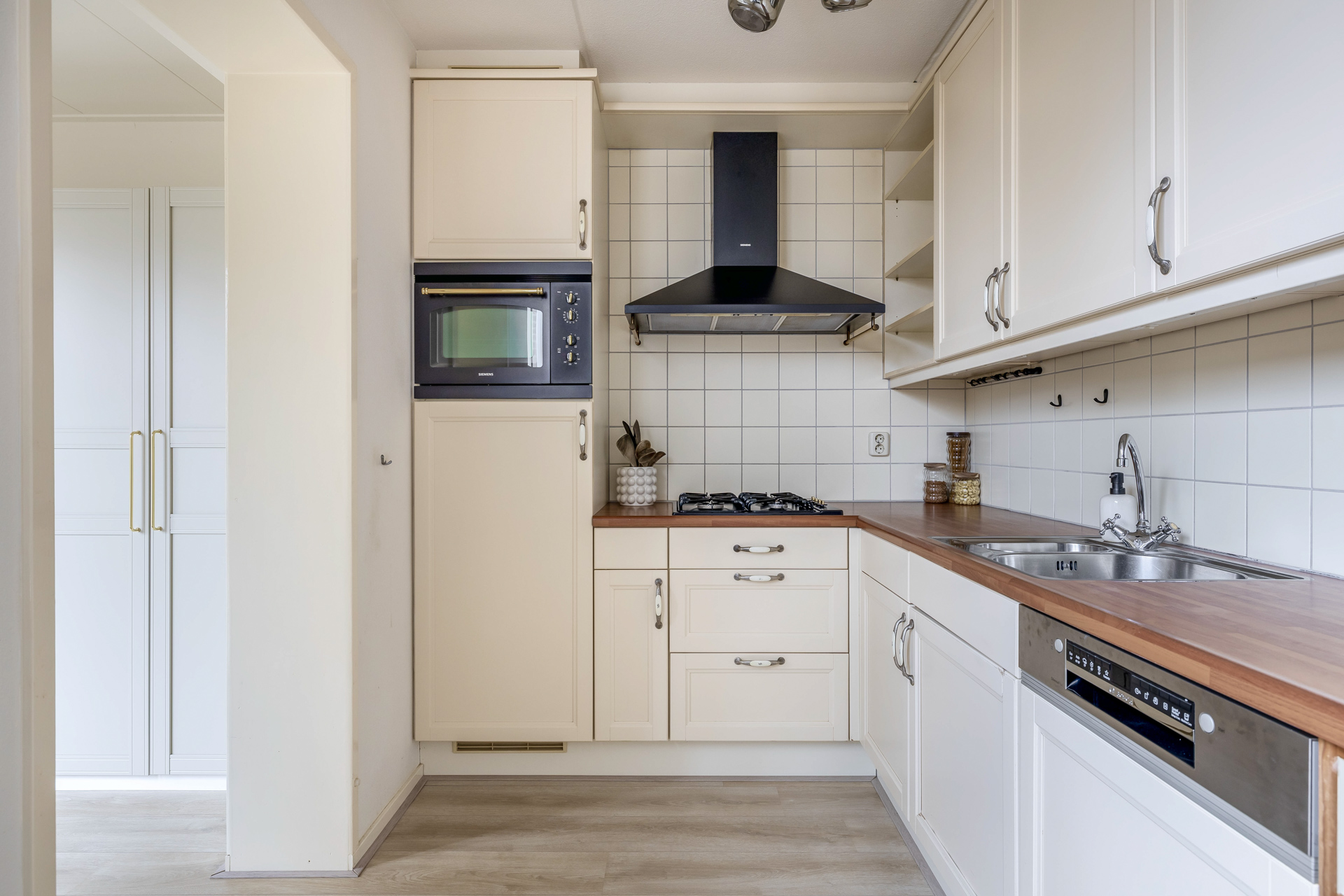 Aan de achterzijde bevindt zich de keuken, compleet met diverse apparatuur. Aangrenzend ligt de bijkeuken, royaal voorzien van kastruimte en met directe toegang tot de achtertuin, ideaal voor dagelijkse routines. Vanuit de woonkamer brengt een tweede hal, voorzien van een toilet, je naar de eerste verdieping.