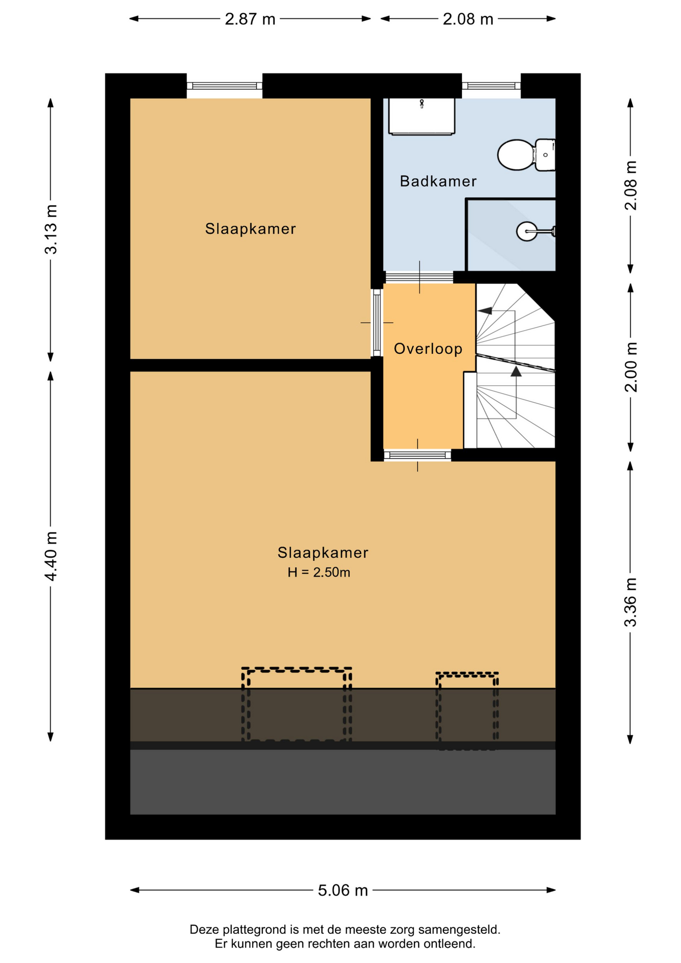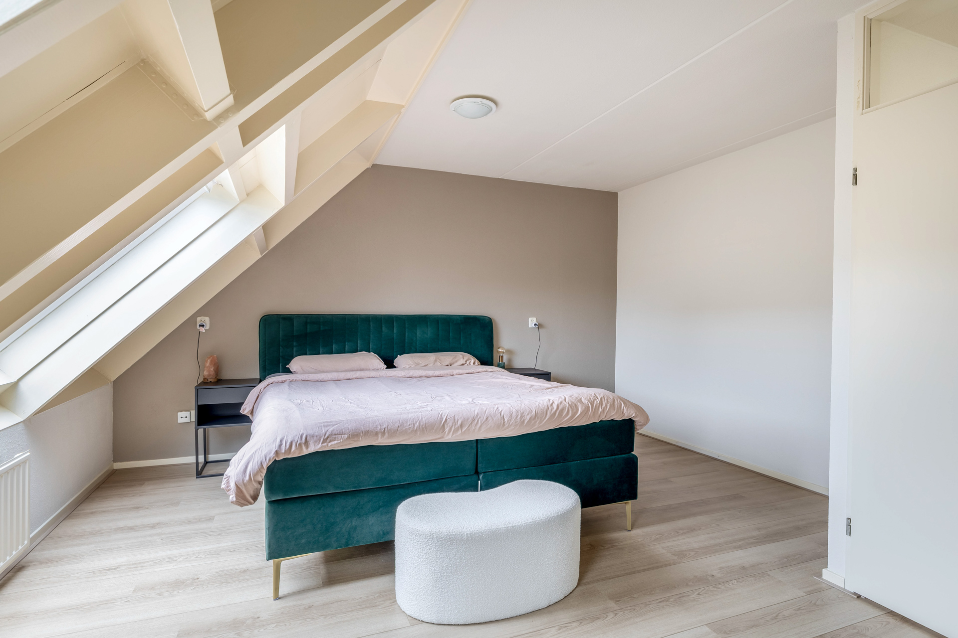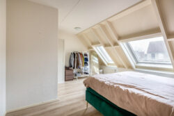 Via de overloop bereik je twee slaapkamers (voorheen drie slaapkamers) en de badkamer. Aan de voorzijde ligt de master bedroom, een royale ruimte waar de schuine daklijn zorgt voor een intieme sfeer. Twee grote dakramen laten het licht mooi binnenvallen.