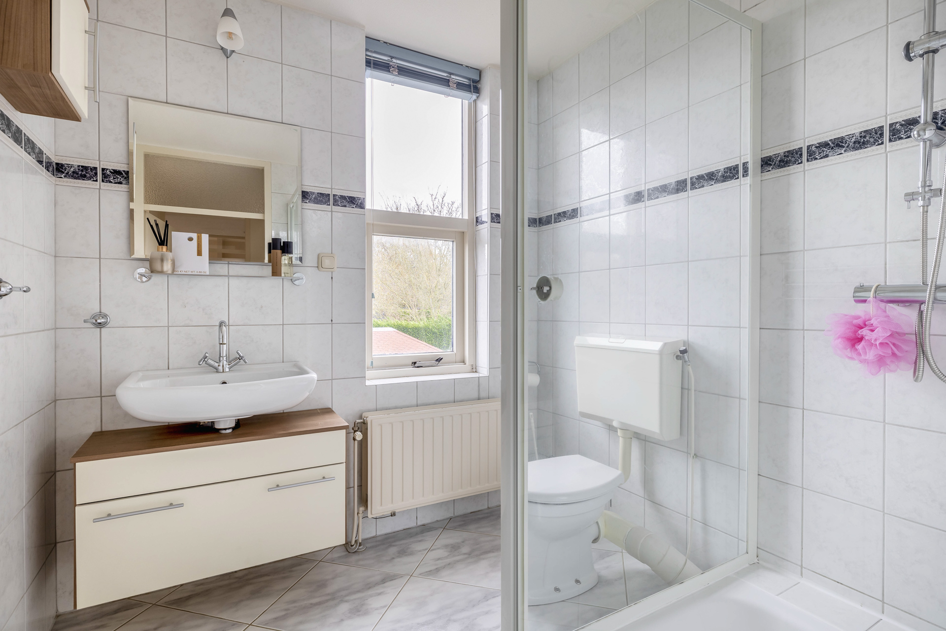 De badkamer is volledig betegeld en ingericht met een regendouche, toilet en een wastafelmeubel.