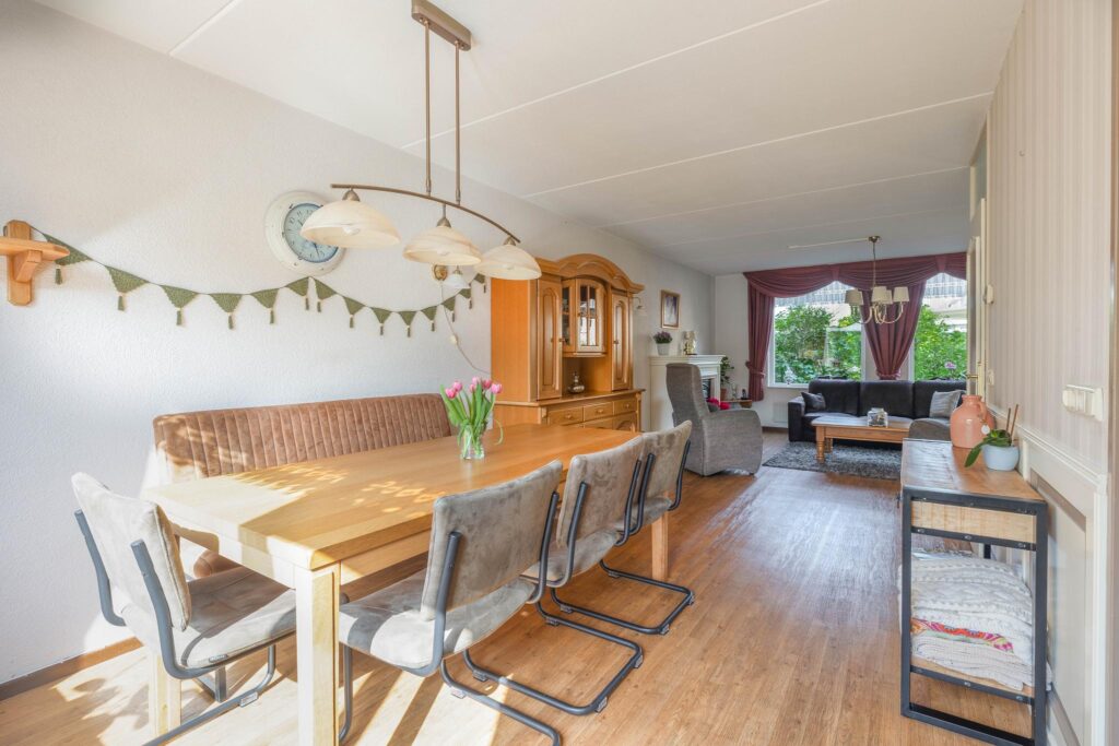 De entreehal, met meterkast, trapopgang en toilet, geeft toegang tot de woon-/eetkamer en de keuken. De woonkamer, aan de voorzijde van de woning gelegen, is voorzien van houtlook zeil. De ramen zorgen voor veel natuurlijke lichtinval. In het verlengde van de woonkamer is de eetkamer gesitueerd. Vanuit de eetkamer is de open keuken toegankelijk. De keuken, met plavuizen vloer, is voorzien van een hoekopstelling met veel opbergruimte en diverse apparatuur: kookplaat, afzuigkap, koelkast en vaatwasser. Vanuit de keuken is de achtergelegen bijkeuken bereikbaar. De bijkeuken is voorzien van de witgoedaansluitingen, een vaste kast, een deur naar de tuin en een deur naar de garage.