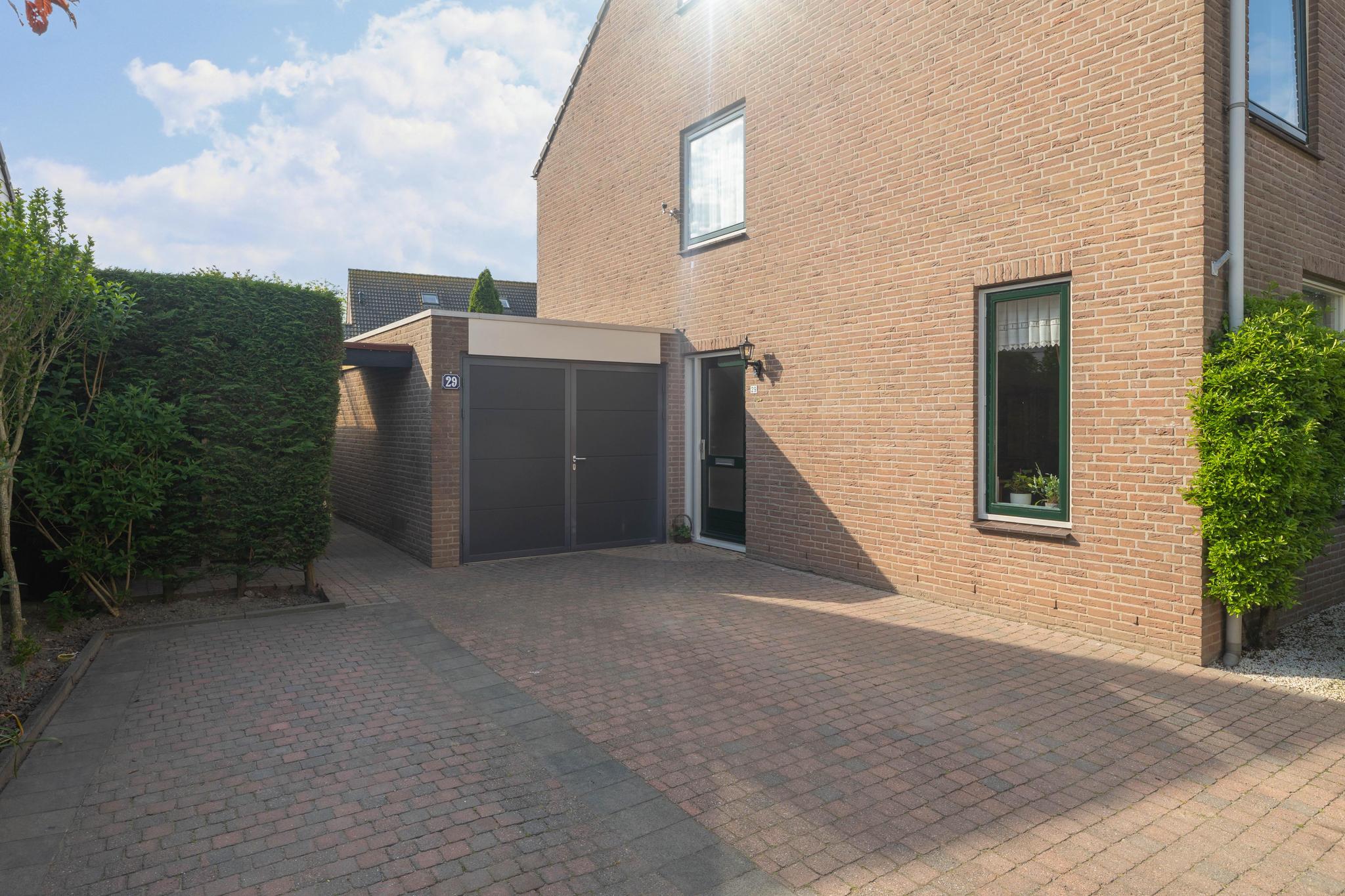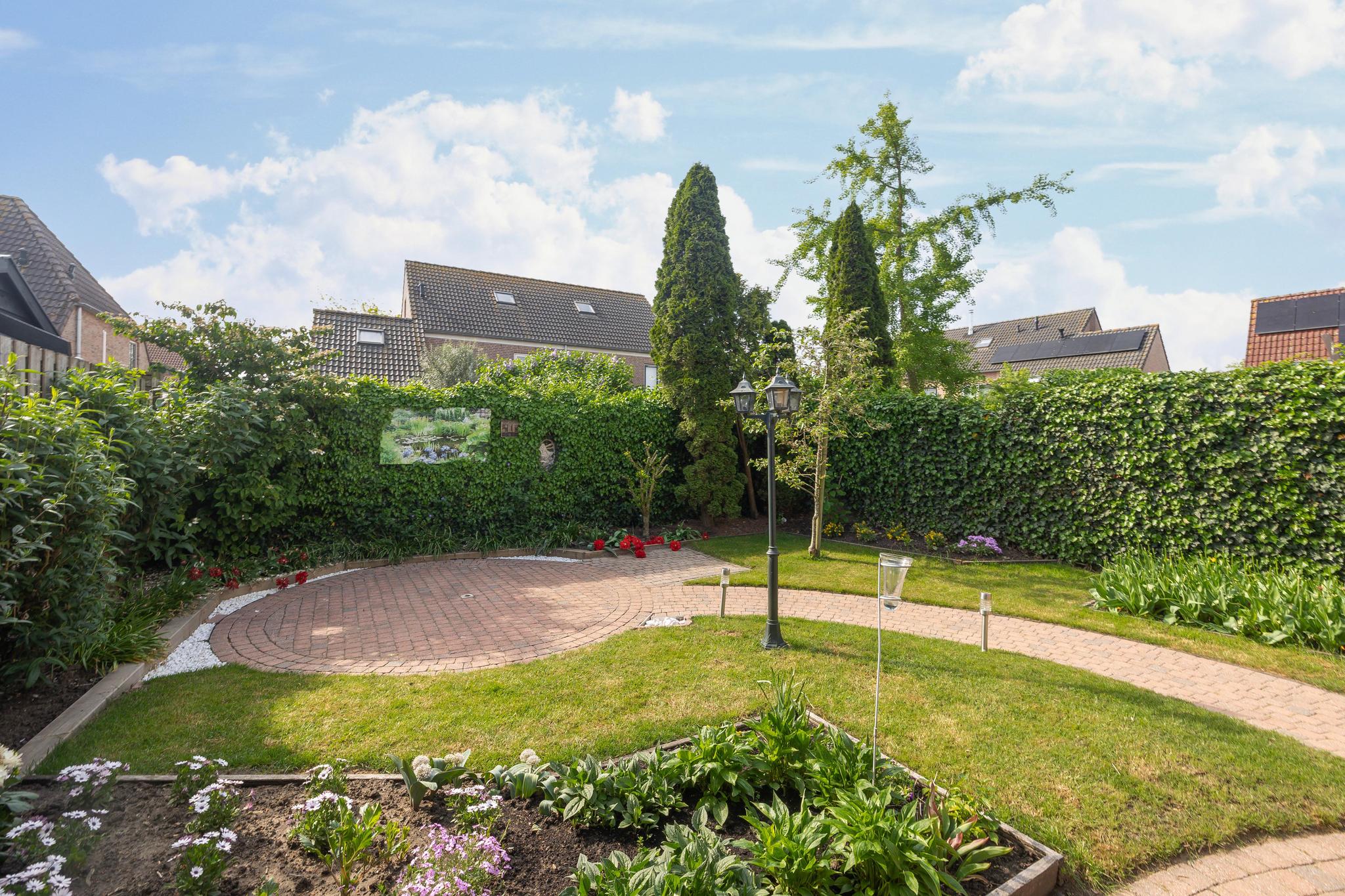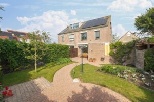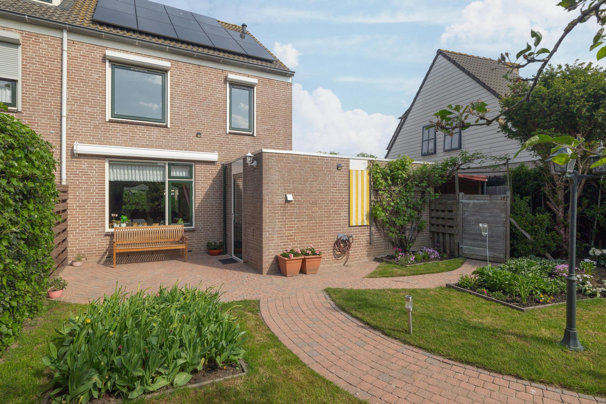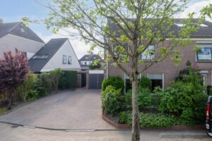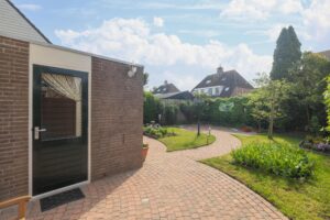 De achtertuin, gelegen op het zuiden, is heel netjes verzorgd en voorzien van een terras, gazon en borders met allerlei planten en struiken. Het is hier heerlijk vertoeven. Links van de woning staat de aangebouwde garage. De openslaande garagedeuren geven toegang tot de oprit, waar je twee auto’s kunt parkeren. Links van de garage staat een houten berging. Tussen de berging en de garage in is een pad dat toegang geeft tot de achtertuin.