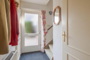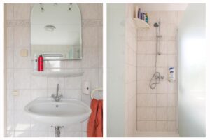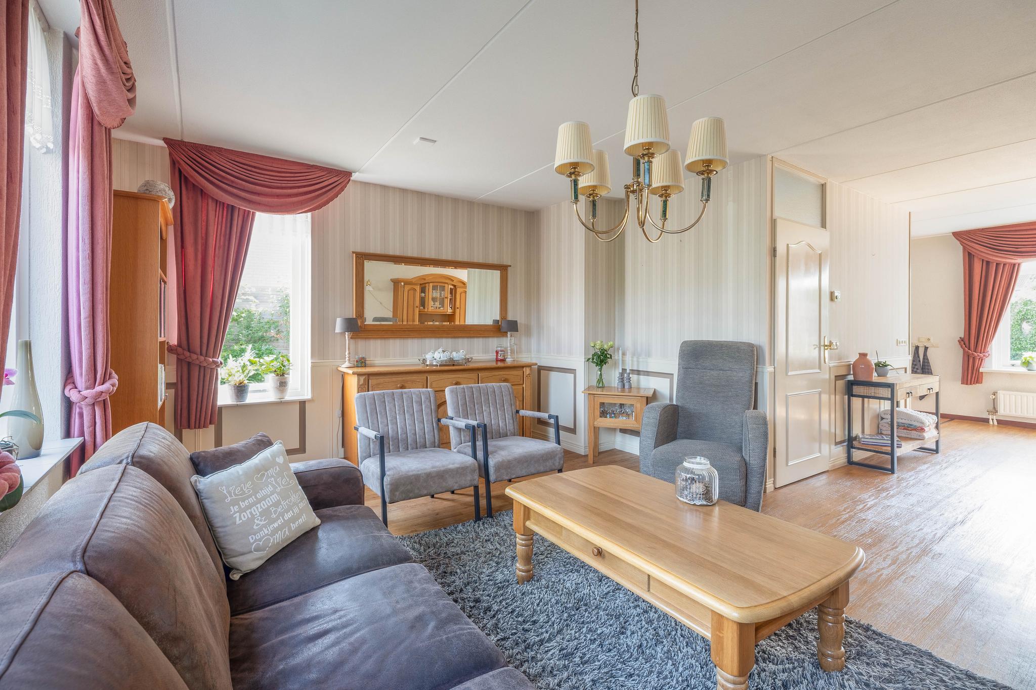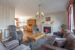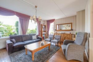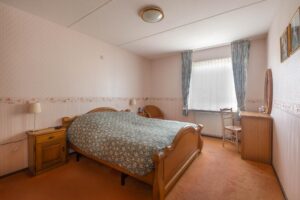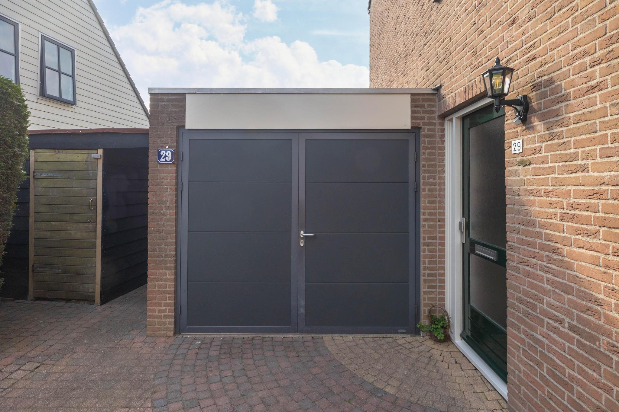 De achtertuin, gelegen op het zuiden, is heel netjes verzorgd en voorzien van een terras, gazon en borders met allerlei planten en struiken. Het is hier heerlijk vertoeven. Links van de woning staat de aangebouwde garage. De openslaande garagedeuren geven toegang tot de oprit, waar je twee auto’s kunt parkeren. Links van de garage staat een houten berging. Tussen de berging en de garage in is een pad dat toegang geeft tot de achtertuin.