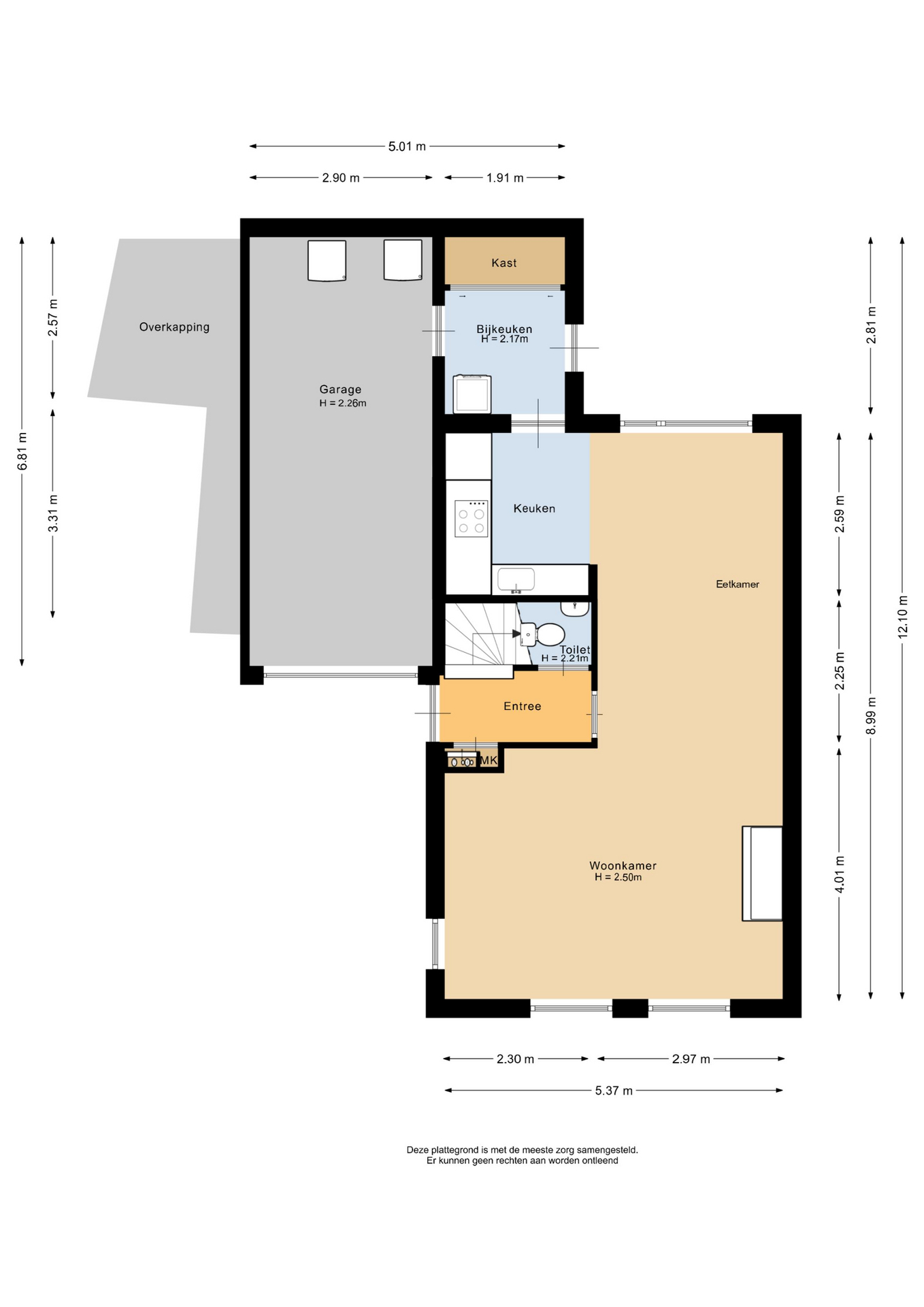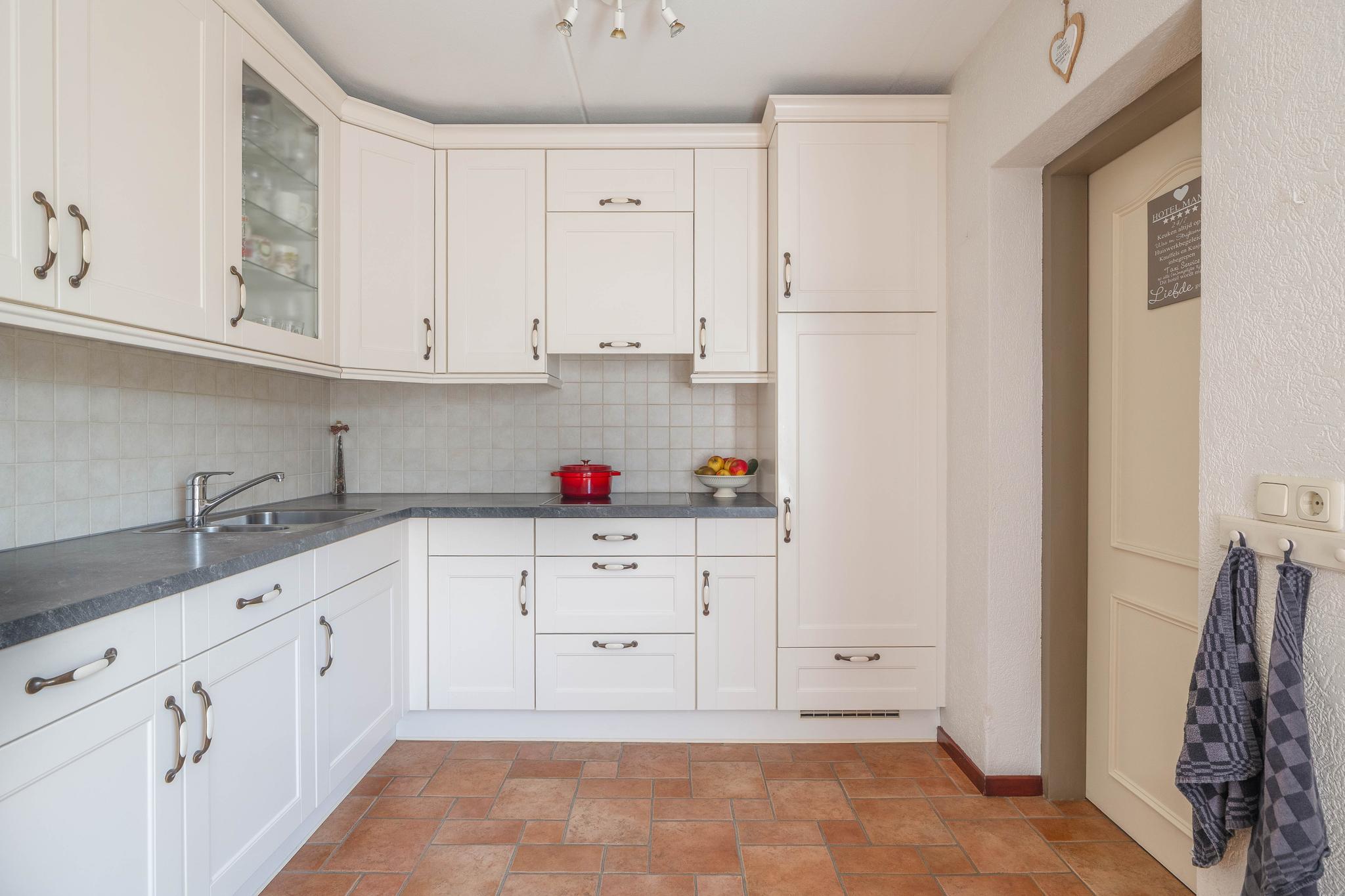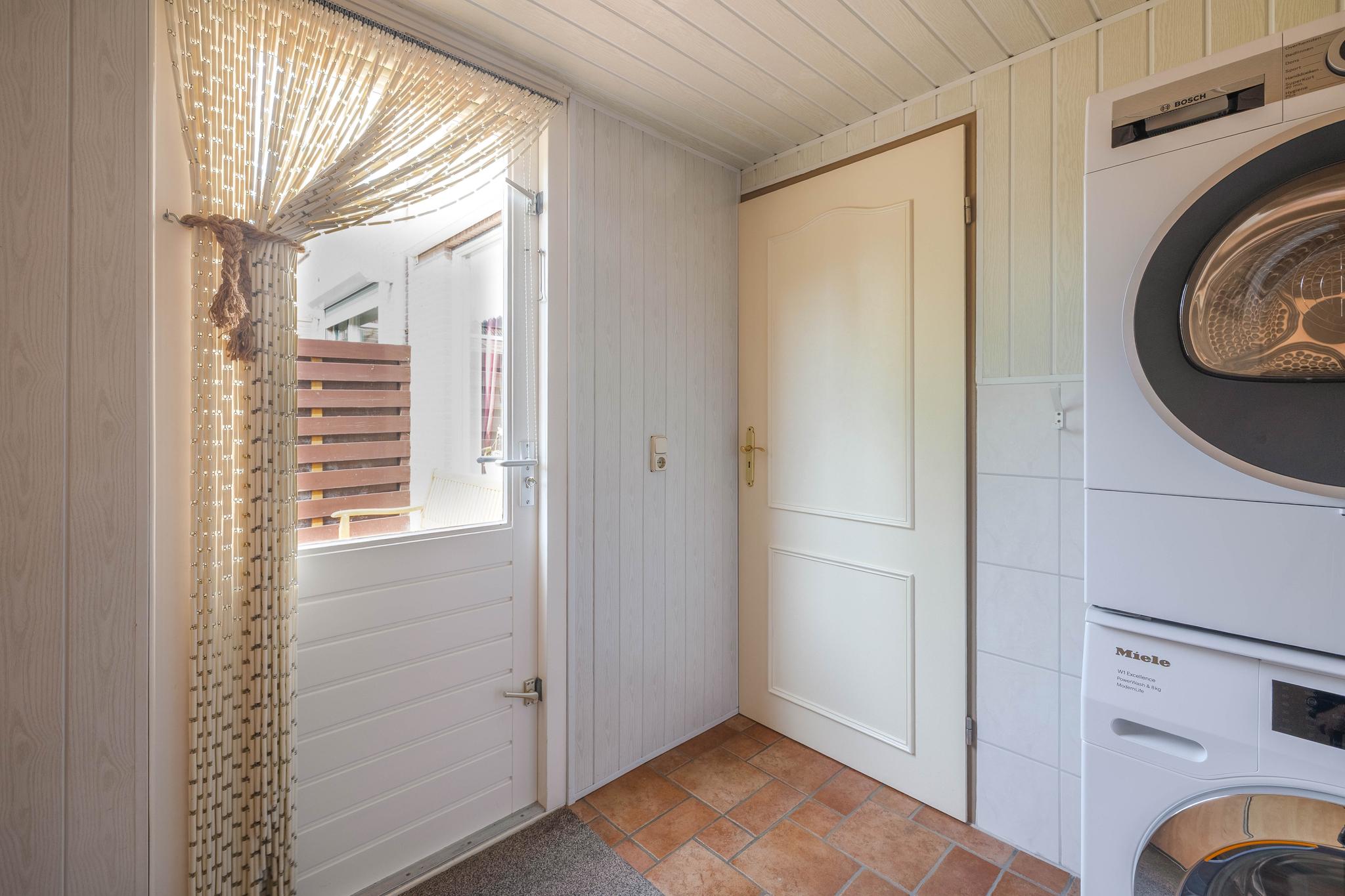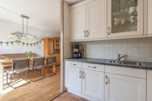 De entreehal, met meterkast, trapopgang en toilet, geeft toegang tot de woon-/eetkamer en de keuken. De woonkamer, aan de voorzijde van de woning gelegen, is voorzien van houtlook zeil. De ramen zorgen voor veel natuurlijke lichtinval. In het verlengde van de woonkamer is de eetkamer gesitueerd. Vanuit de eetkamer is de open keuken toegankelijk. De keuken, met plavuizen vloer, is voorzien van een hoekopstelling met veel opbergruimte en diverse apparatuur: kookplaat, afzuigkap, koelkast en vaatwasser. Vanuit de keuken is de achtergelegen bijkeuken bereikbaar. De bijkeuken is voorzien van de witgoedaansluitingen, een vaste kast, een deur naar de tuin en een deur naar de garage.