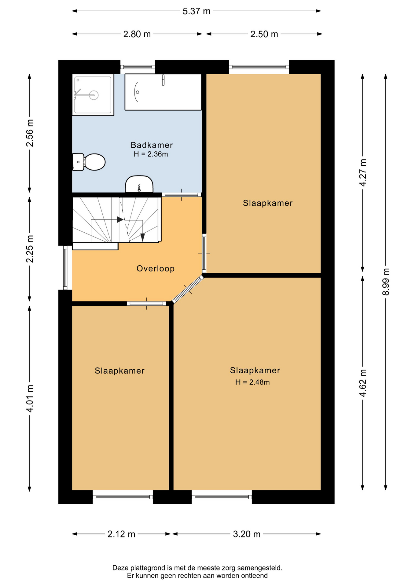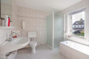 De overloop geeft toegang tot drie slaapkamers en de badkamer. De slaapkamers zijn voorzien van vloerbedekking of een laminaatvloer. De ramen zorgen voor veel lichtinval. De ruime badkamer is geheel betegeld en voorzien van een ligbad, een douche, een toilet, een wastafel en een designradiator.