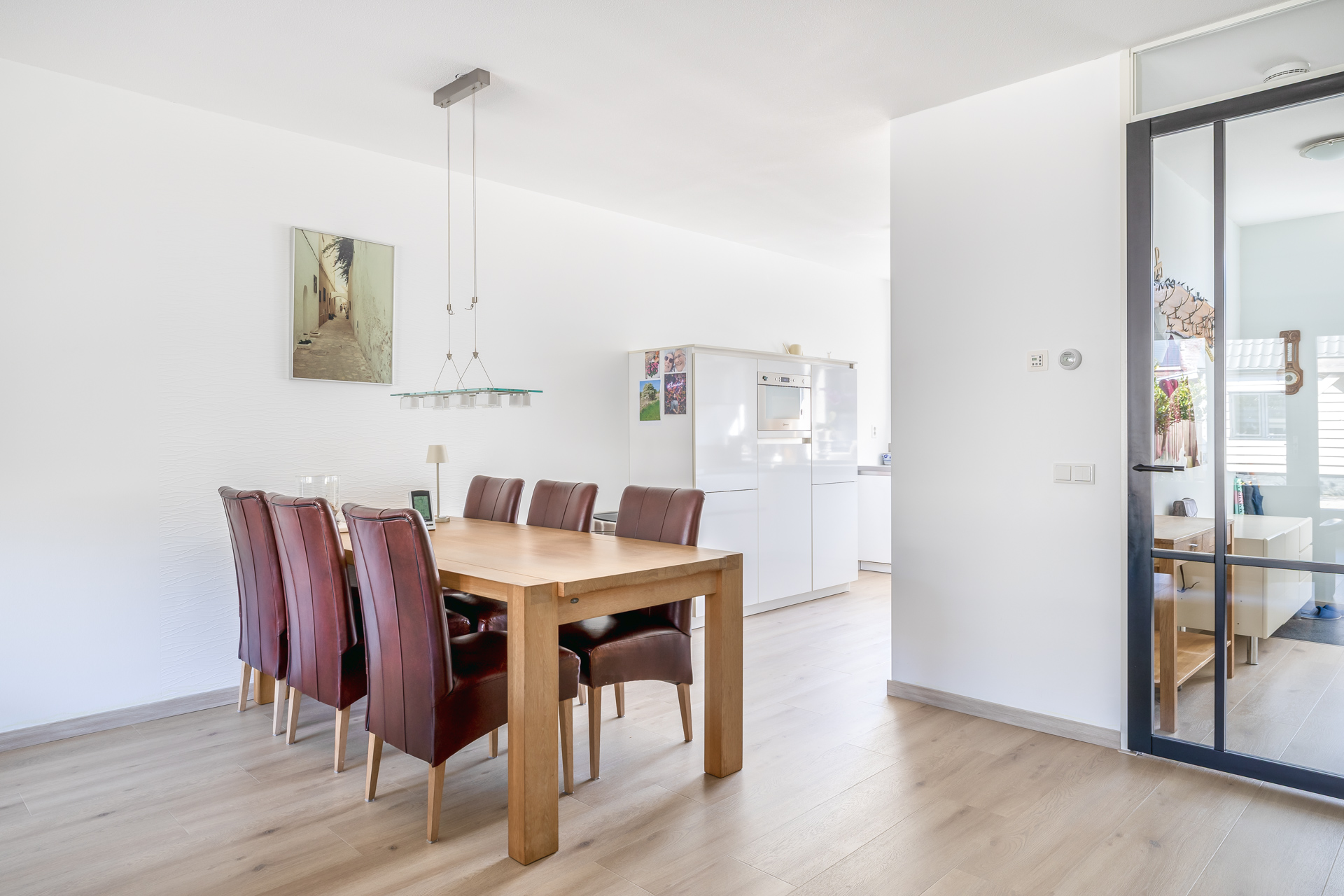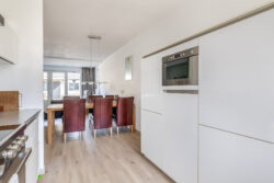 Aan de voorzijde bevindt zich de moderne hoekkeuken die beschikt over veel bergruimte en is voorzien van diverse inbouwapparatuur. De gehele begane grond is afgewerkt met een comfortabele vloer voorzien van vloerverwarming, wat bijdraagt aan een aangenaam woonklimaat.