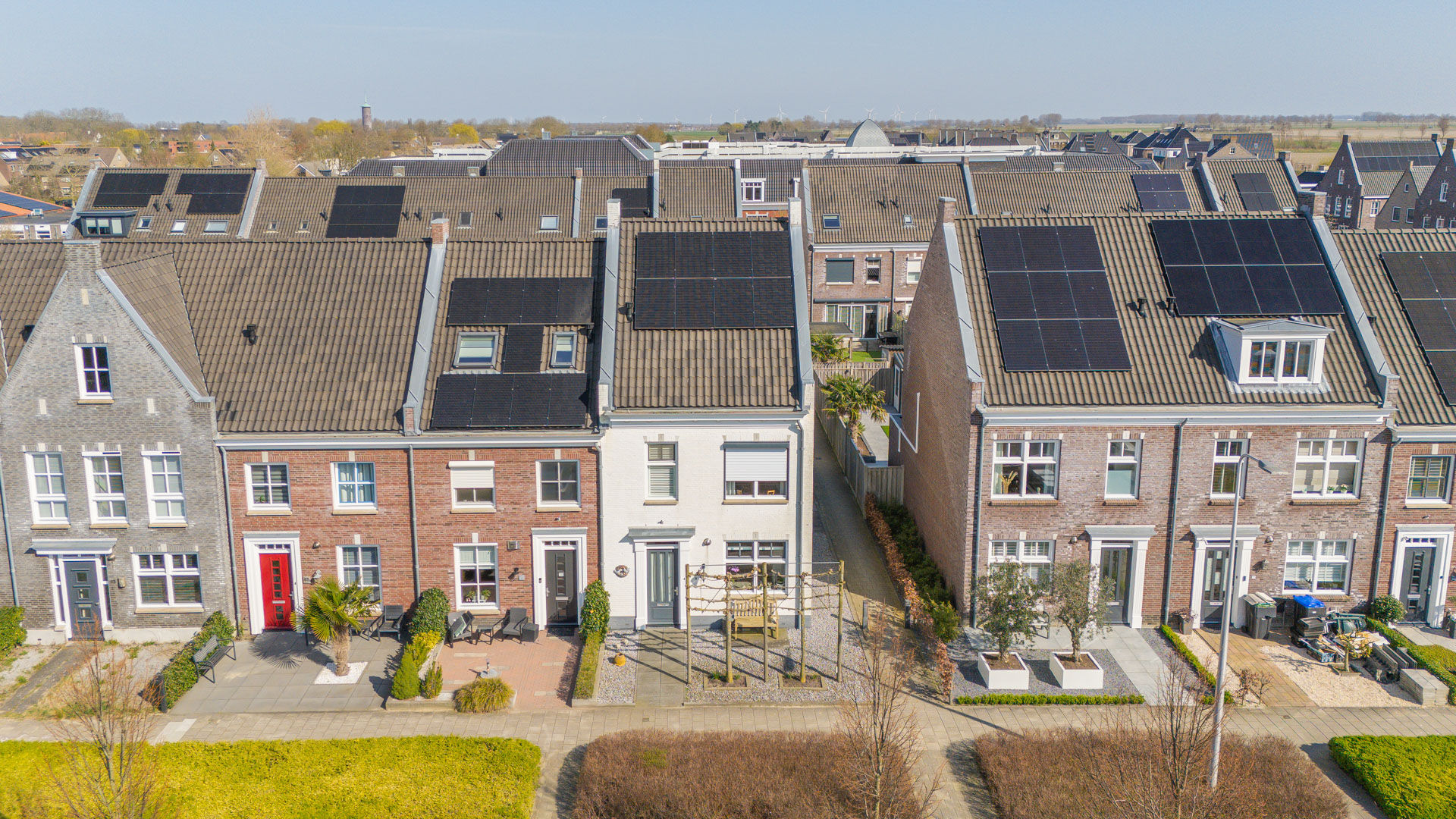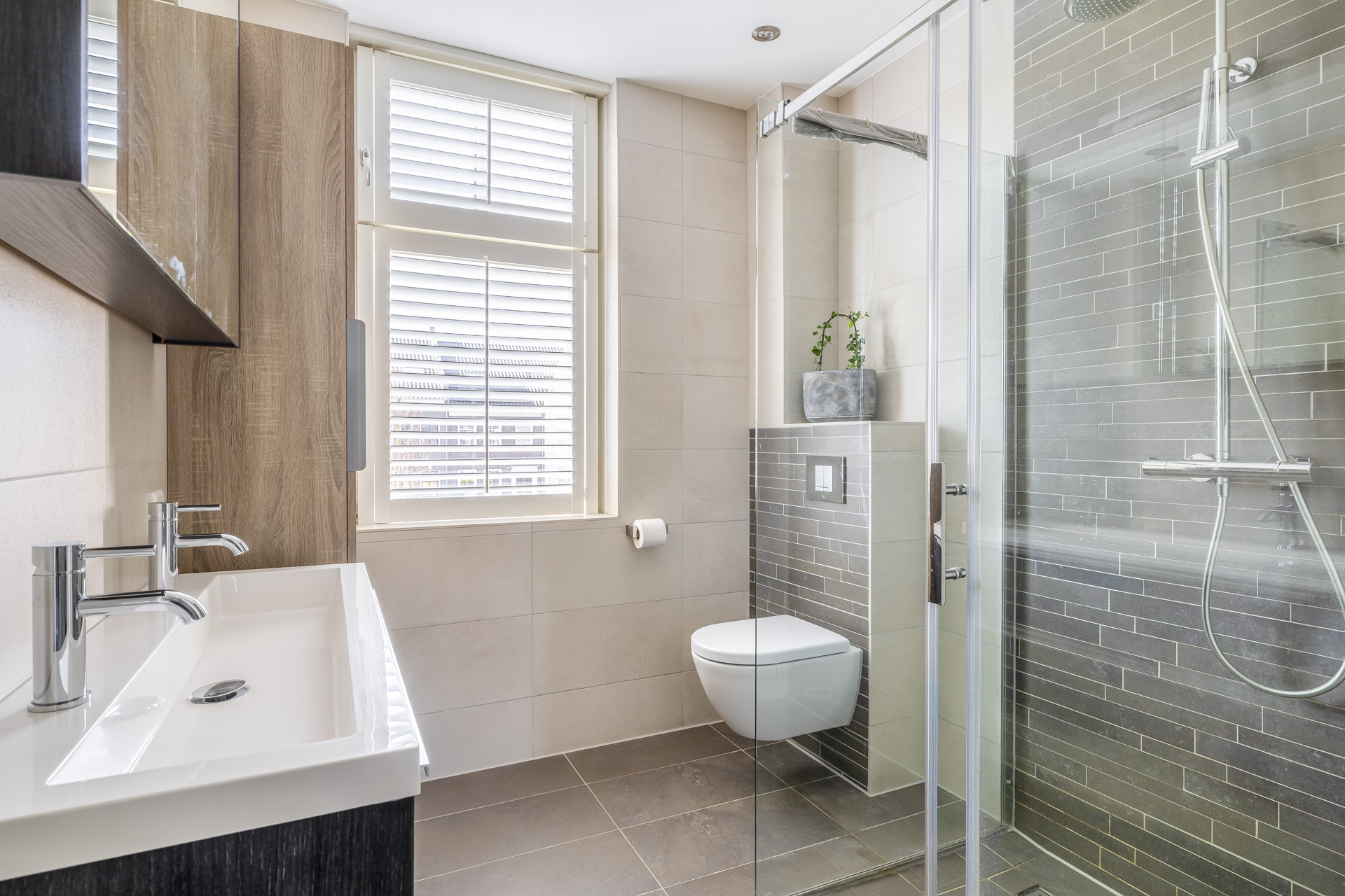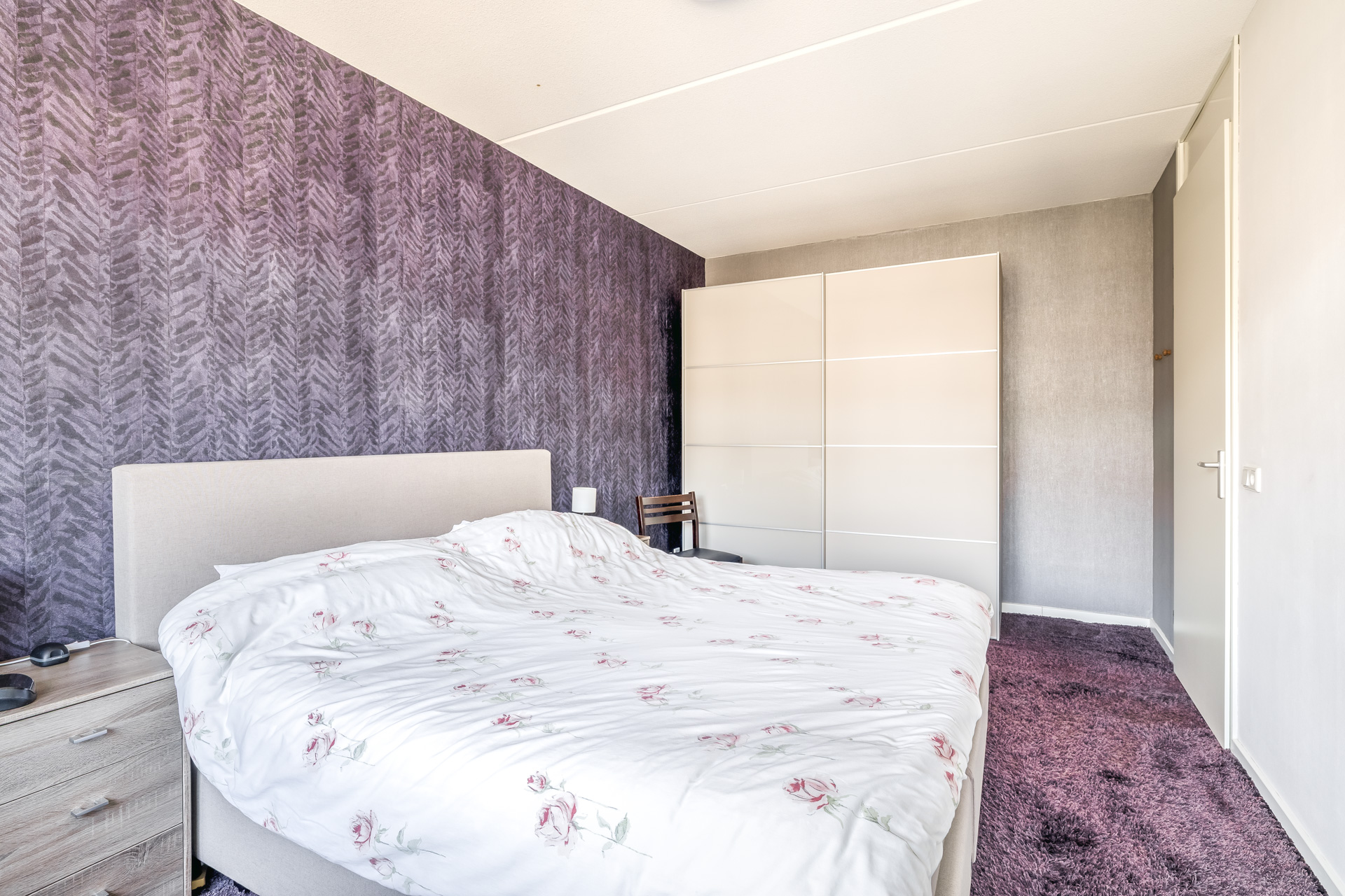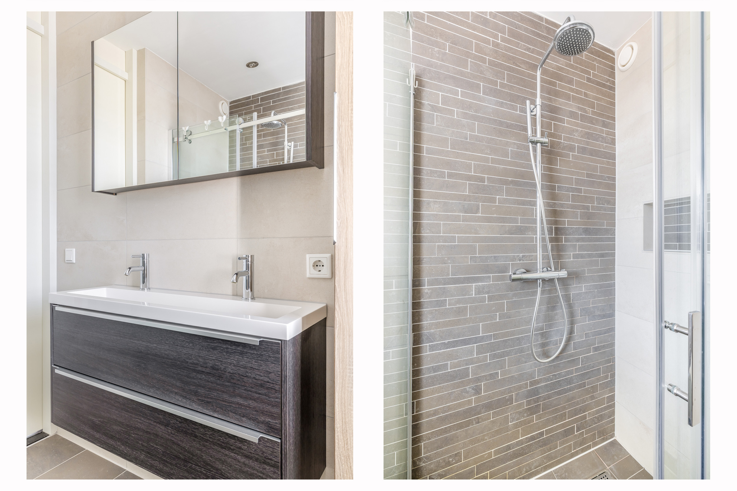 De overloop geeft toegang tot drie ruime en lichte slaapkamers, de badkamer en een vaste trap naar de tweede verdieping. De nette badkamer is compleet ingericht met een inloopdouche, een dubbele wastafel en een toilet. Ook deze verdieping is volledig voorzien van vloerverwarming, wat zorgt voor extra comfort.