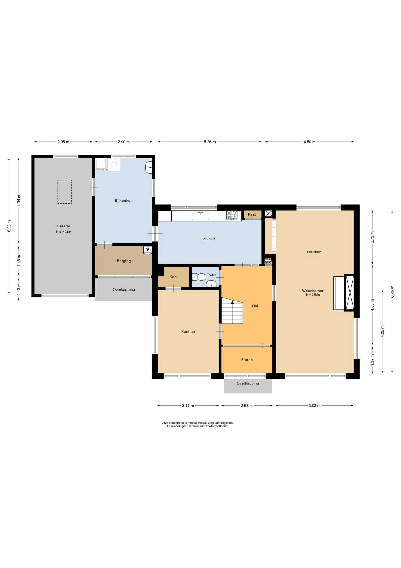 Middels de entree kom je in de hal, met meterkast en toilet. Deze hal geeft toegang tot het aan de voorzijde gelegen kantoor en de woonkamer. De doorzonwoonkamer heeft een gezellige open haard en veel lichtinval. De keuken is voorzien van diverse inbouwapparatuur, zoals kookplaat, afzuigkap, oven, koelkast en vaatwasser. Via de keuken zijn de bijkeuken en berging te bereiken. In deze berging is de CV-ketel geplaatst. Vanuit de bijkeuken (voorzien van witgoedaansluitingen) kun je de garage en achtertuin betreden.