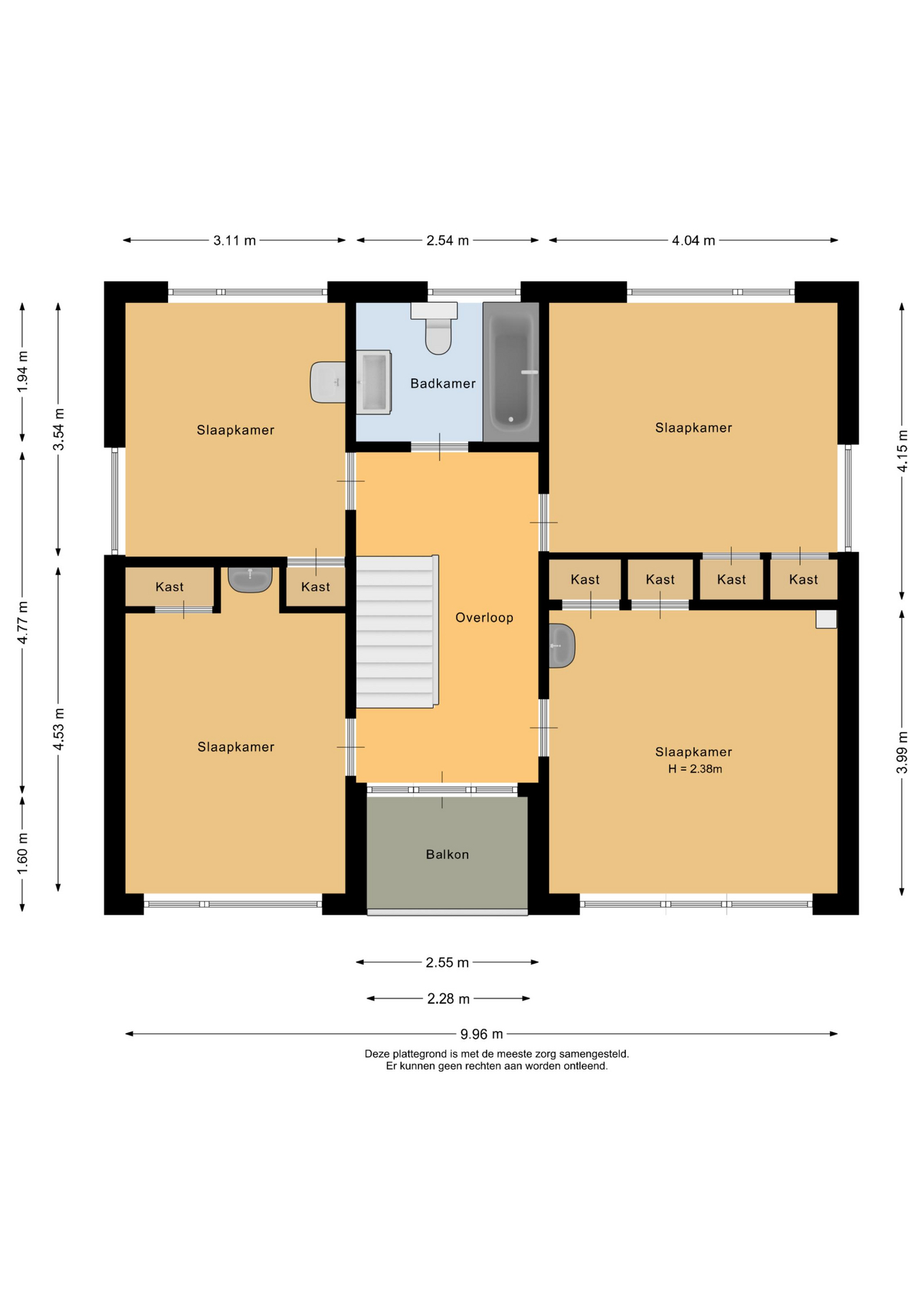 De royale overloop geeft toegang tot alle vertrekken op de eerste verdieping. Dit zijn vier slaapkamers, de badkamer en ook het aan de voorzijde gelegen balkon. De slaapkamers beschikken allemaal over een inbouwkast. De badkamer is voorzien van vloerverwarming, een ligbad, een toilet en een wastafelmeubel.