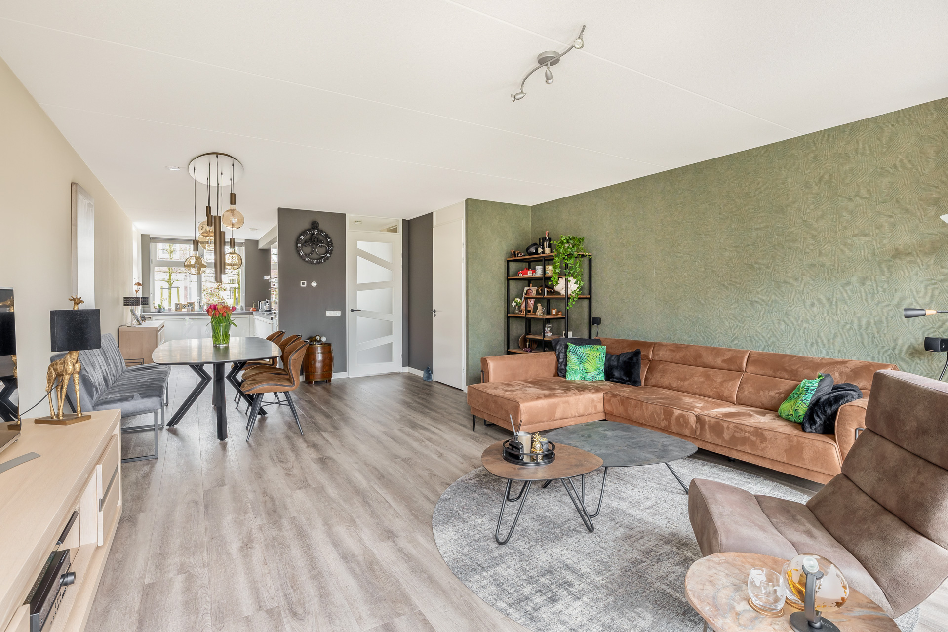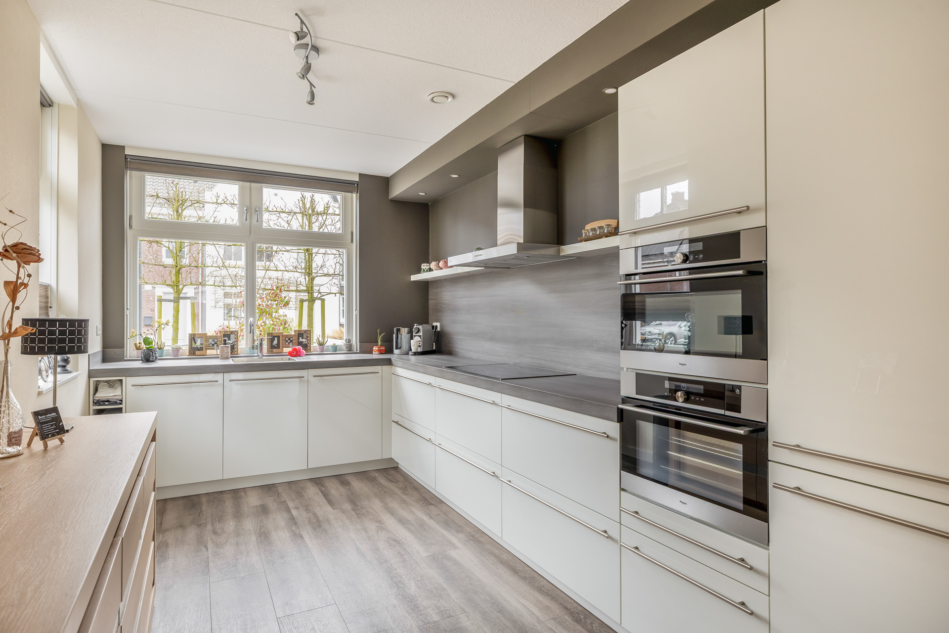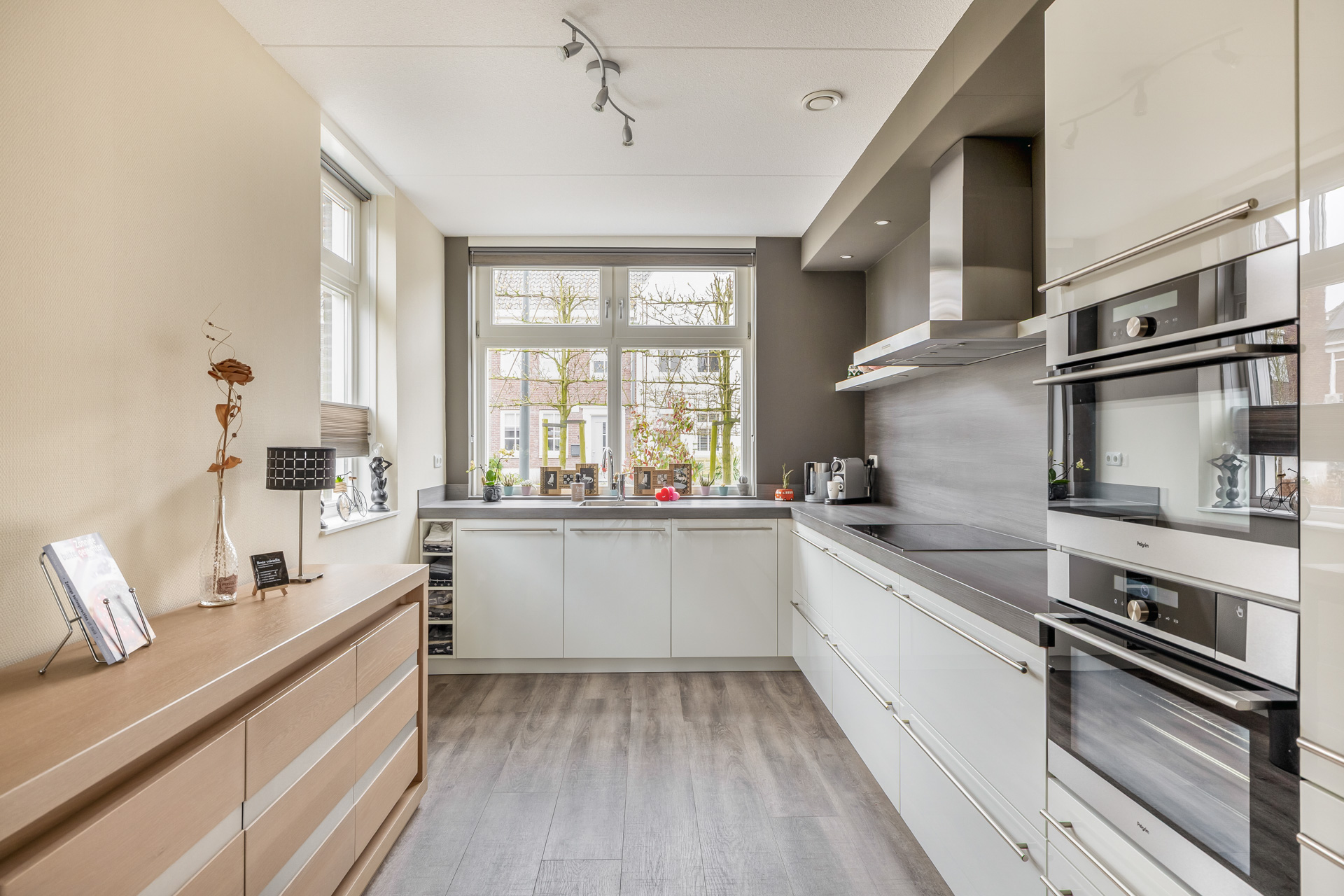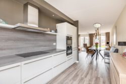 Via de verzorgde entreehal, voorzien van meterkast en toilet, betreed je de royale woonkamer met open keuken. Het daglicht stroomt rijkelijk naar binnen dankzij de dubbele openslaande deuren, die niet alleen zorgen voor een lichte ambiance, maar ook een elegante verbinding creëren met het terras. De open keuken aan de voorzijde is compleet uitgerust met diverse inbouwapparatuur en is een plek waar koken en samenzijn samenkomen. De vloerverwarming op deze verdieping zorgt voor een aangenaam en gelijkmatig comfort.