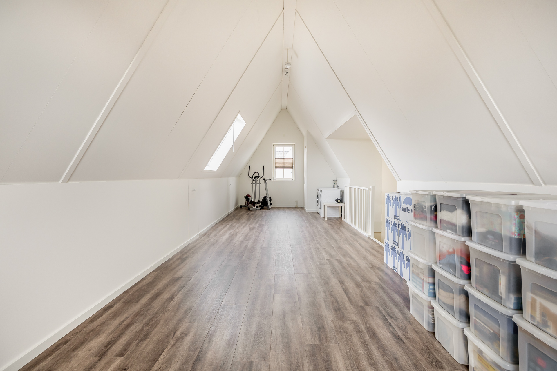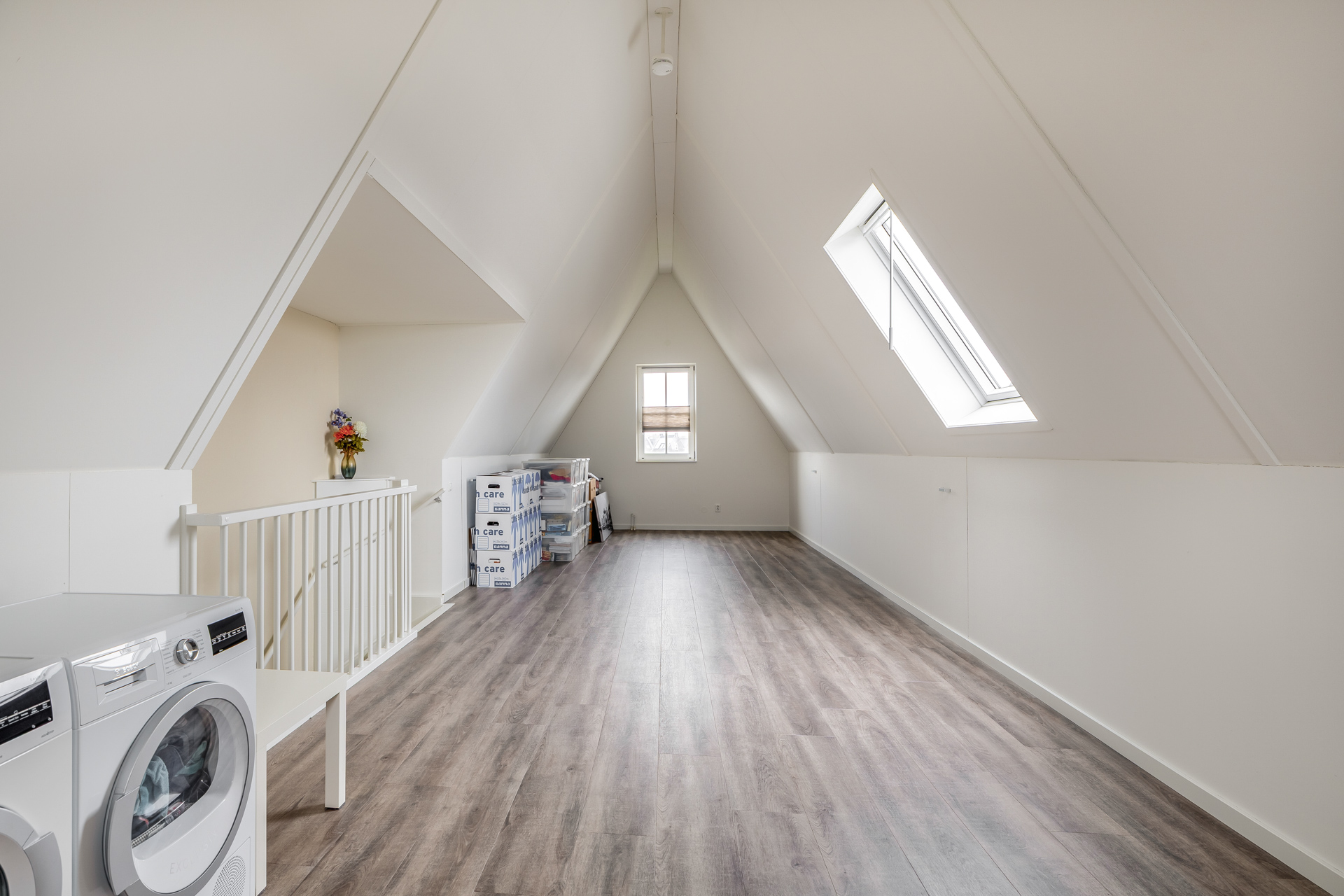 Via een vaste trap bereik je de tweede verdieping, een royale en veelzijdige ruimte die zich moeiteloos aanpast aan jouw woonwensen. Of je nu droomt van een extra slaapkamer, een inspirerende werkplek of een rustige hobbyruimte, hier ontstaat de vrijheid om jouw ideale invulling te creëren. De grote (dak)ramen laten het daglicht zacht binnenvallen en maken deze verdieping tot een aangename plek om te verblijven. Tevens bevinden zich hier de aansluitingen voor witgoed.