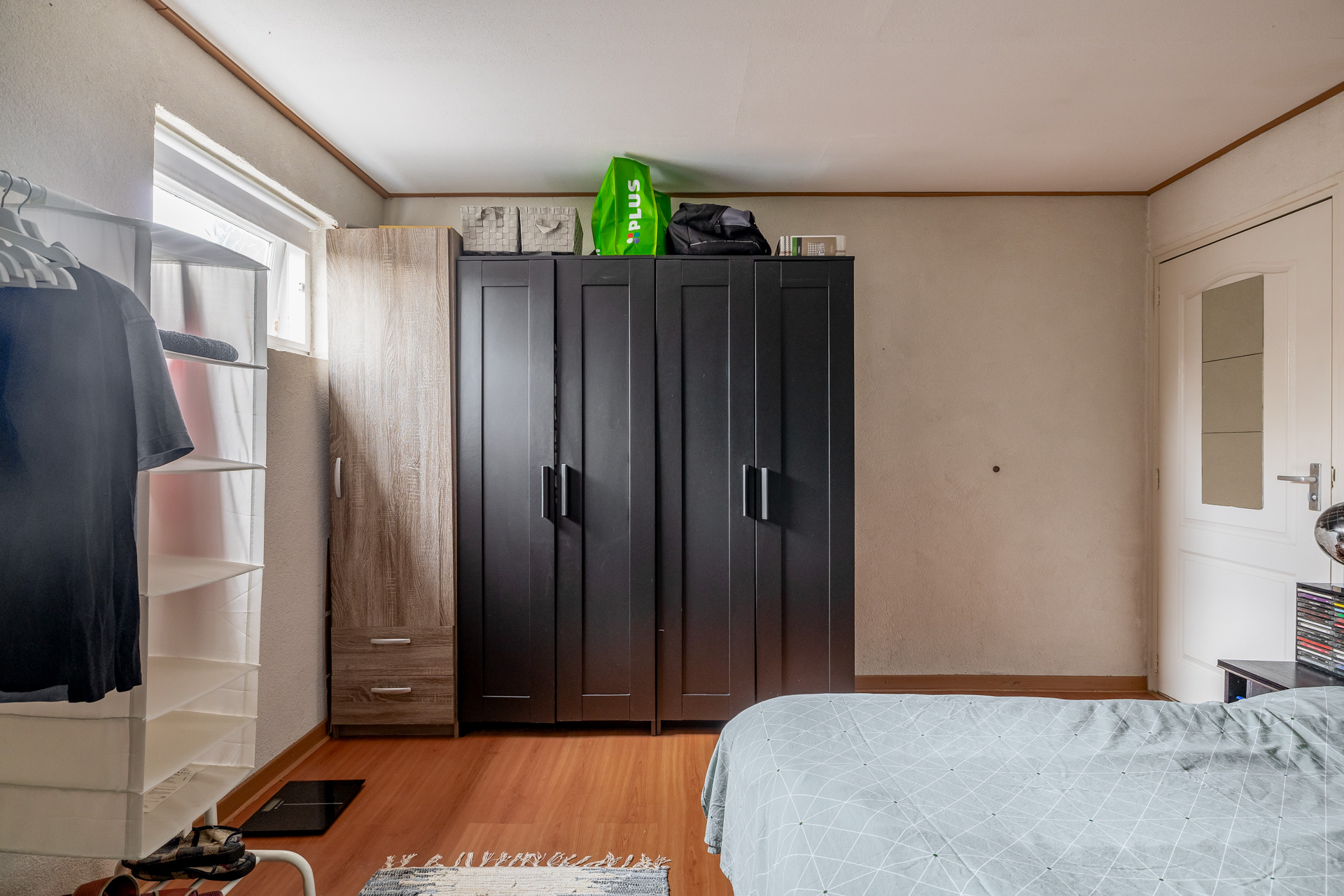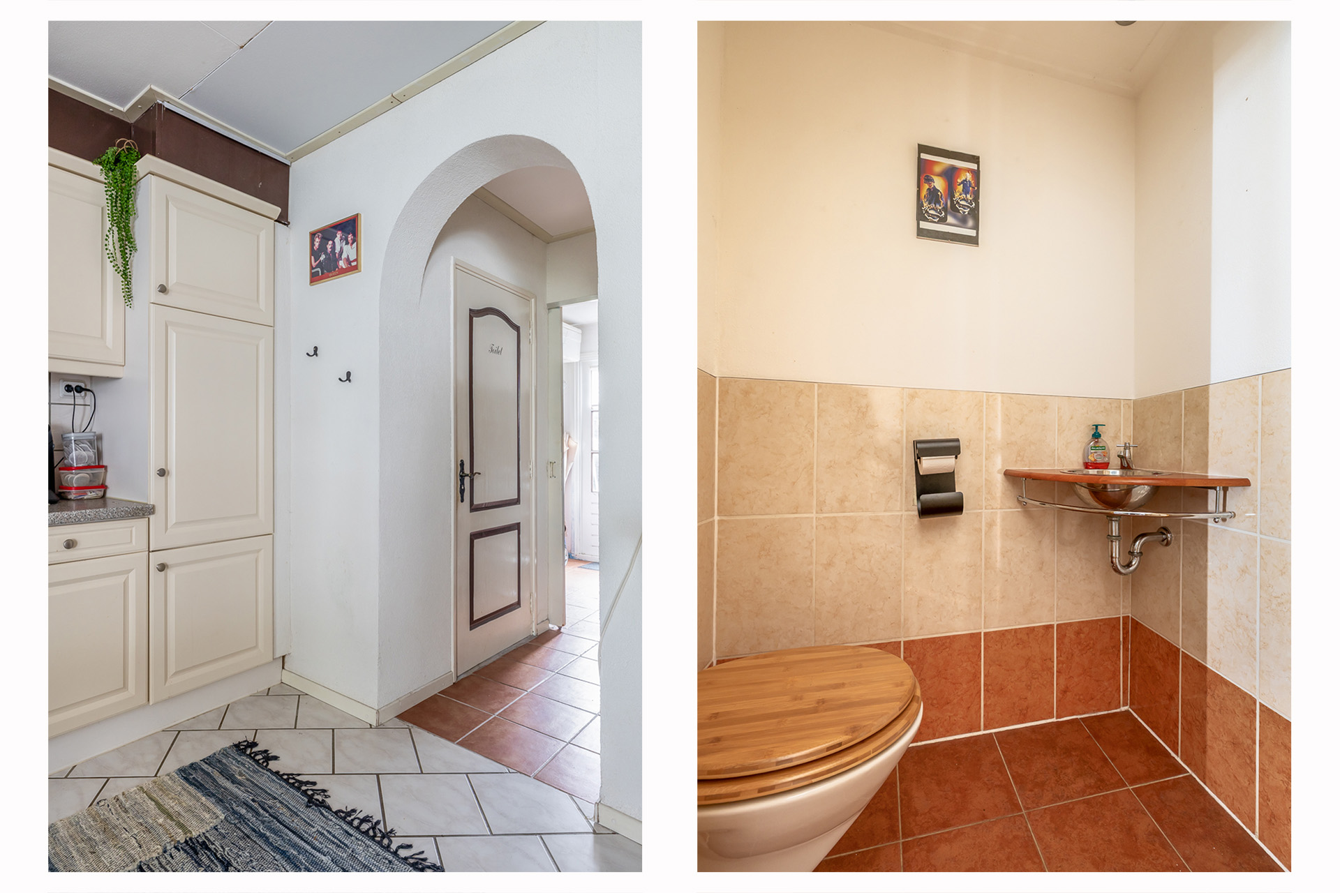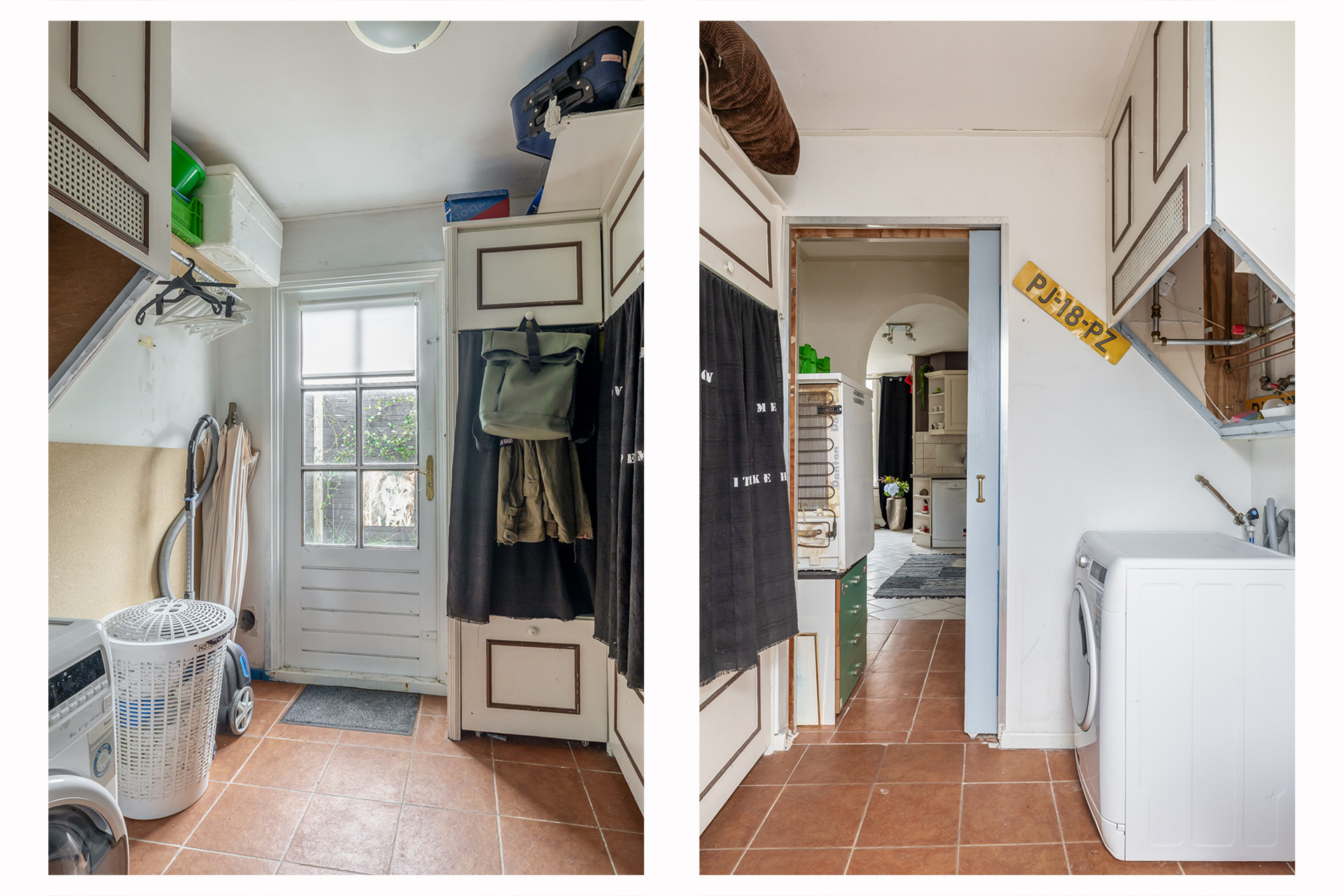 Via de keuken bereik je de achterhal met toegang tot het toilet en de bijkeuken. De bijkeuken is voorzien van witgoedaansluitingen en een deur naar de tuin. Ook de slaapkamer op de begane grond is vanuit de woonkamer bereikbaar en voorzien van een laminaatvloer.