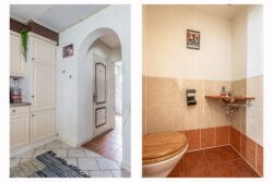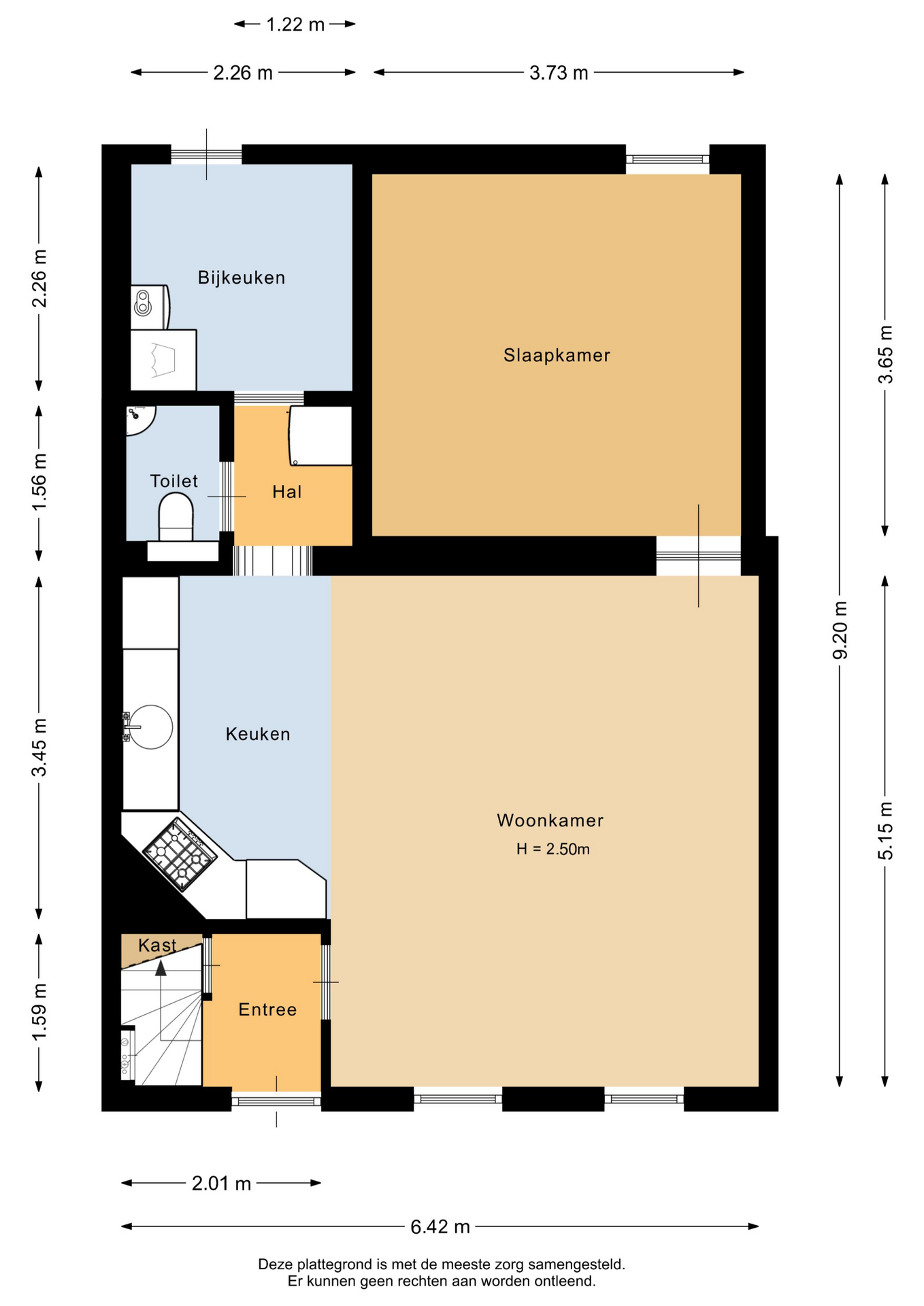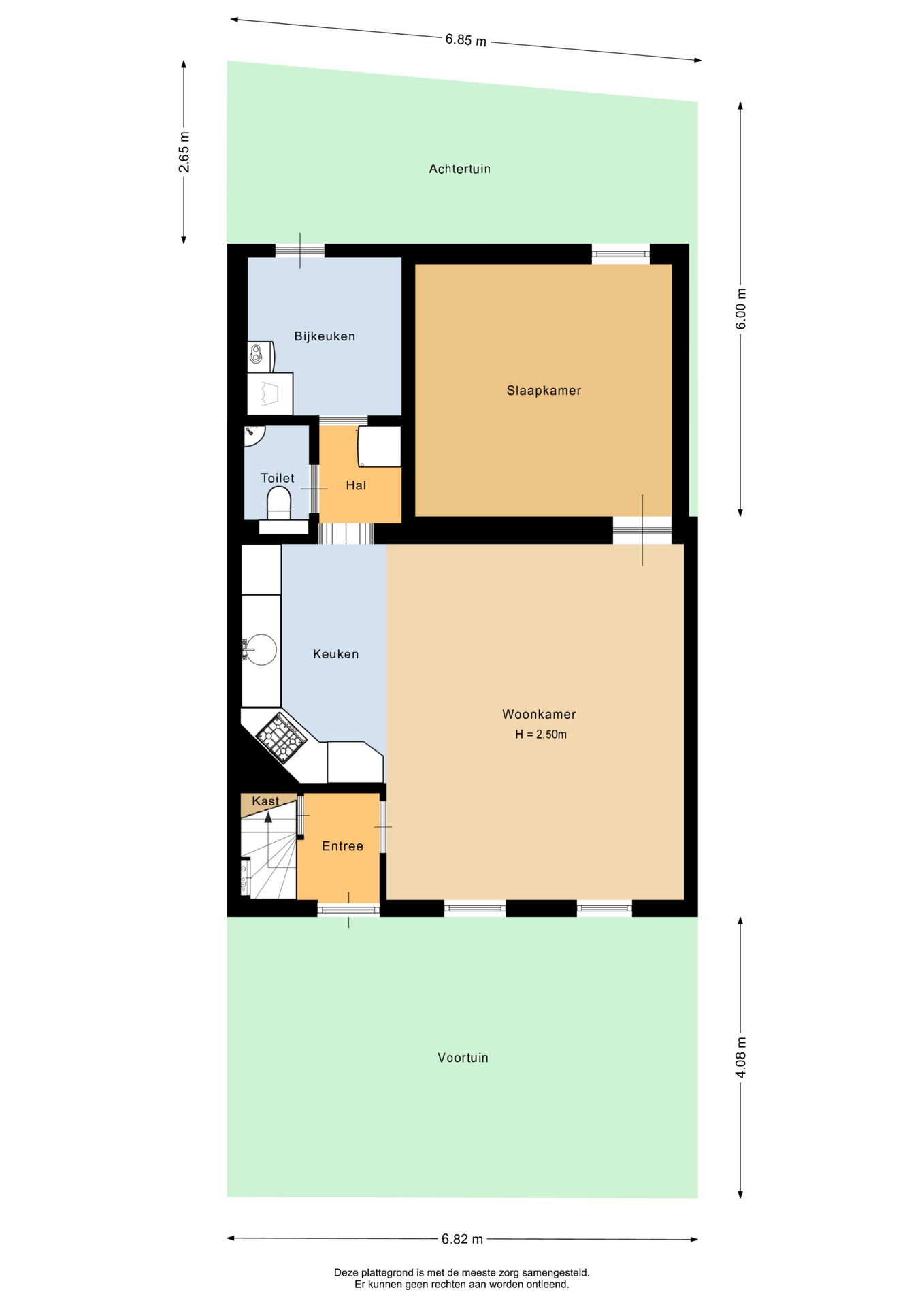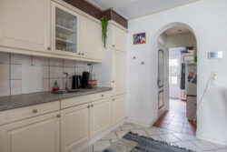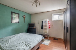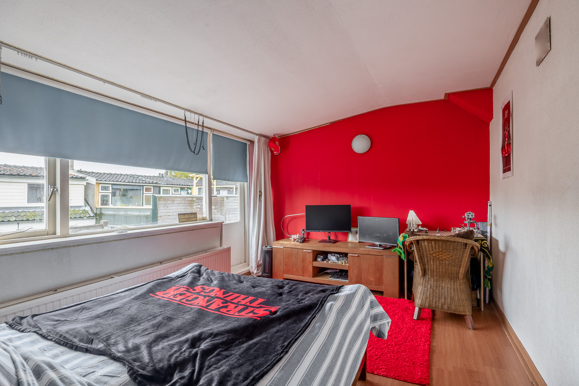 Via de keuken bereik je de achterhal met toegang tot het toilet en de bijkeuken. De bijkeuken is voorzien van witgoedaansluitingen en een deur naar de tuin. Ook de slaapkamer op de begane grond is vanuit de woonkamer bereikbaar en voorzien van een laminaatvloer.