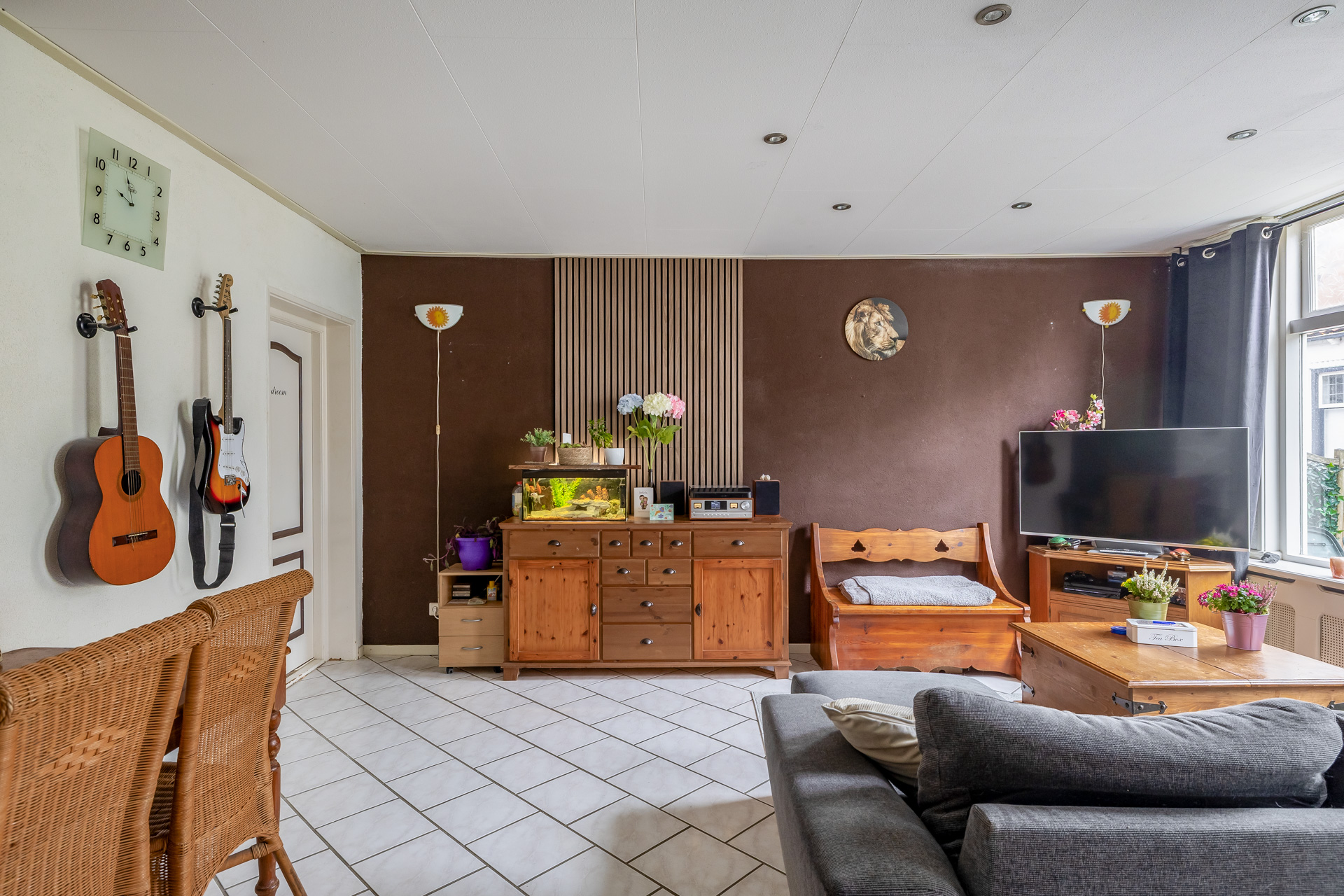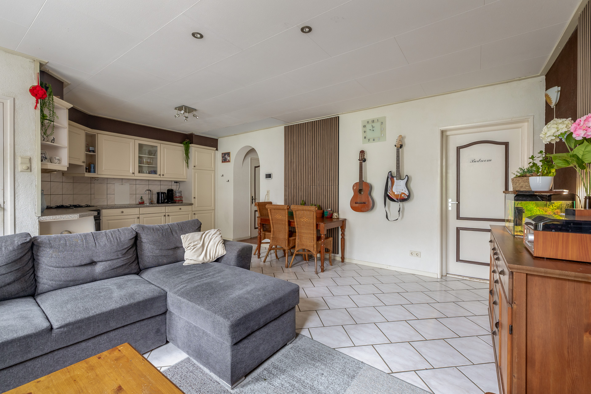 Via de entreehal, met trapopgang, kom je binnen in de gezellige woon-/eetkamer. Deze ligt aan de voorzijde en is voorzien van een plavuizen vloer en inbouwspots. Dankzij de grote raampartijen geniet je hier van volop natuurlijk licht.