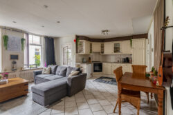 De open hoekkeuken sluit mooi aan op de woonkamer en biedt voldoende kastruimte en diverse inbouwapparatuur zoals een kookplaat, afzuigkap, oven, koelkast en vaatwasser.