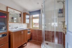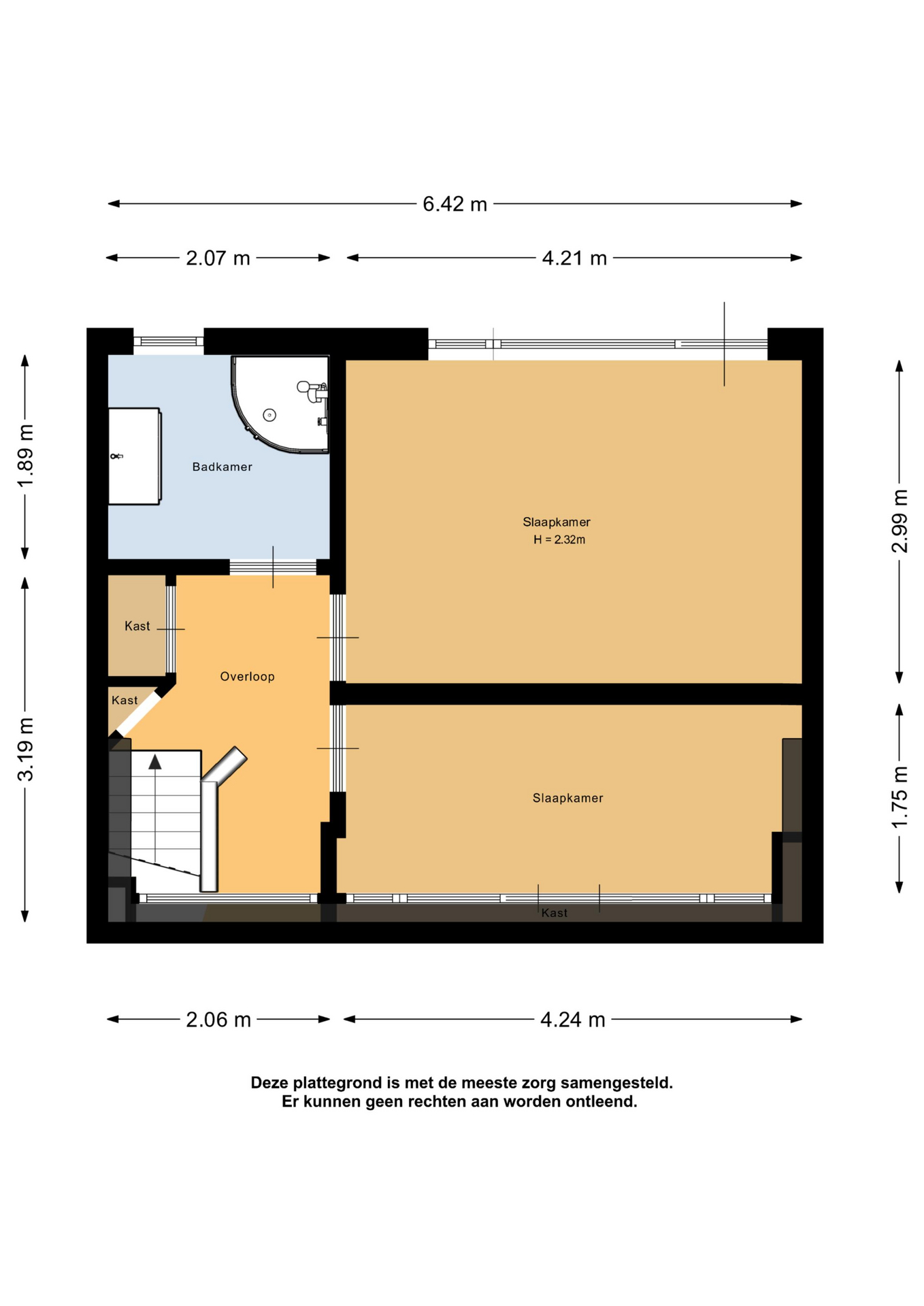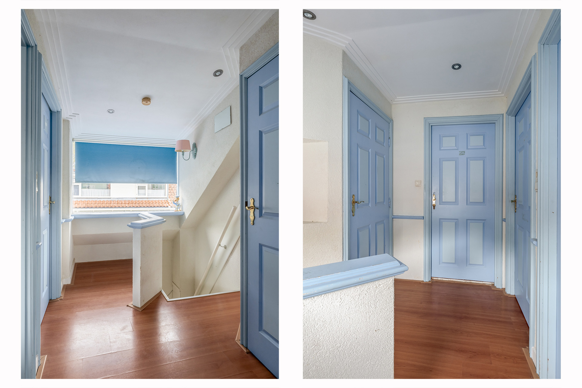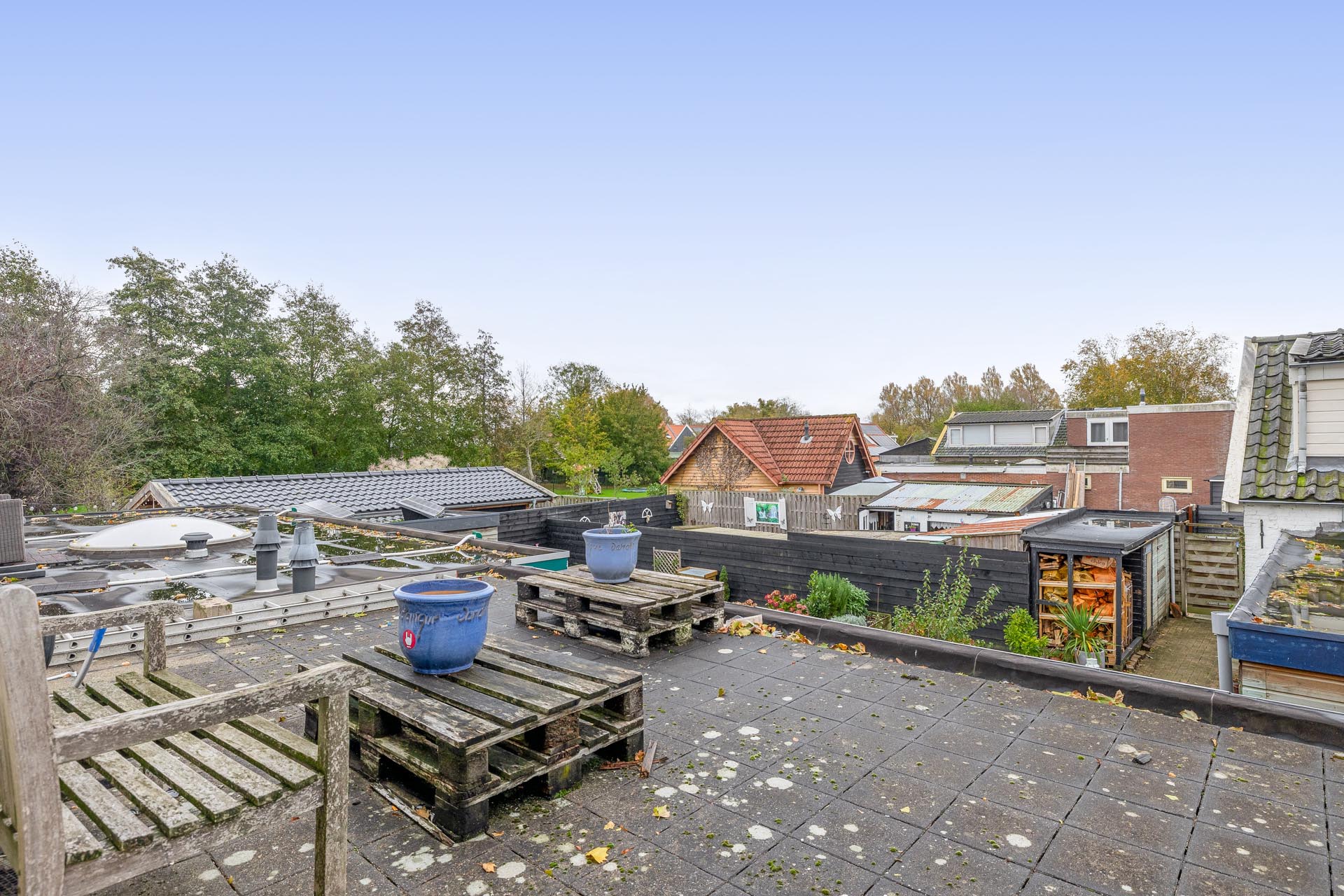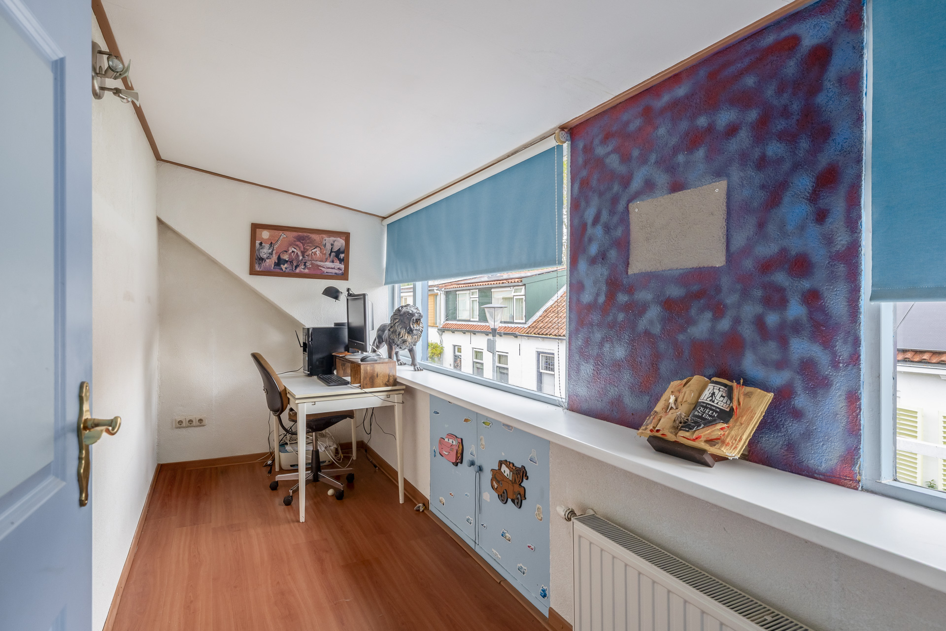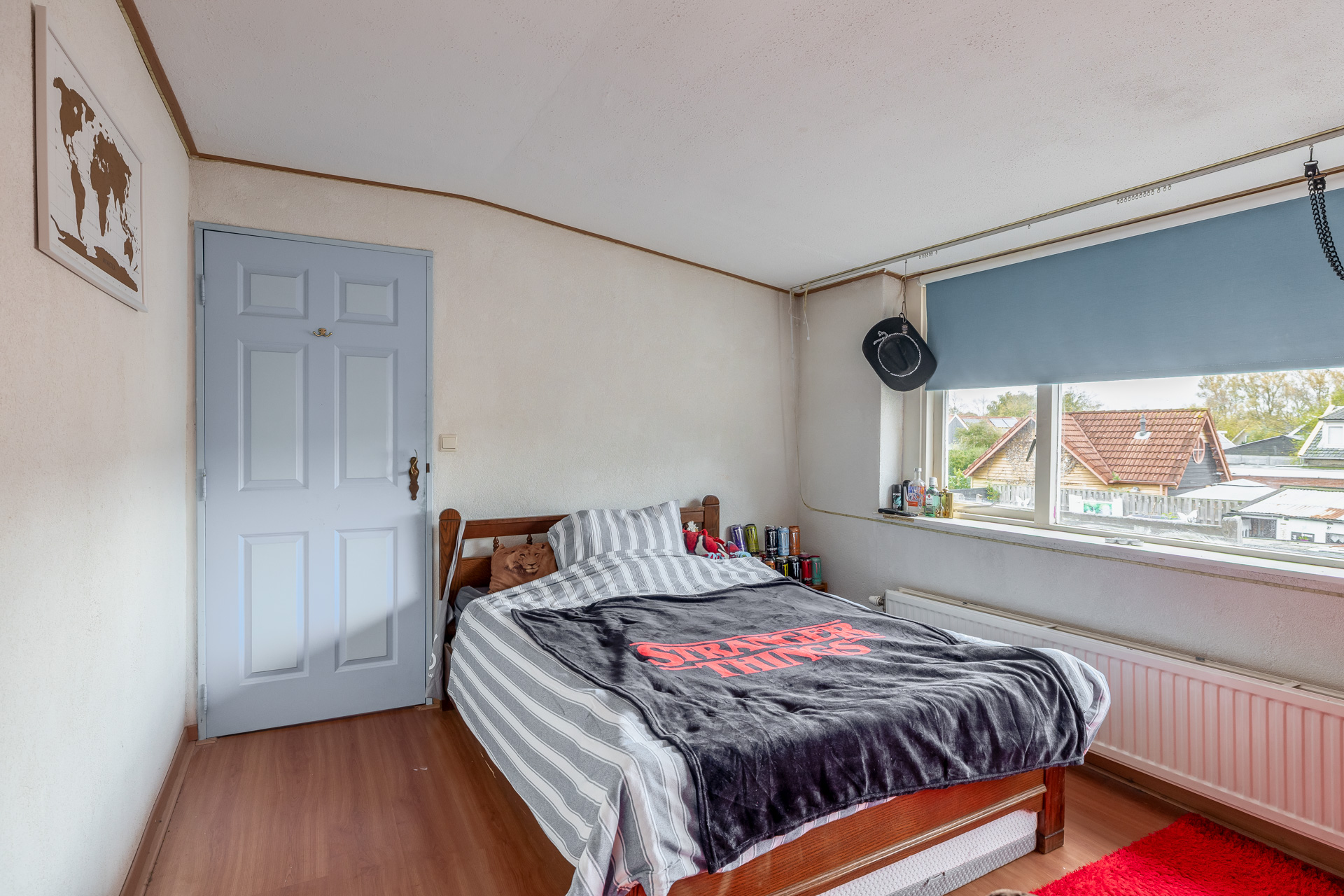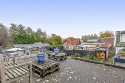 De overloop, met vaste kast, geeft toegang tot twee slaapkamers en de badkamer. De slaapkamer aan de voorzijde is extra ruim dankzij de dakkapel. De slaapkamer aan de achterzijde heeft toegang tot het platte dak – perfect voor wie droomt van een toekomstig dakterras! De geheel betegelde badkamer is voorzien van een douche, een wastafel en inbouwspots.