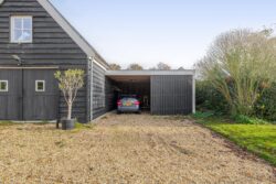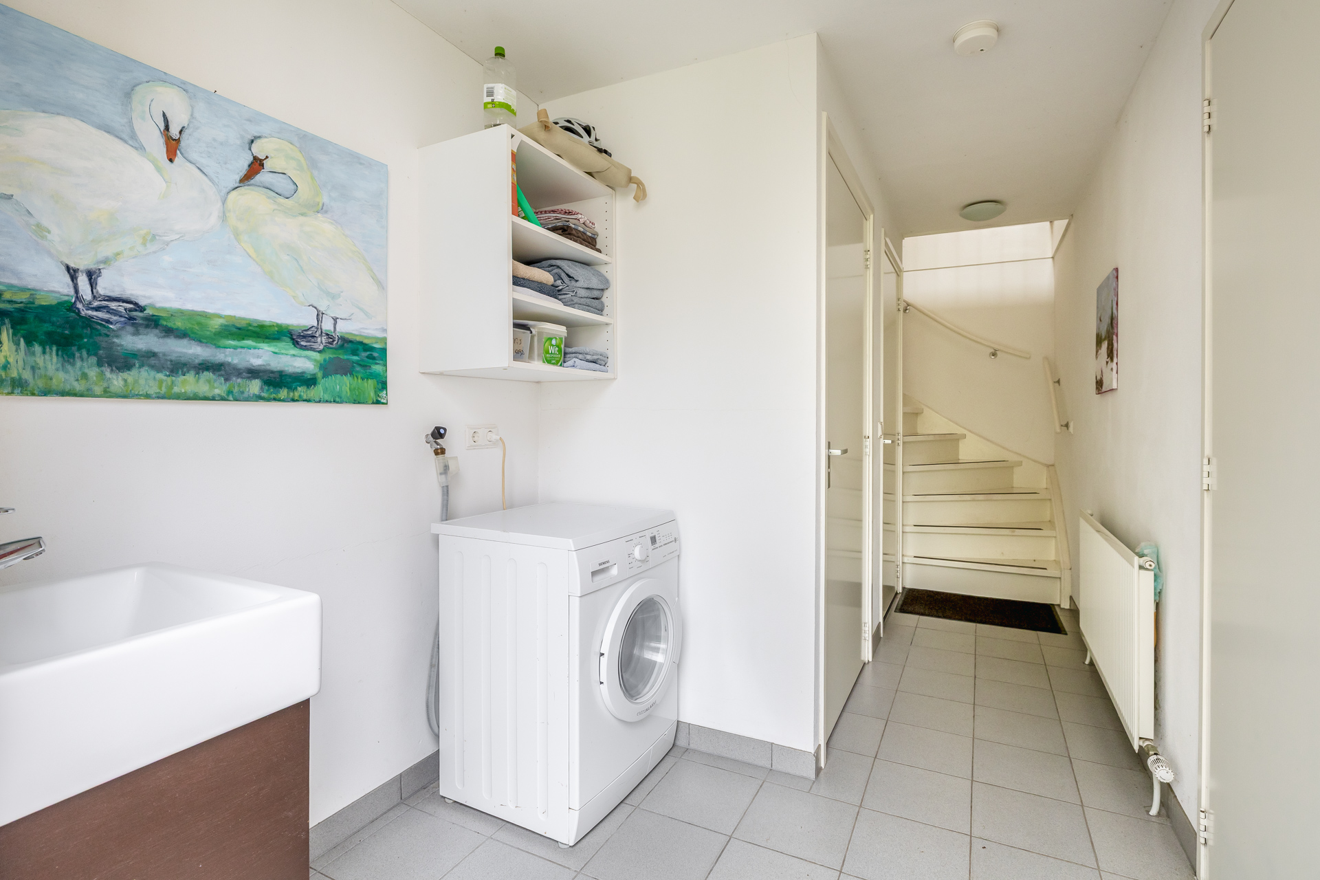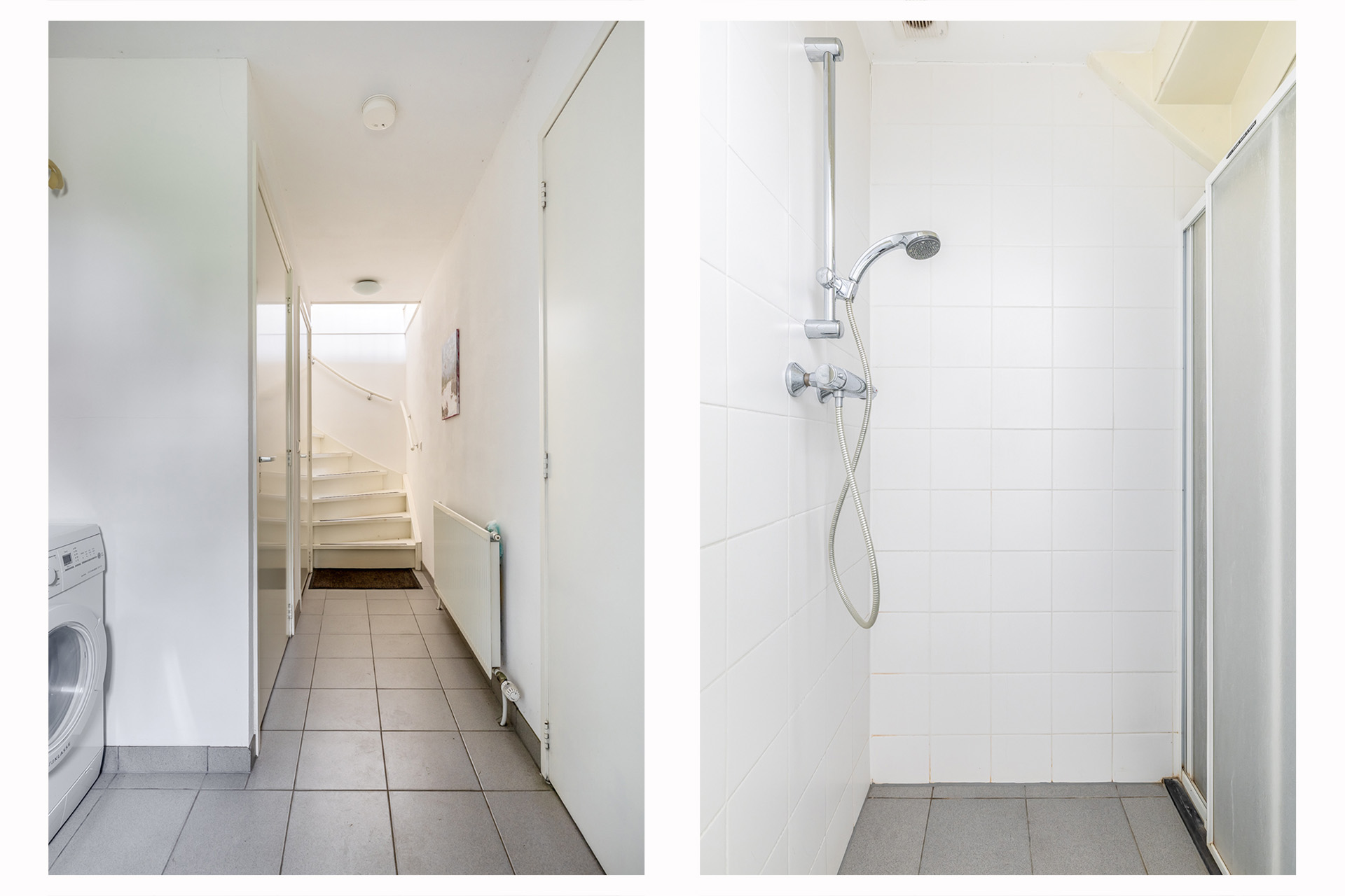 De garage is bereikbaar via de lange oprit en voorzien van openslaande deuren. Ideaal voor het stallen van een auto, caravan of als extra opslagruimte. Aan de achterzijde bevindt zich een entree met hal, badkamer, toilet, wastafel en witgoedaansluitingen. Vanuit hier heeft u toegang tot de tuin en de verdieping. Naast de garage is een ruime carport.